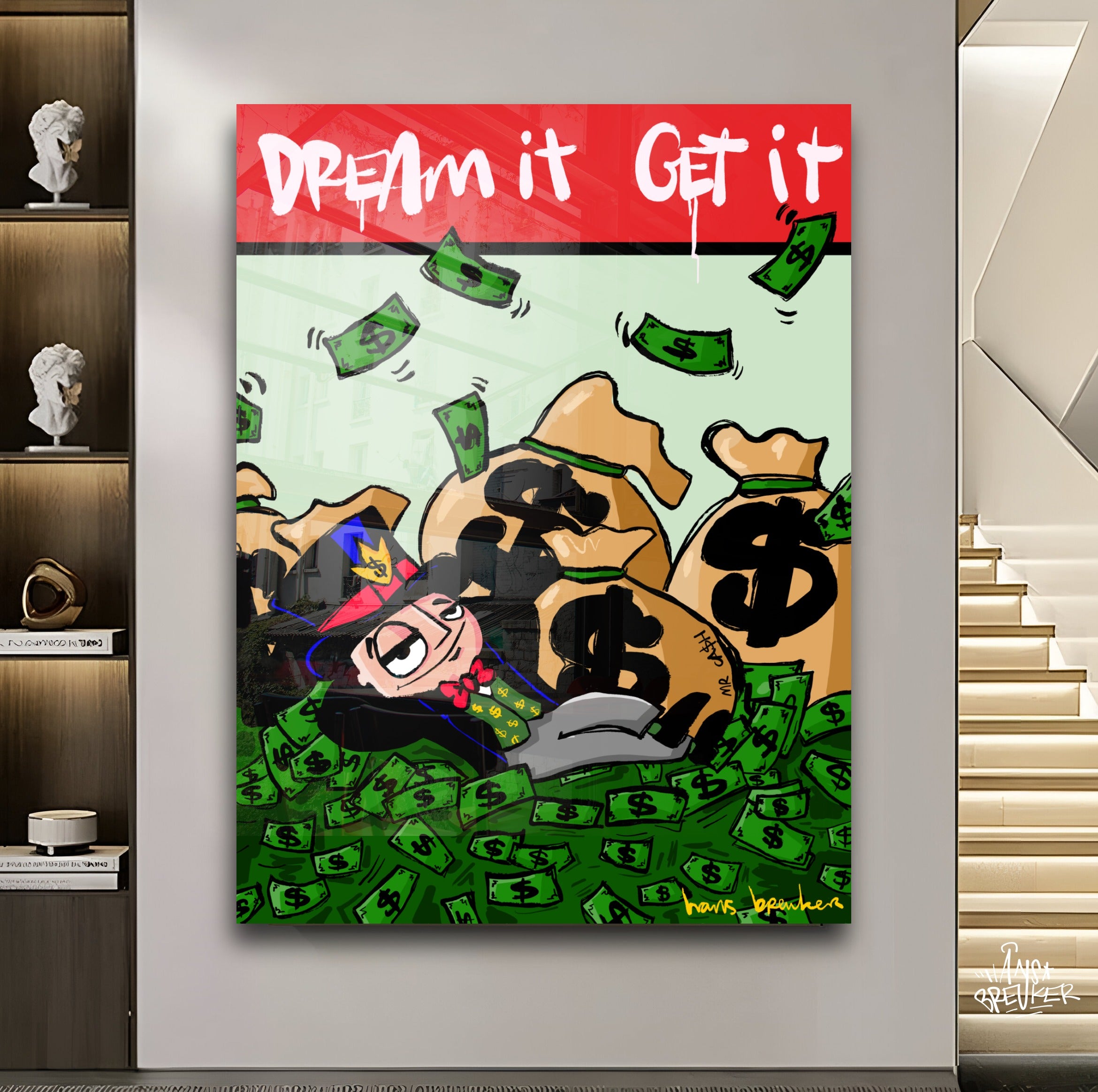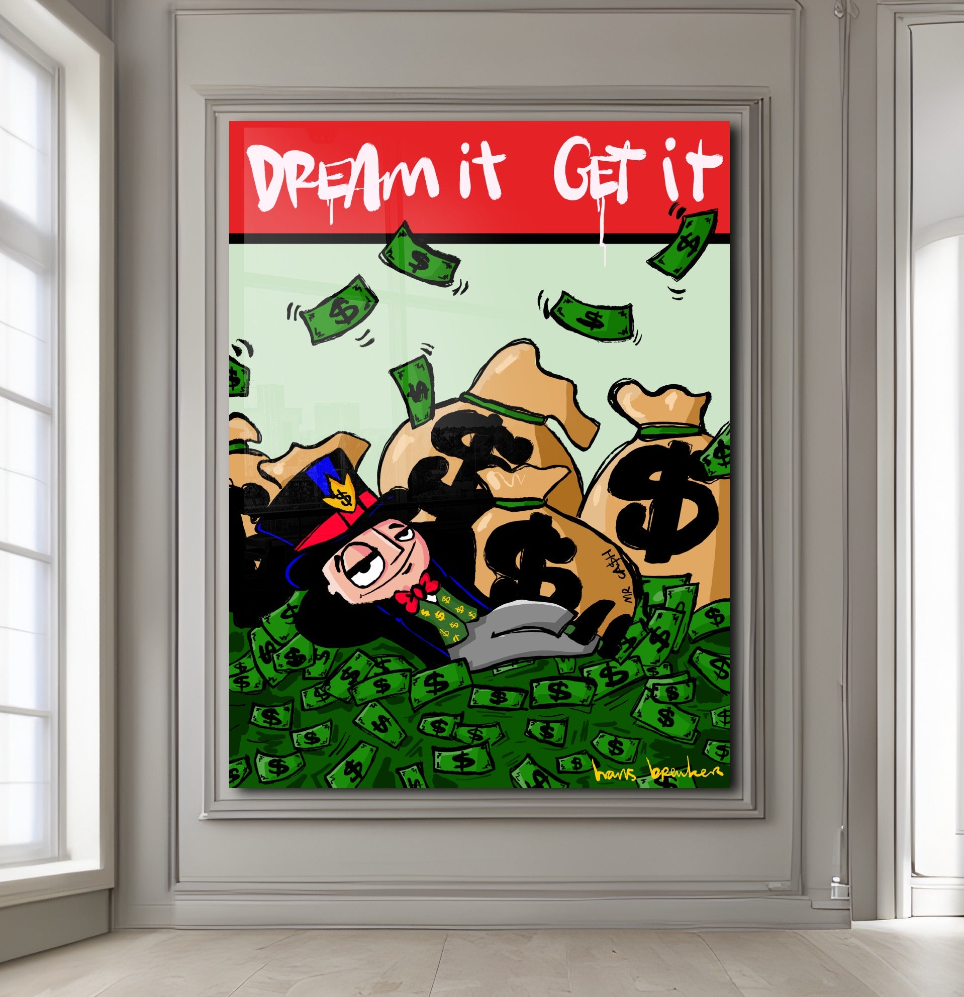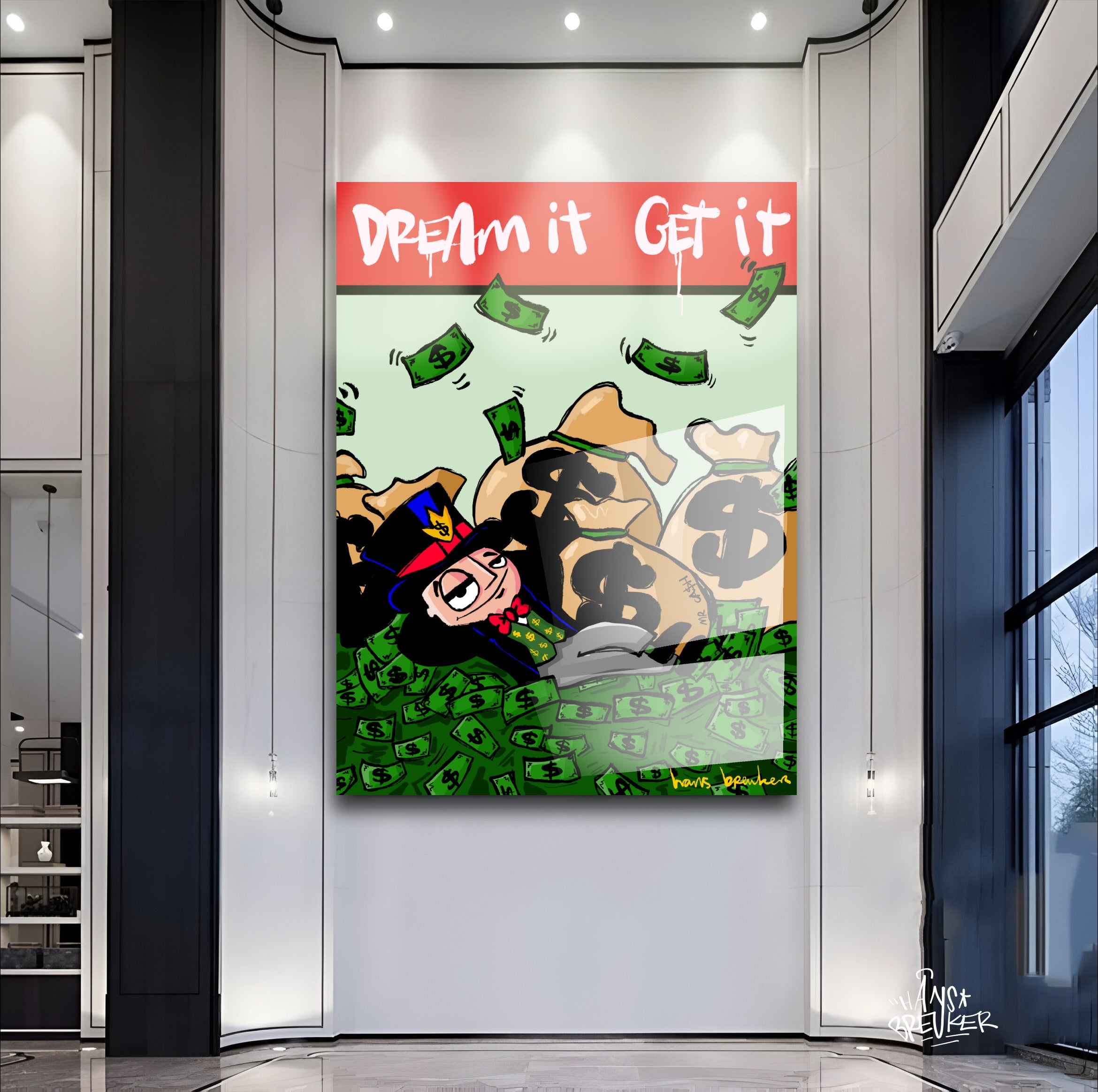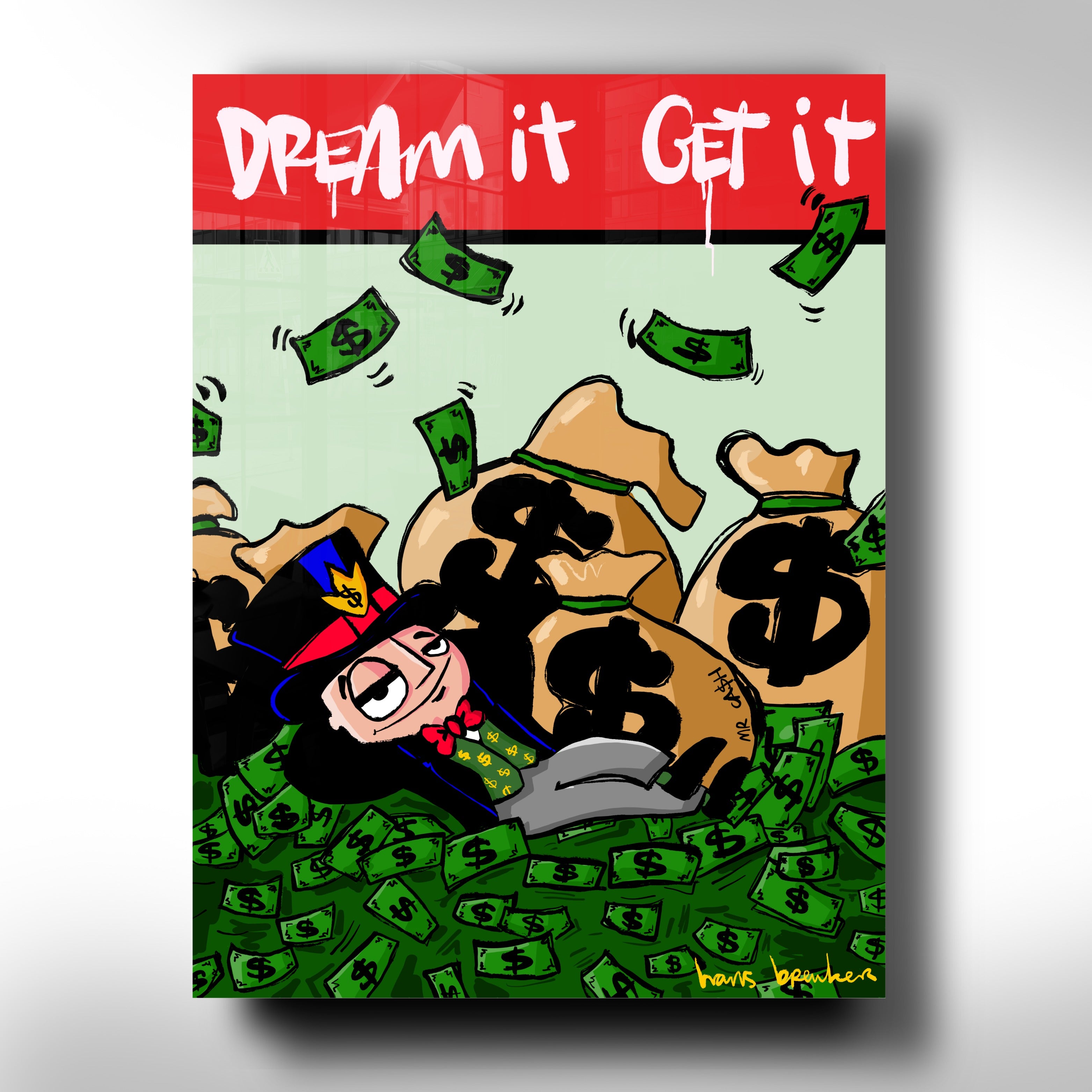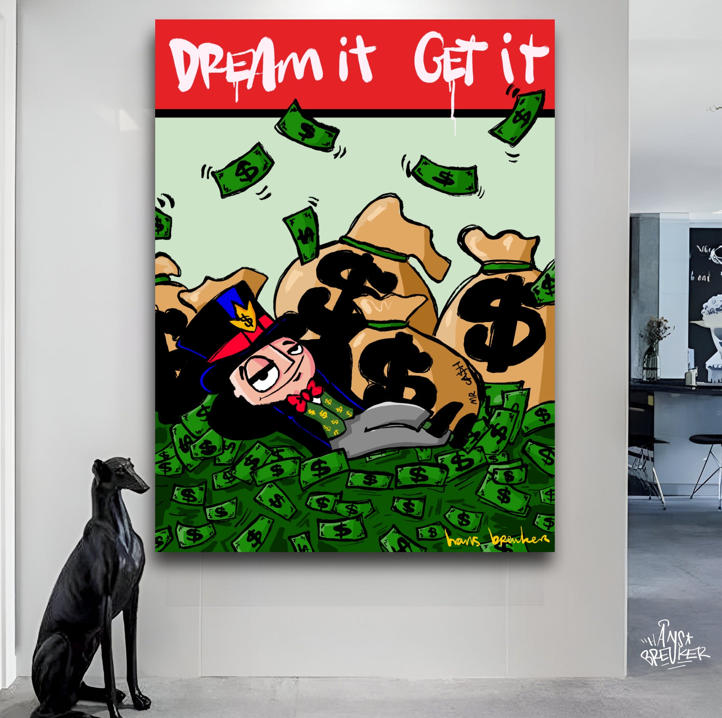 In this work, Hans Breuker shows what happens when you dare to dream big—and that dreams aren't about butterflies and philosophy, but hard cash. Mr. Cash lies nonchalantly amidst mountains of cash, pockets full of dollars around him, while the text at the top of the stage sounds clear and almost sarcastic: Dream it. Achieve it.