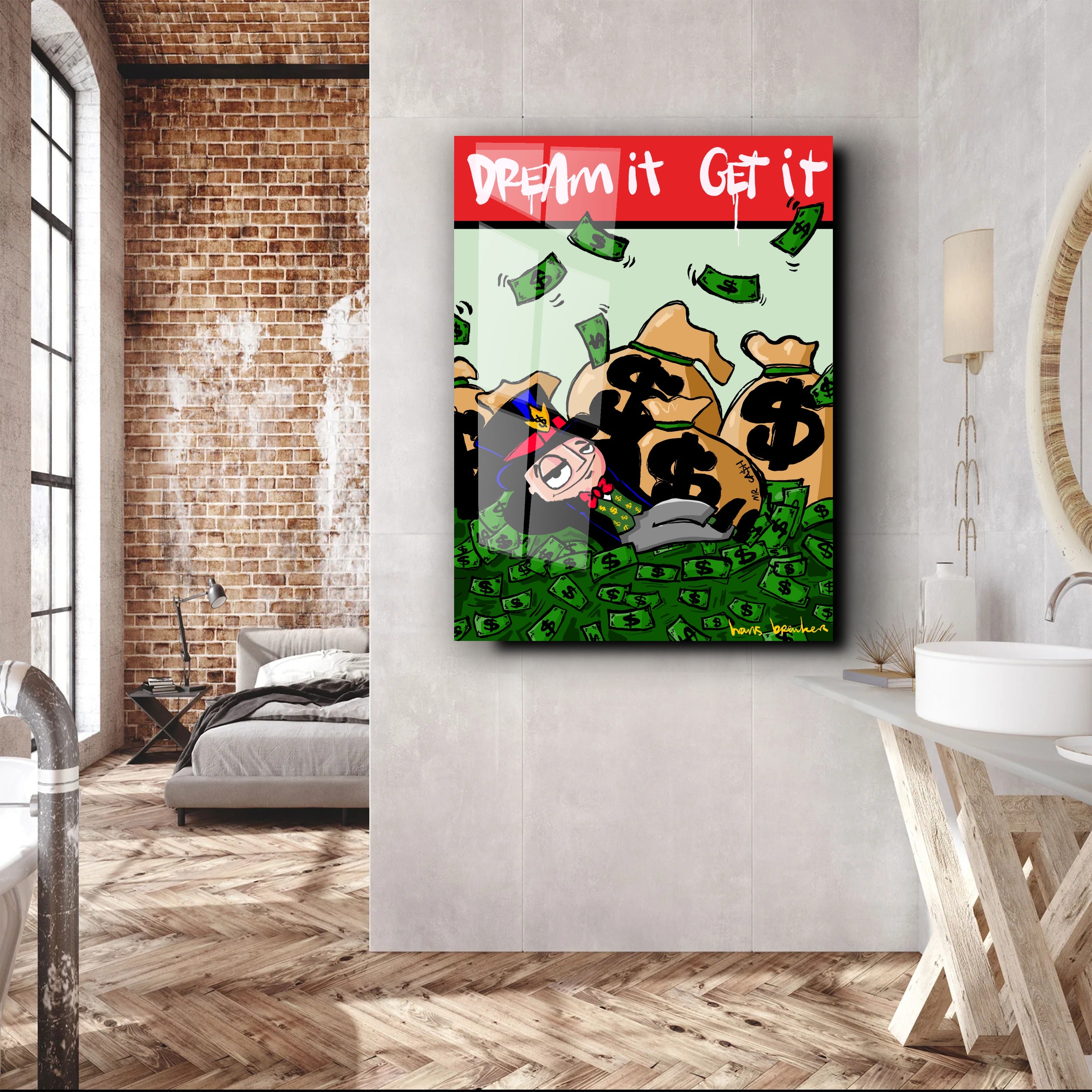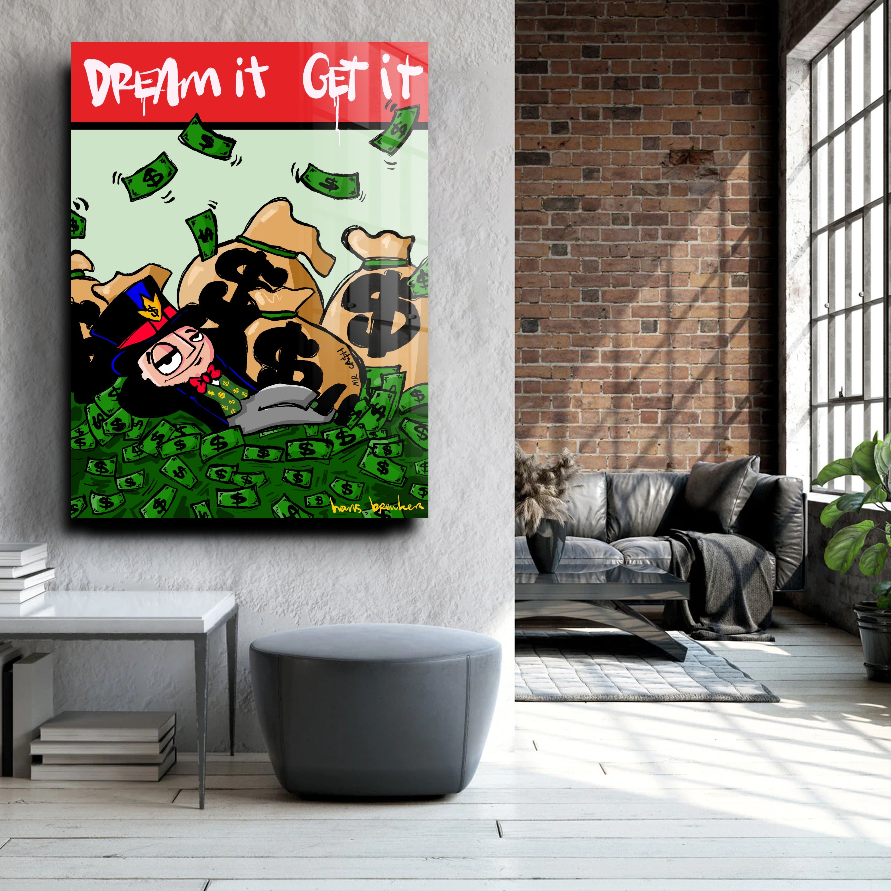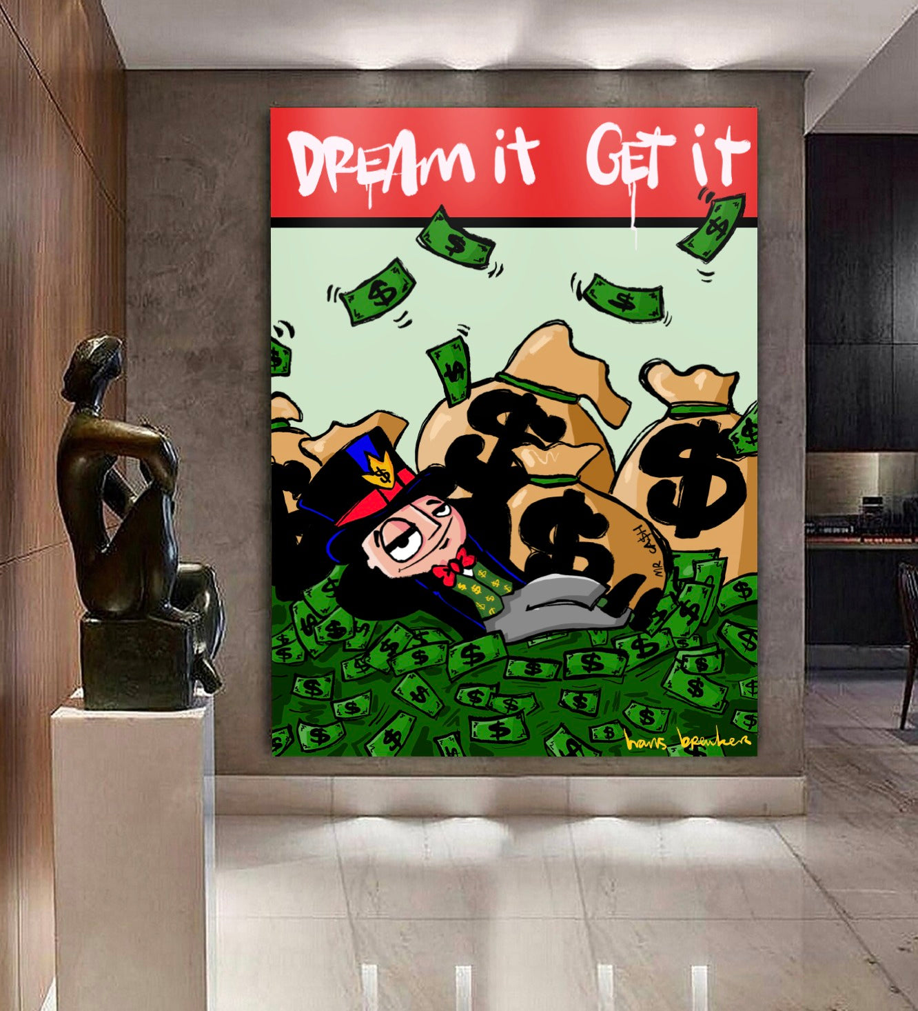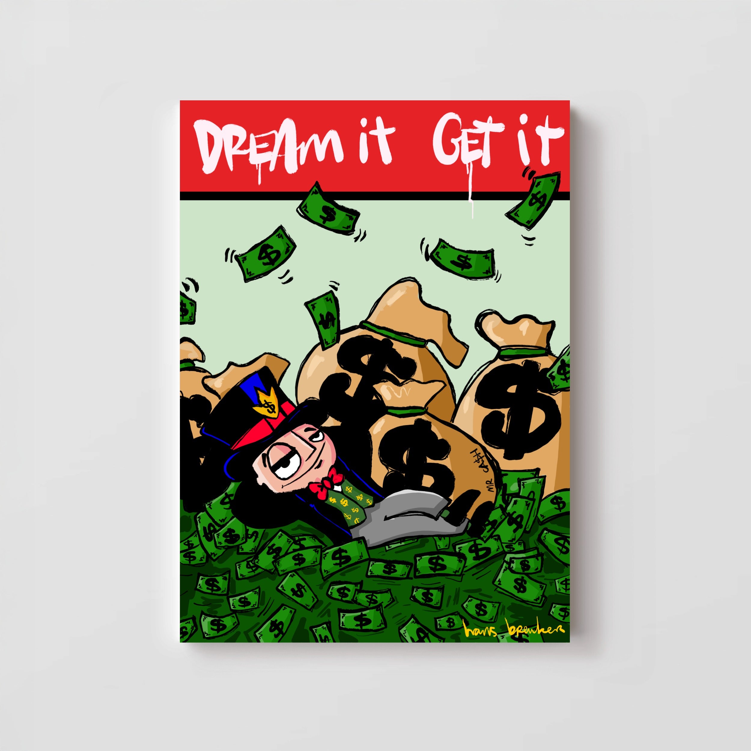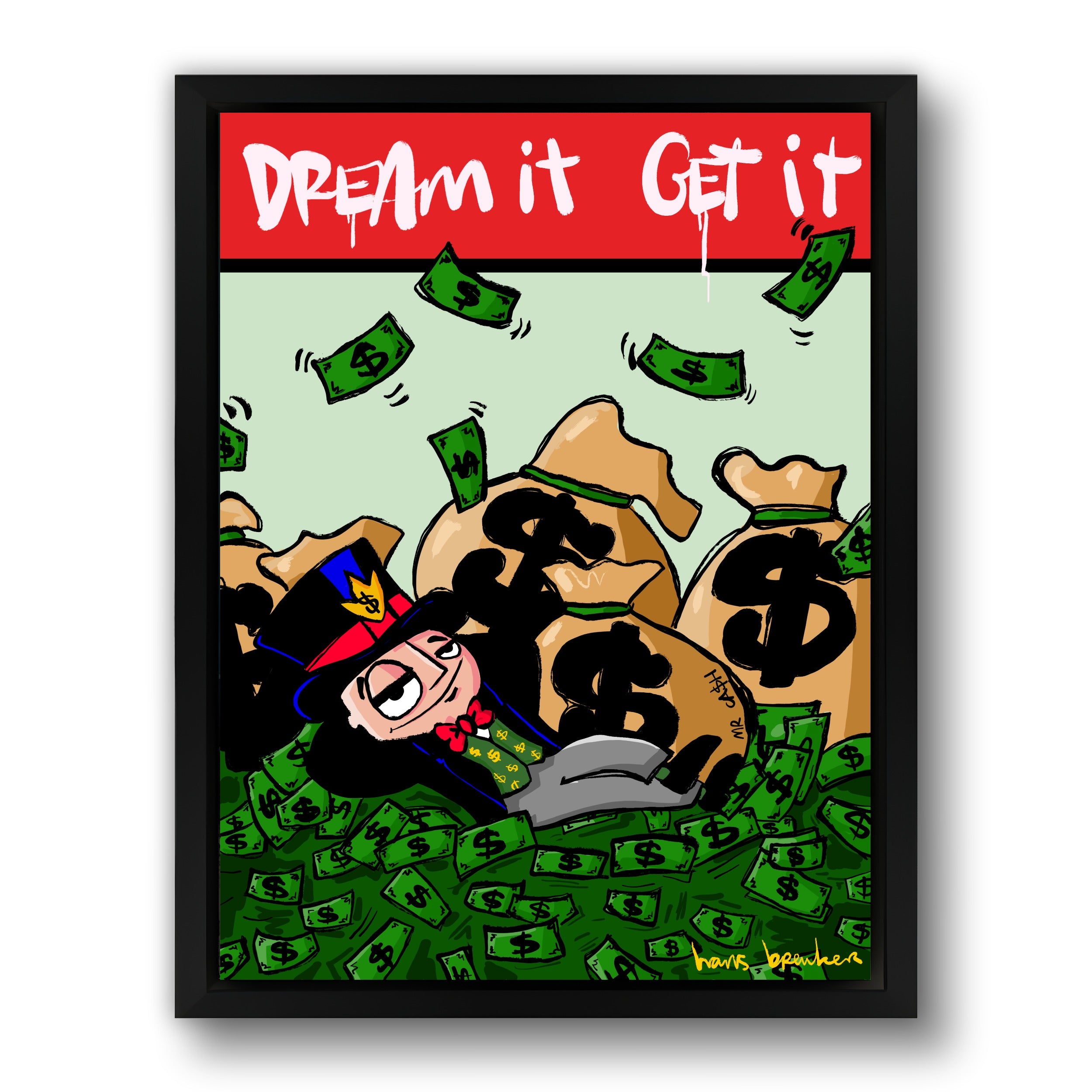 In this work, Hans Breuker shows what happens when you dare to dream big—and that dreams aren't about butterflies and philosophy, but hard cash. Mr. Cash lies nonchalantly amidst mountains of cash, pockets full of dollars around him, while the text at the top of the stage sounds clear and almost sarcastic: Dream it. Achieve it.