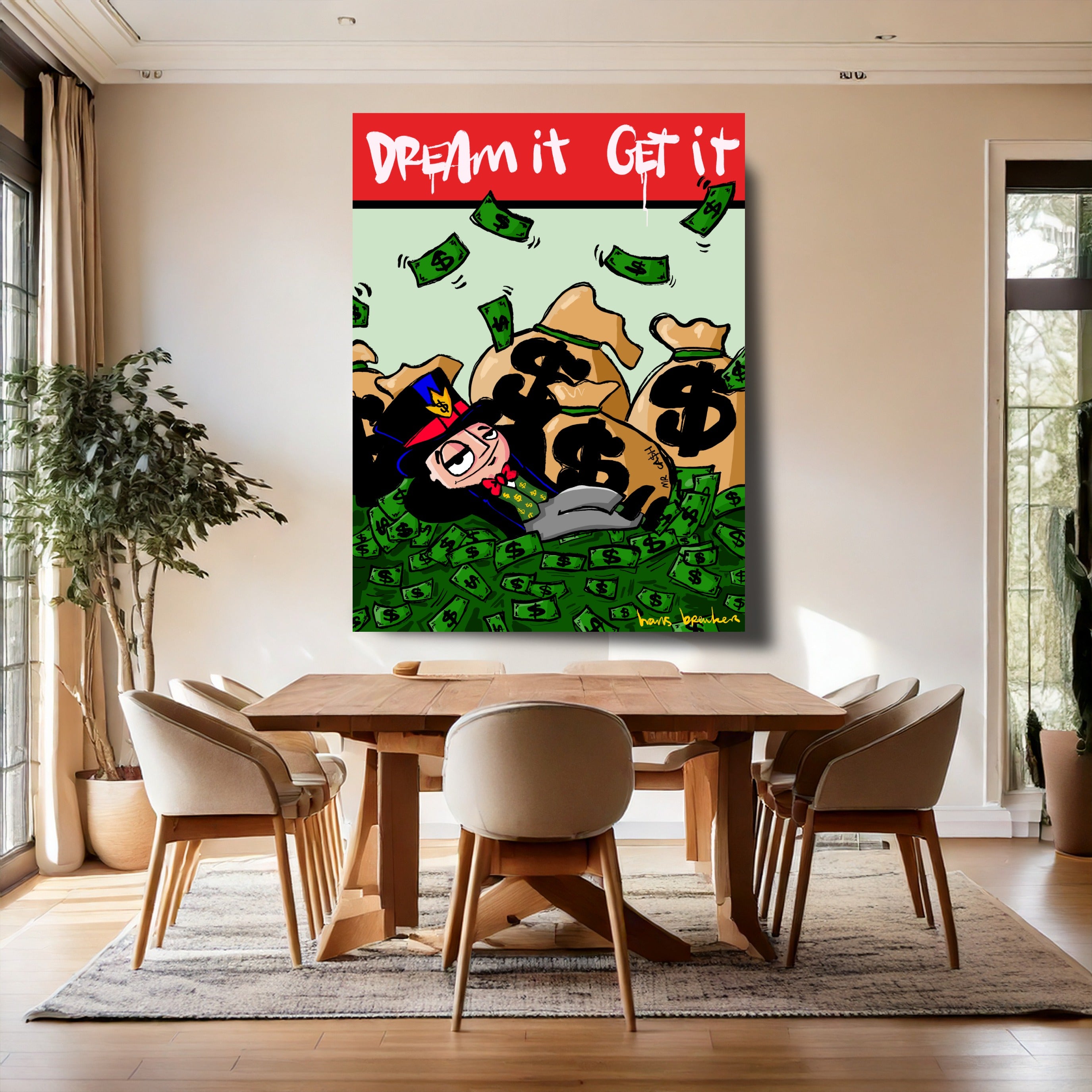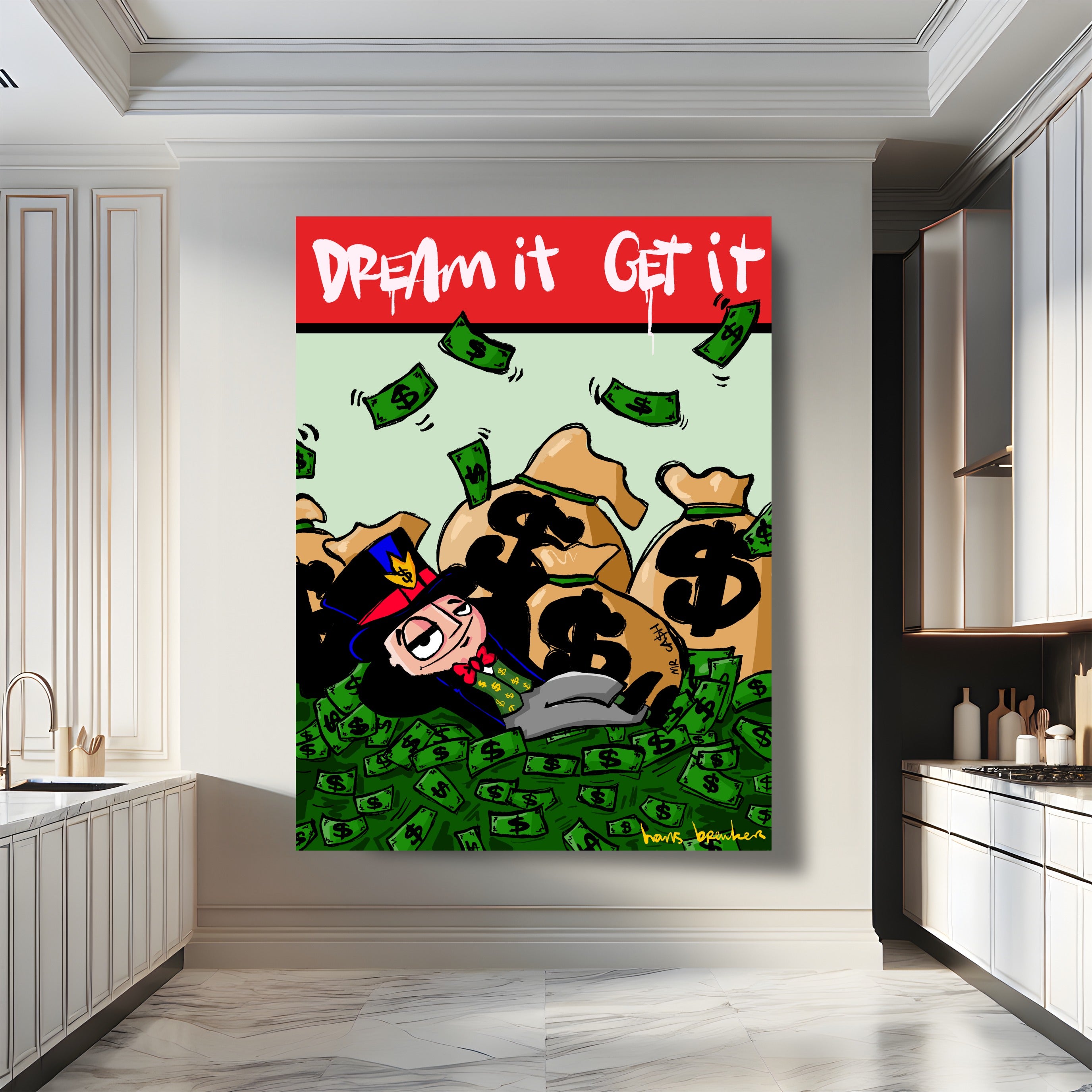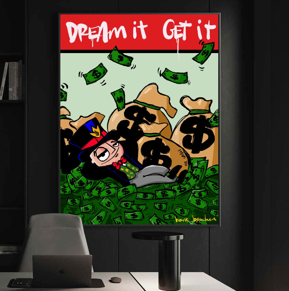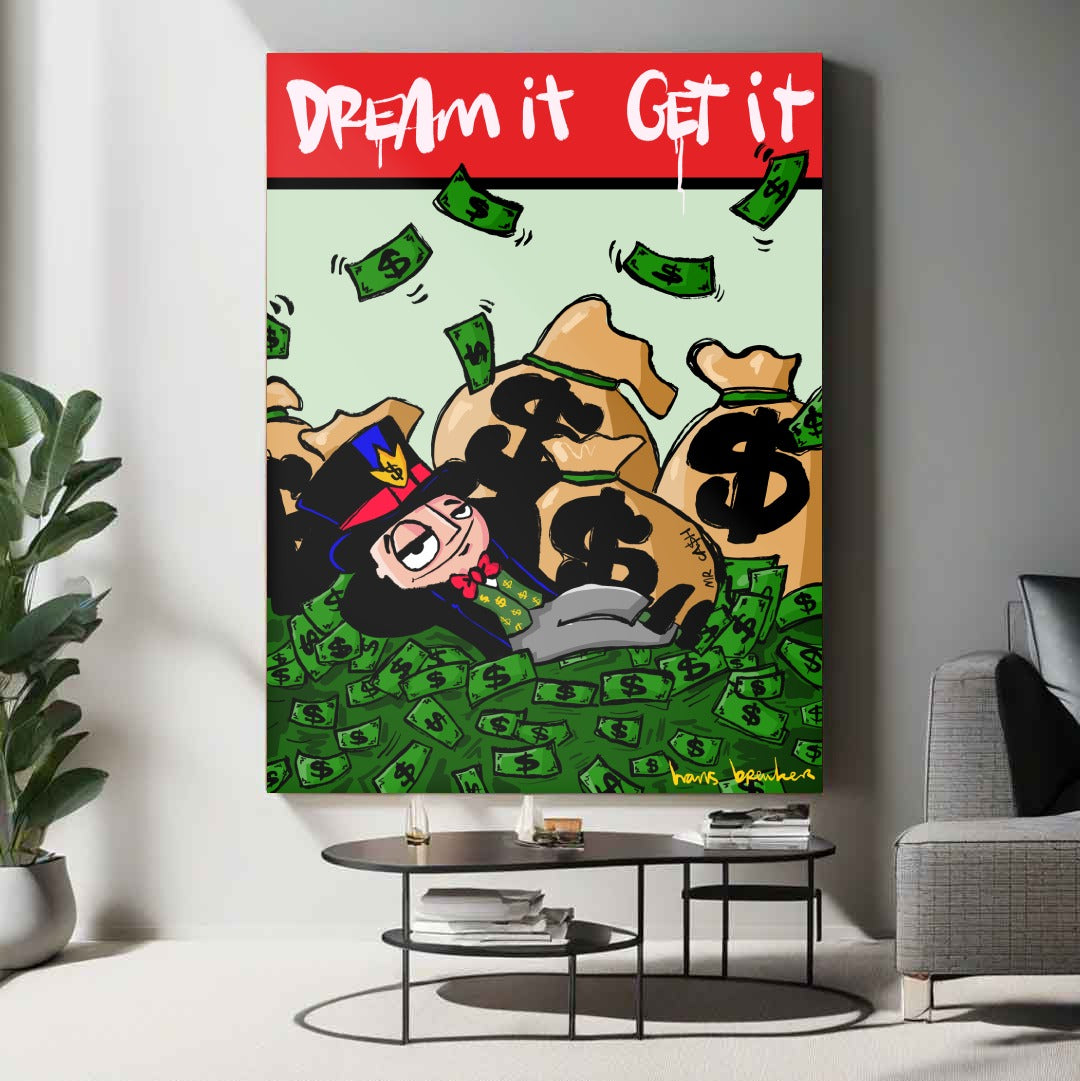 The message seems simple, but it's hidden beneath a thick layer of irony. This isn't a "motivational poster" for above your bed—or maybe it is, but with a wink. Mr. Cash has achieved his dream, but his expression already gives it away: wealth here is more routine than fulfillment.
