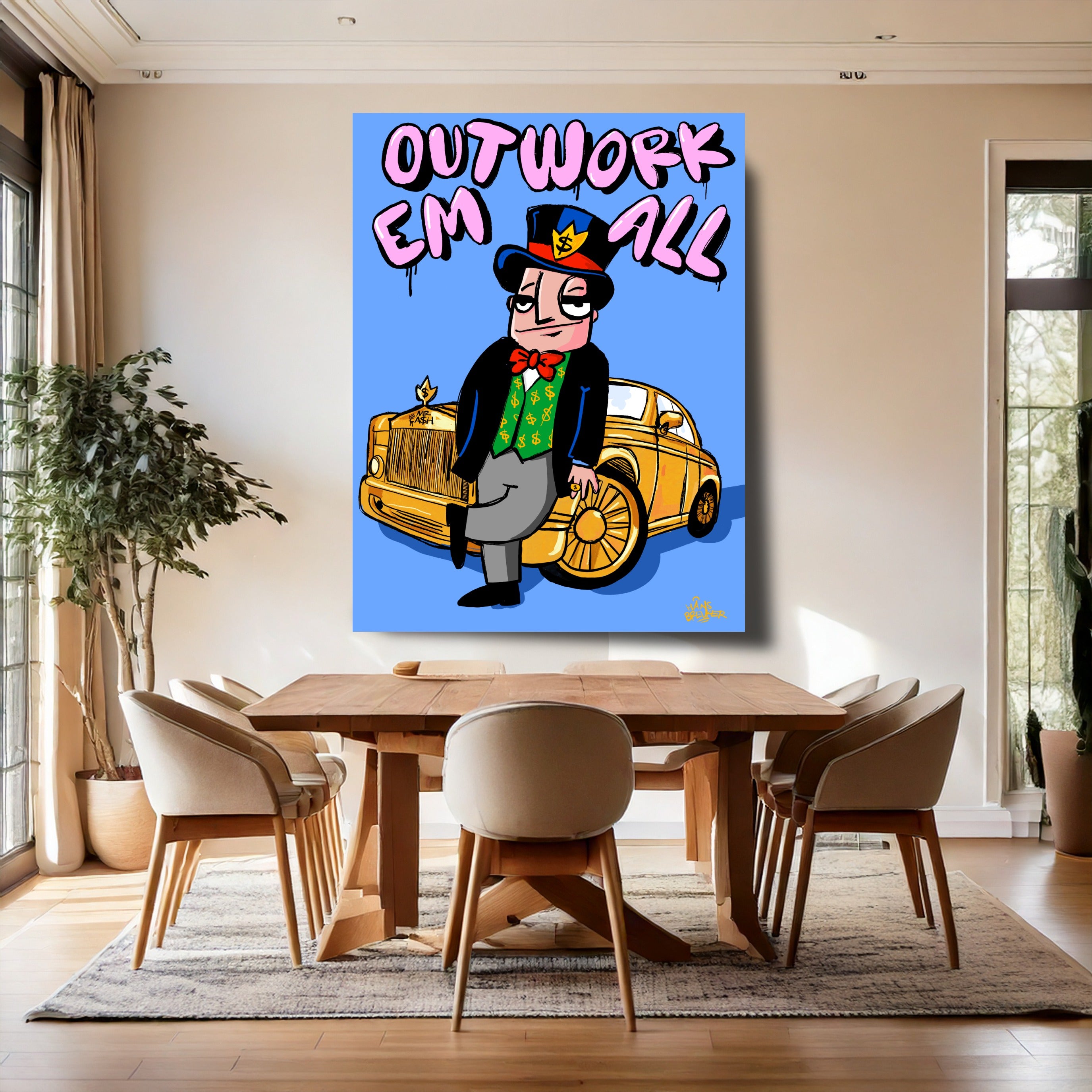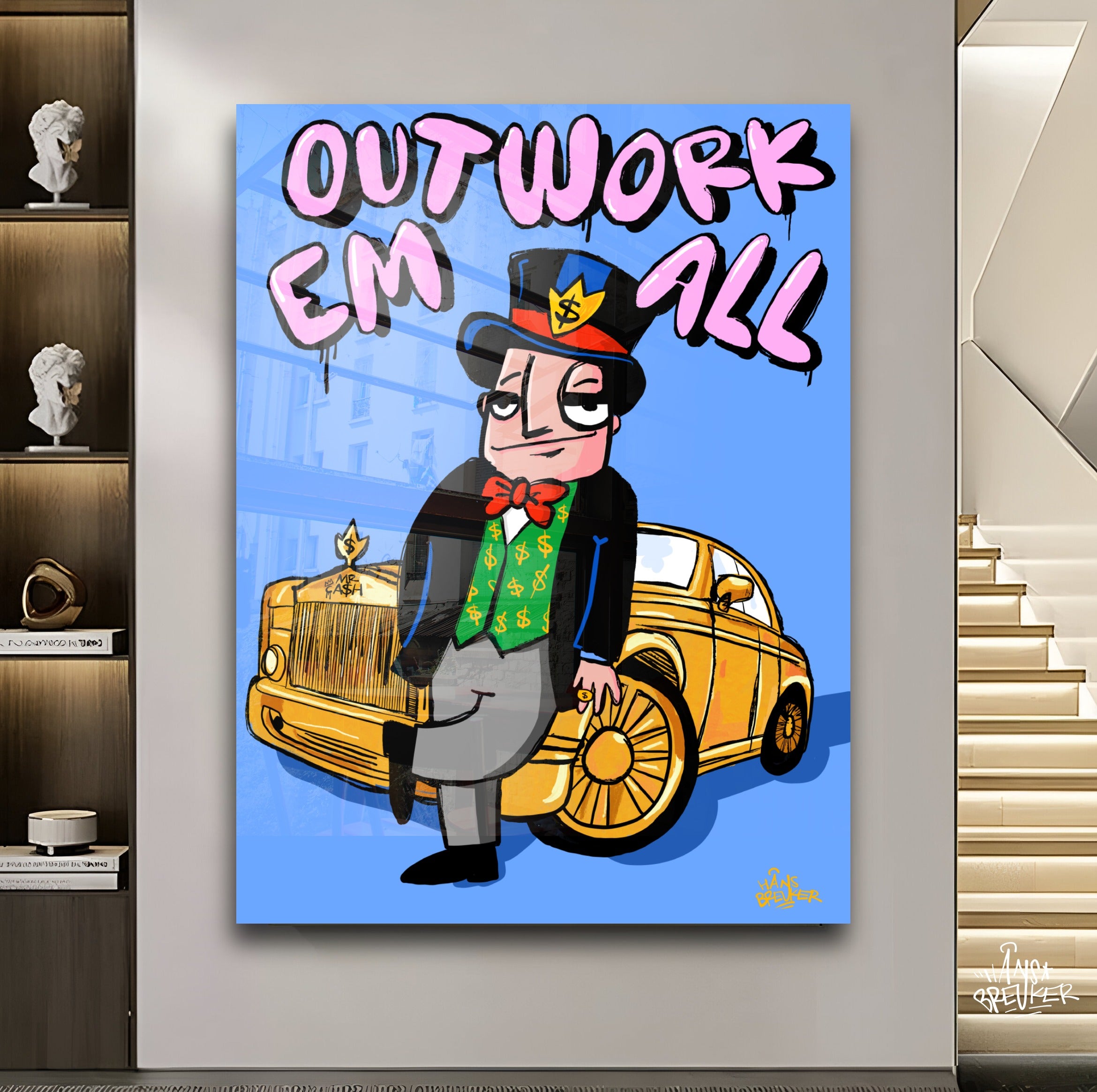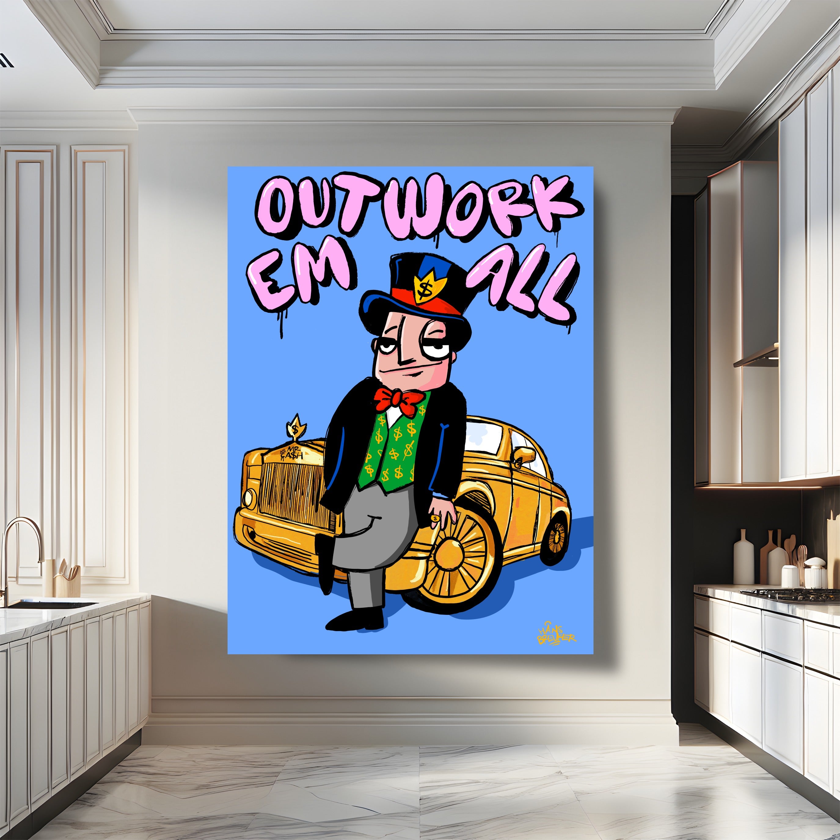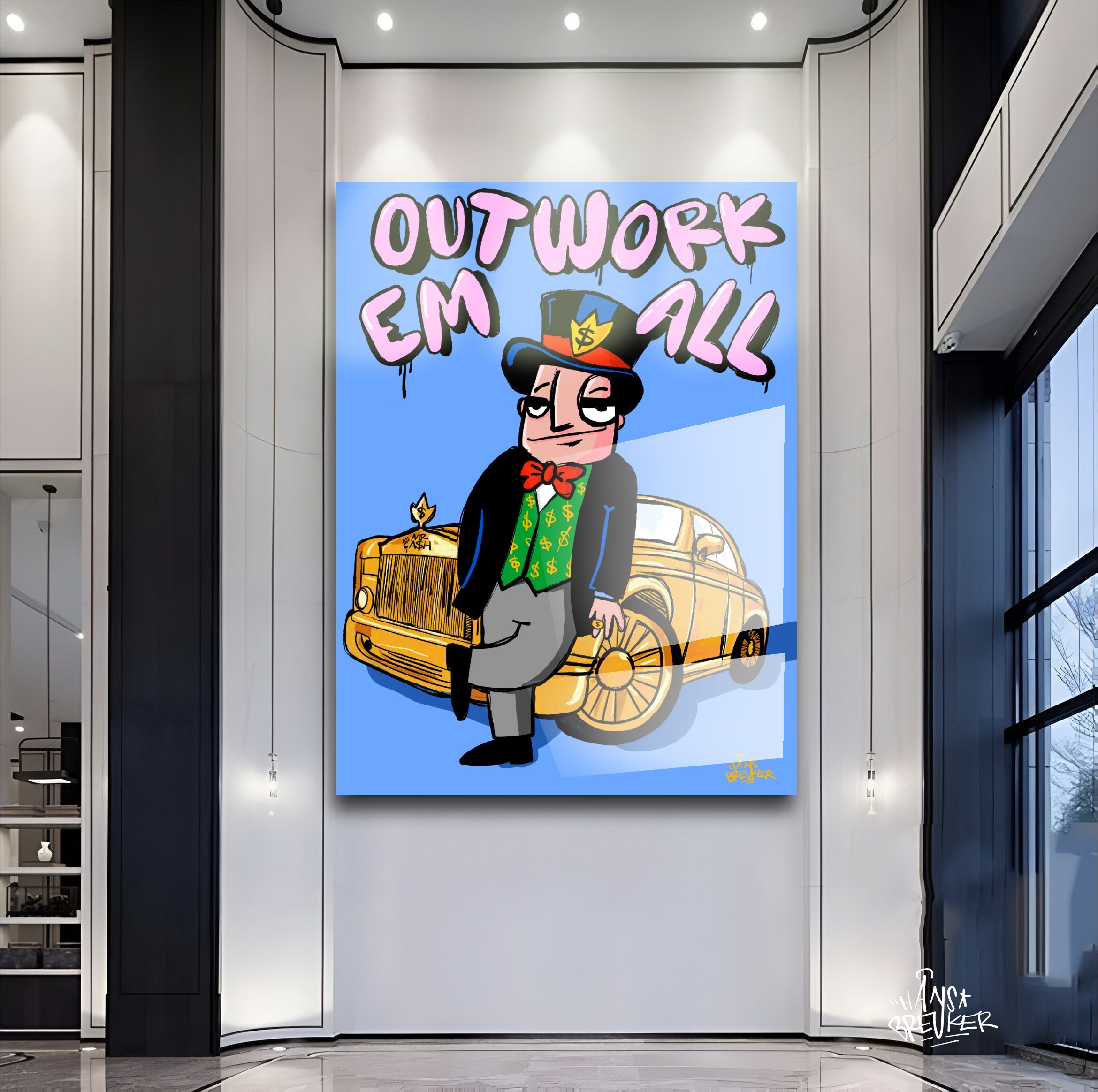 In this striking artwork by Hans Breuker, the confident Mr. Cash takes center stage. With his nonchalant pose, bright pink quote, and sparkling gold Rolls Royce, he embodies style, ambition and courageHis message is clear: Outwork 'Em All