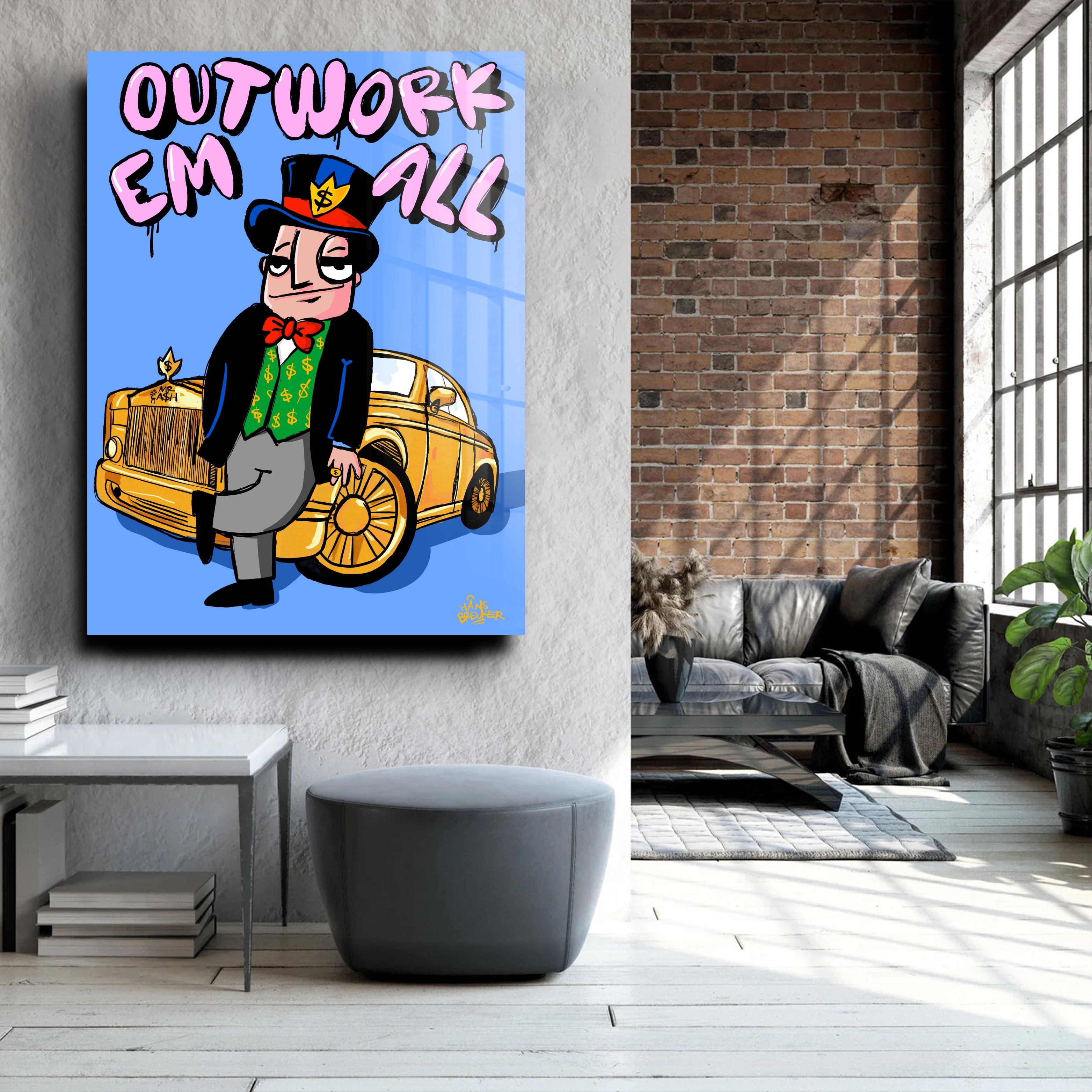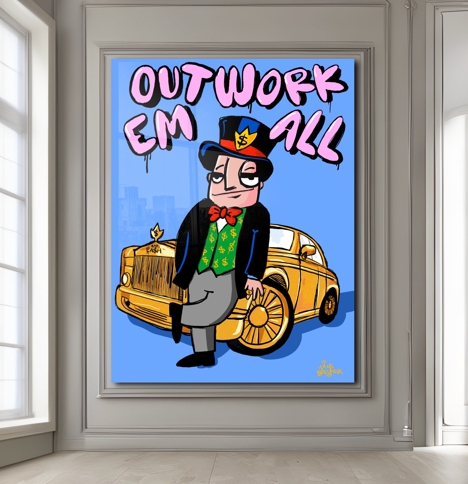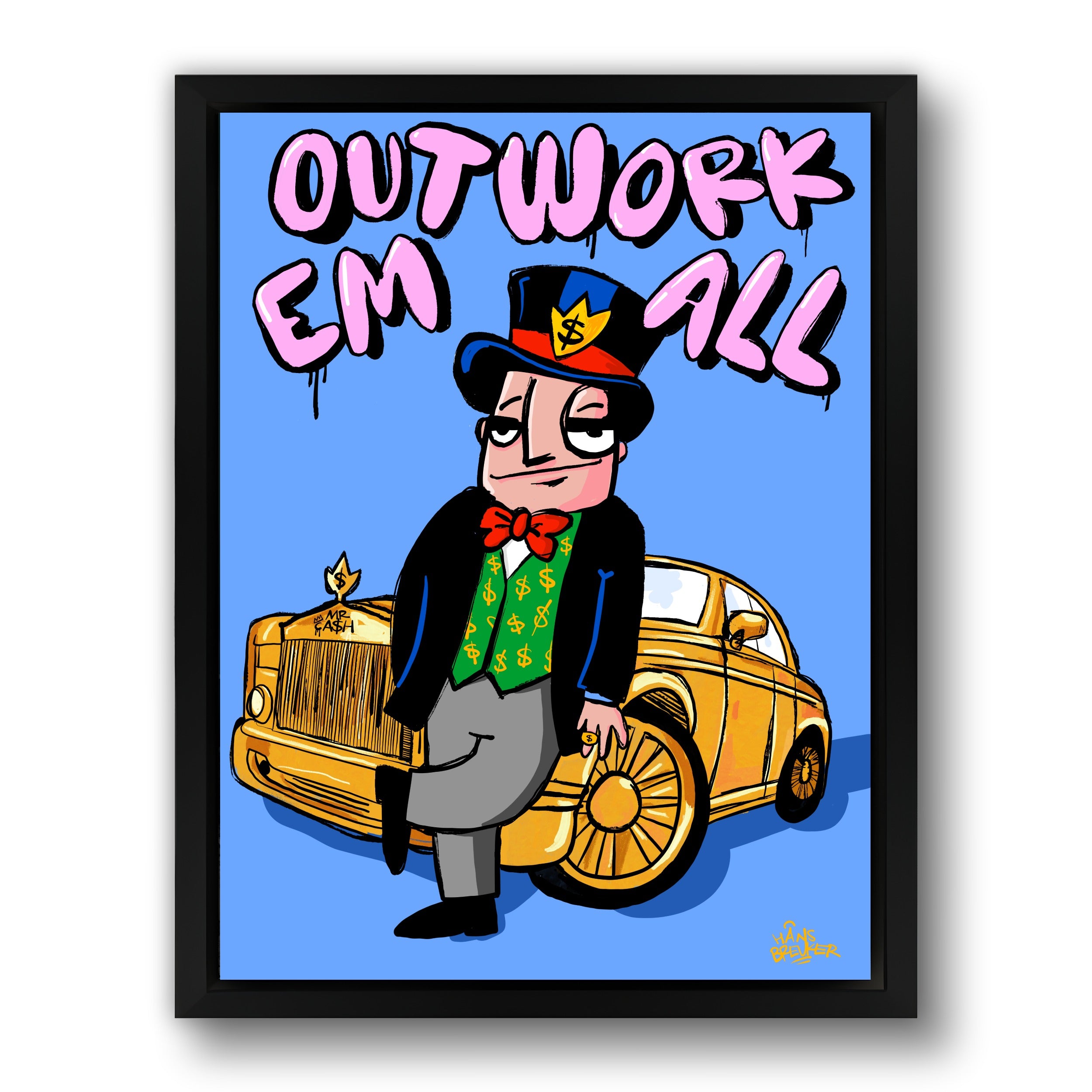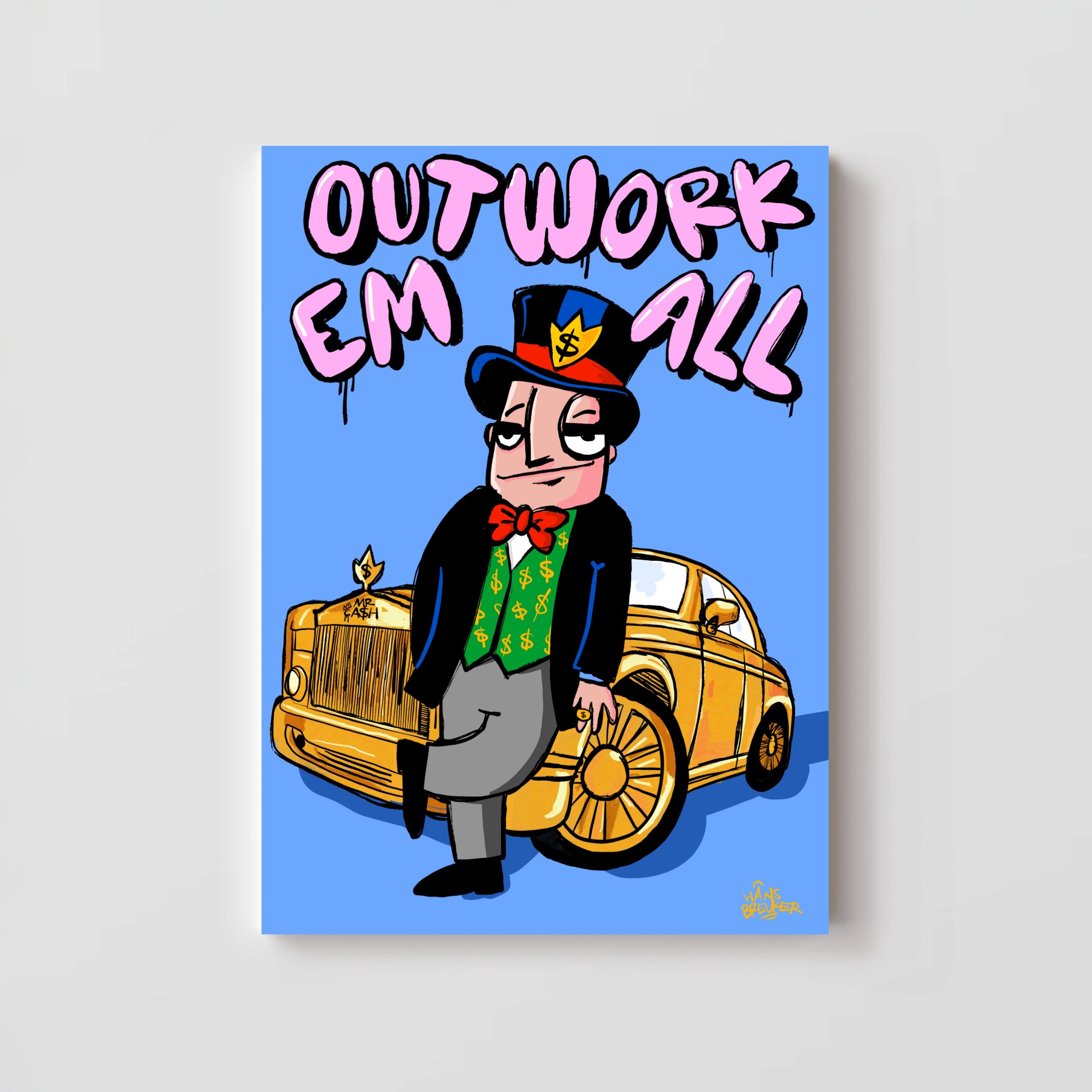 In this striking artwork by Hans Breuker, the confident Mr. Cash takes center stage. With his nonchalant pose, bright pink quote, and sparkling gold Rolls Royce, he embodies style, ambition and courageHis message is clear: Outwork 'Em All