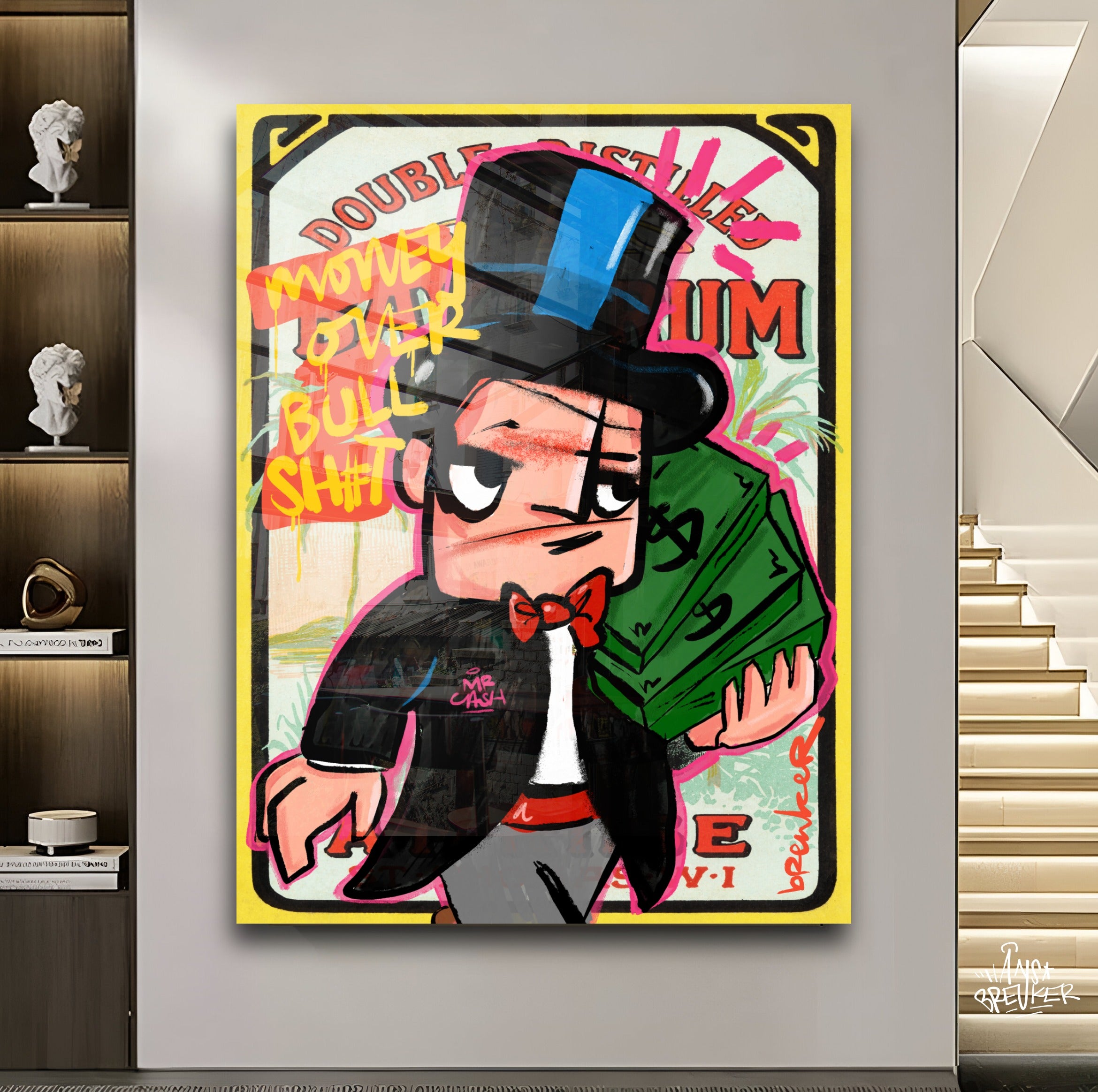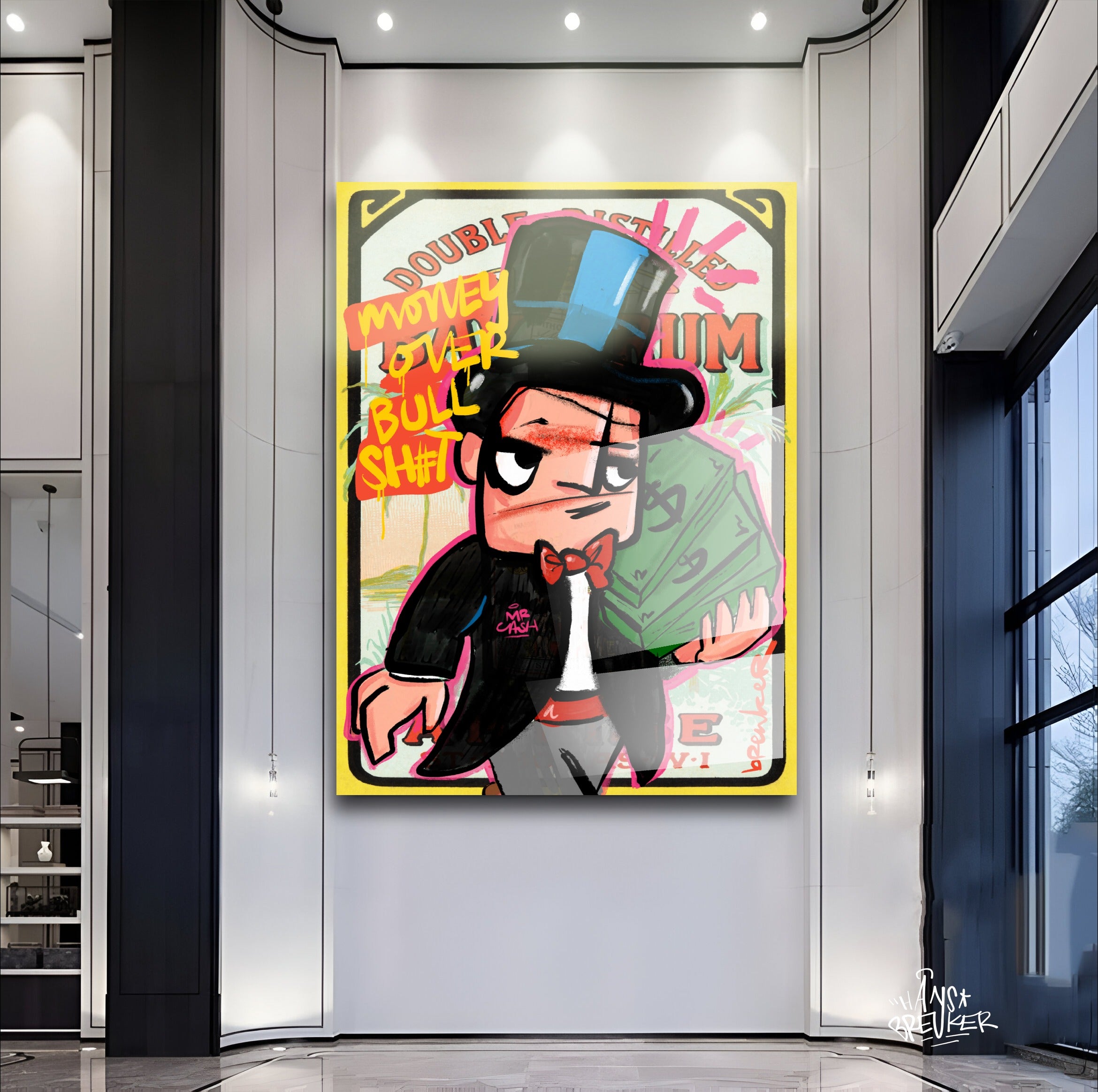 My plexiglass works are delivered INCLUDING hanging system. Up to 120 x 80 cm with back frame. Large works with stainless steel spacers ensure stability when the work is hanging.