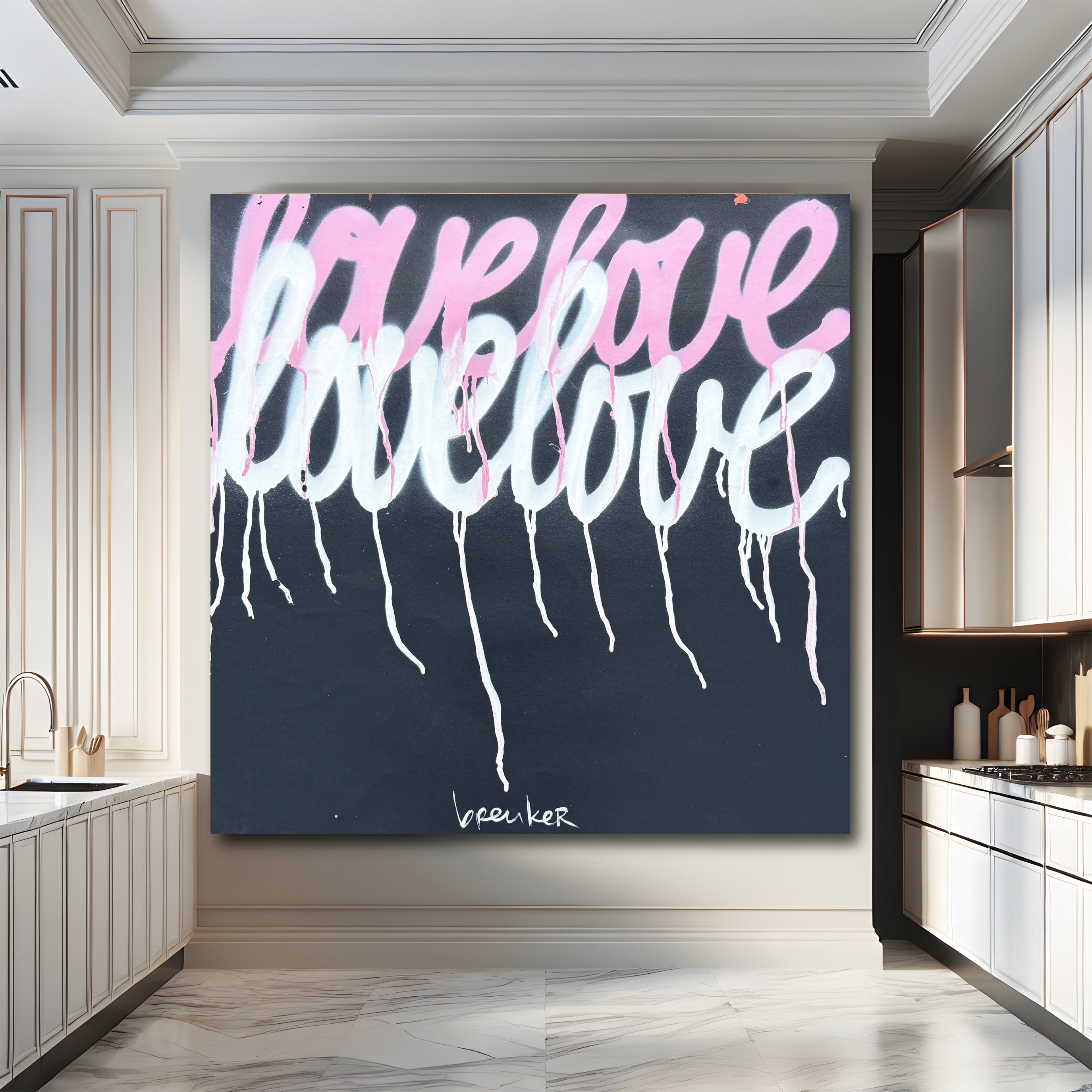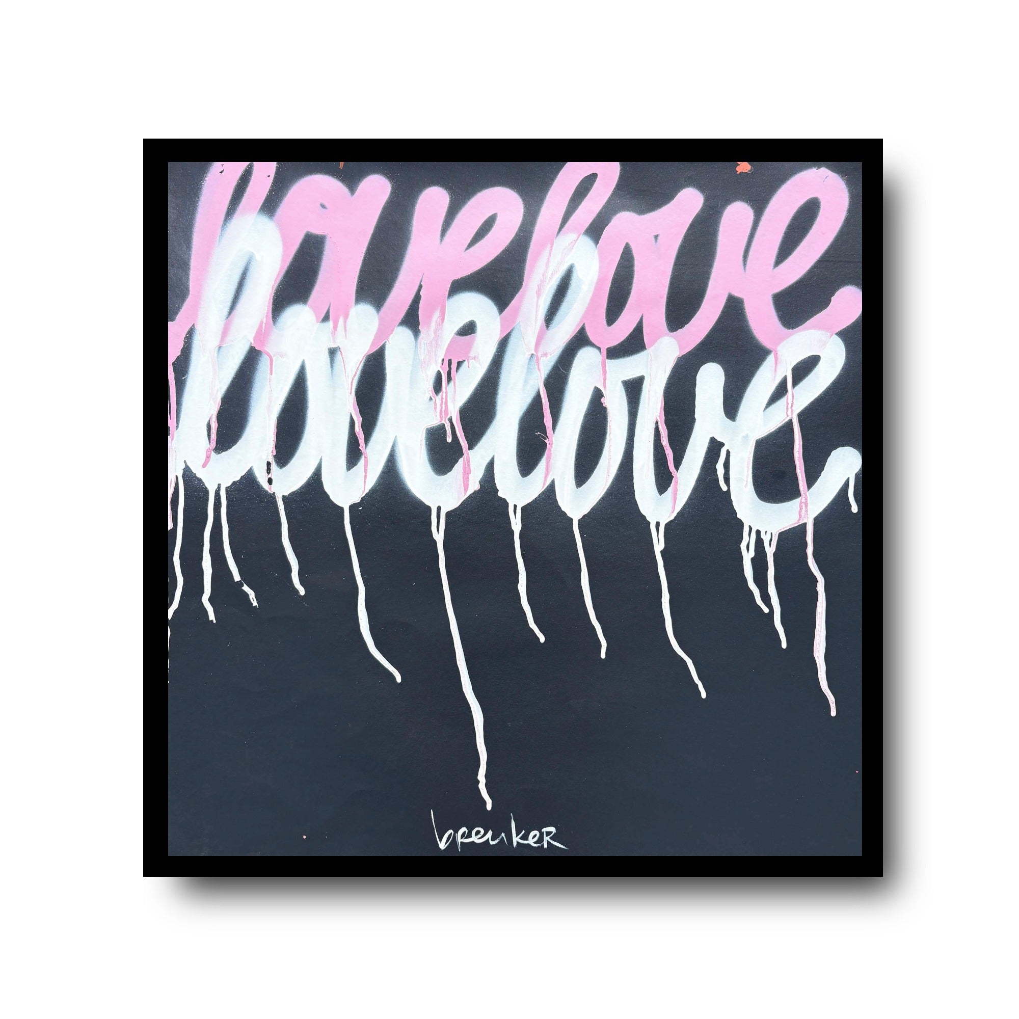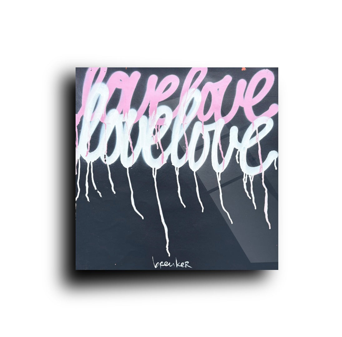 De zachte roze tinten vloeien bijna teder over het doek, vermengd met licht en transparantie. Alsof de woorden voorzichtig zijn neergezet, maar toch blijven nazinderen. De subtiele drips geven het werk iets menselijks: niet perfect, maar echt. Net als liefde zelf.