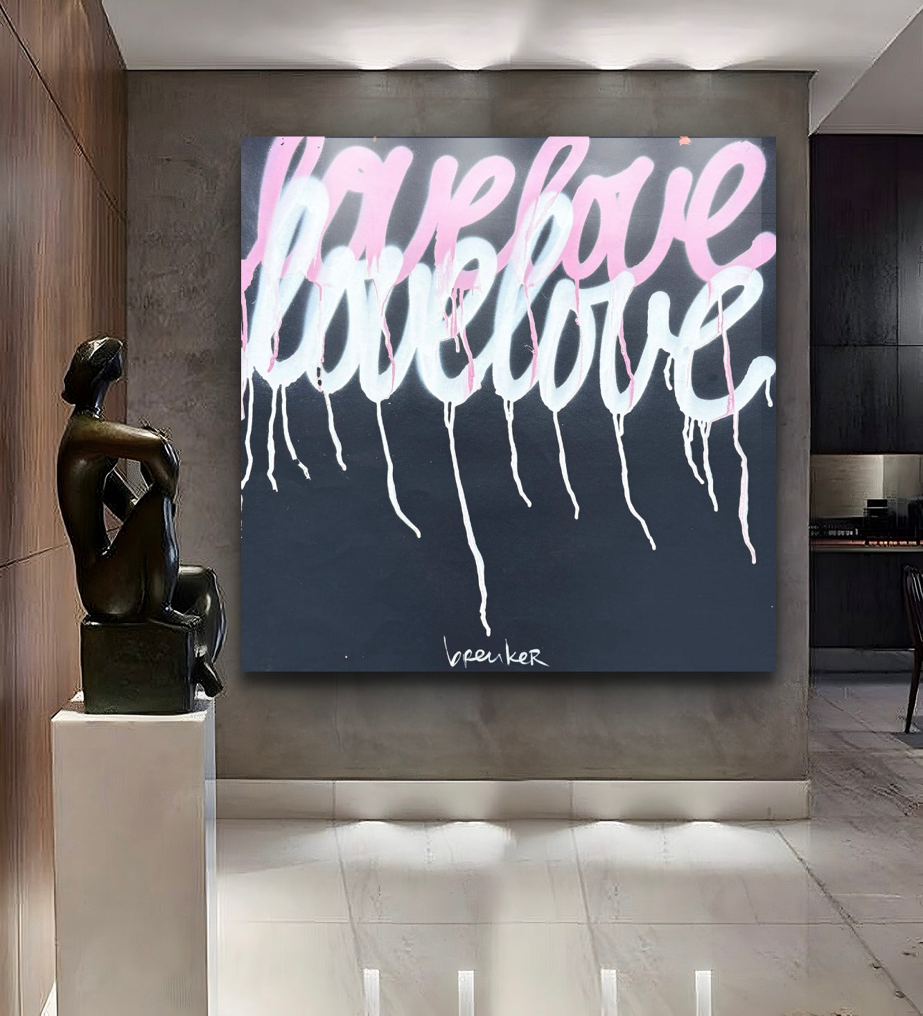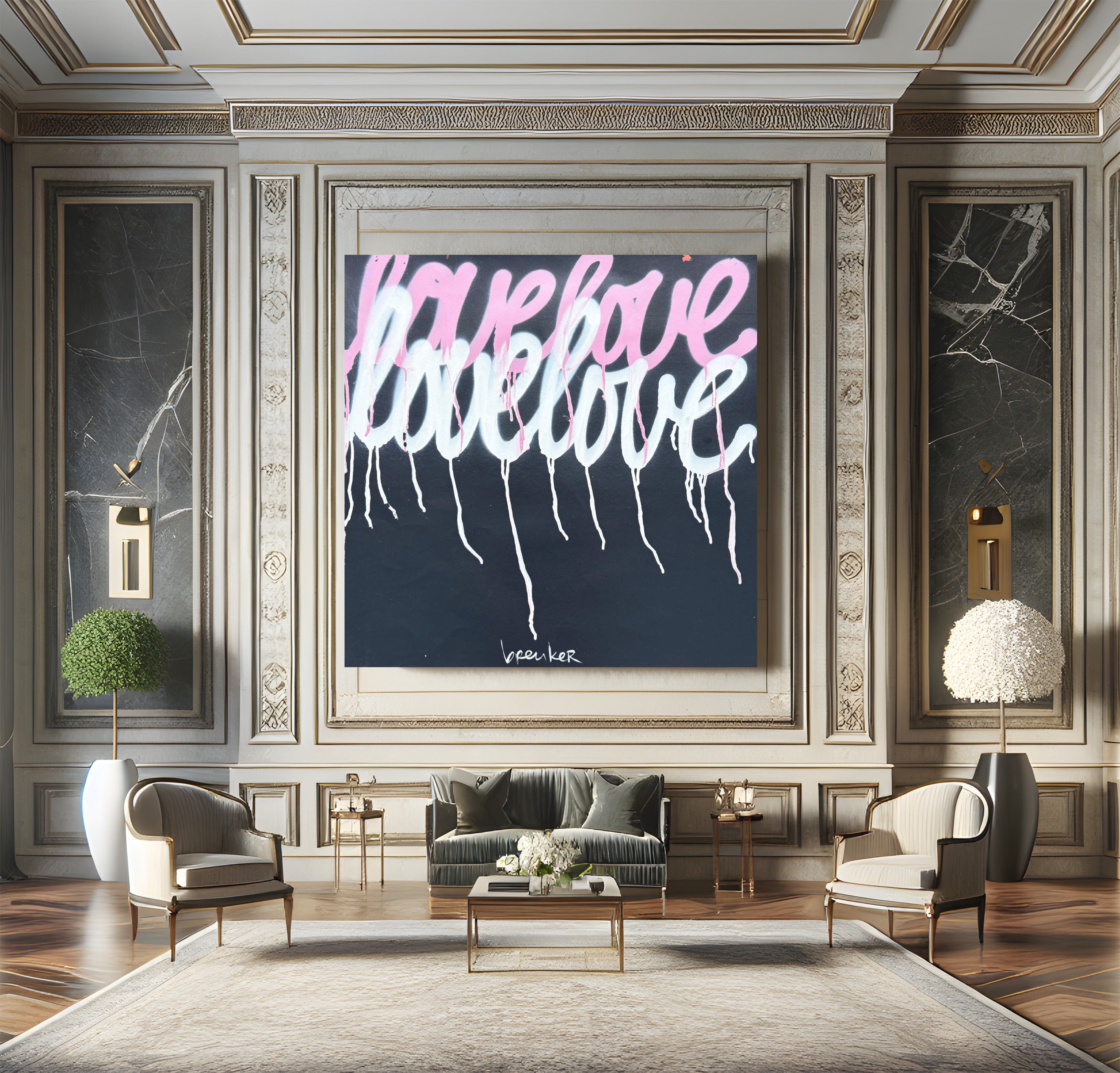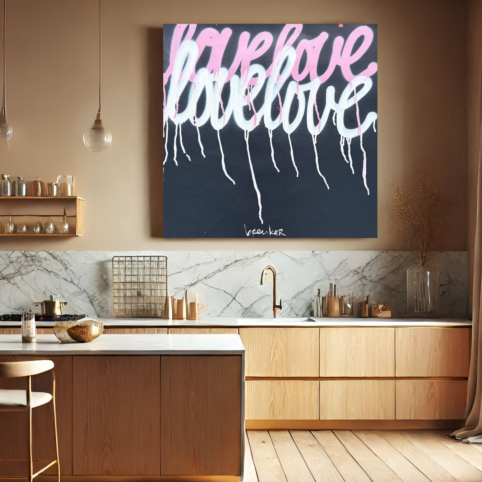De zachte roze tinten vloeien bijna teder over het doek, vermengd met licht en transparantie. Alsof de woorden voorzichtig zijn neergezet, maar toch blijven nazinderen. De subtiele drips geven het werk iets menselijks: niet perfect, maar echt. Net als liefde zelf.