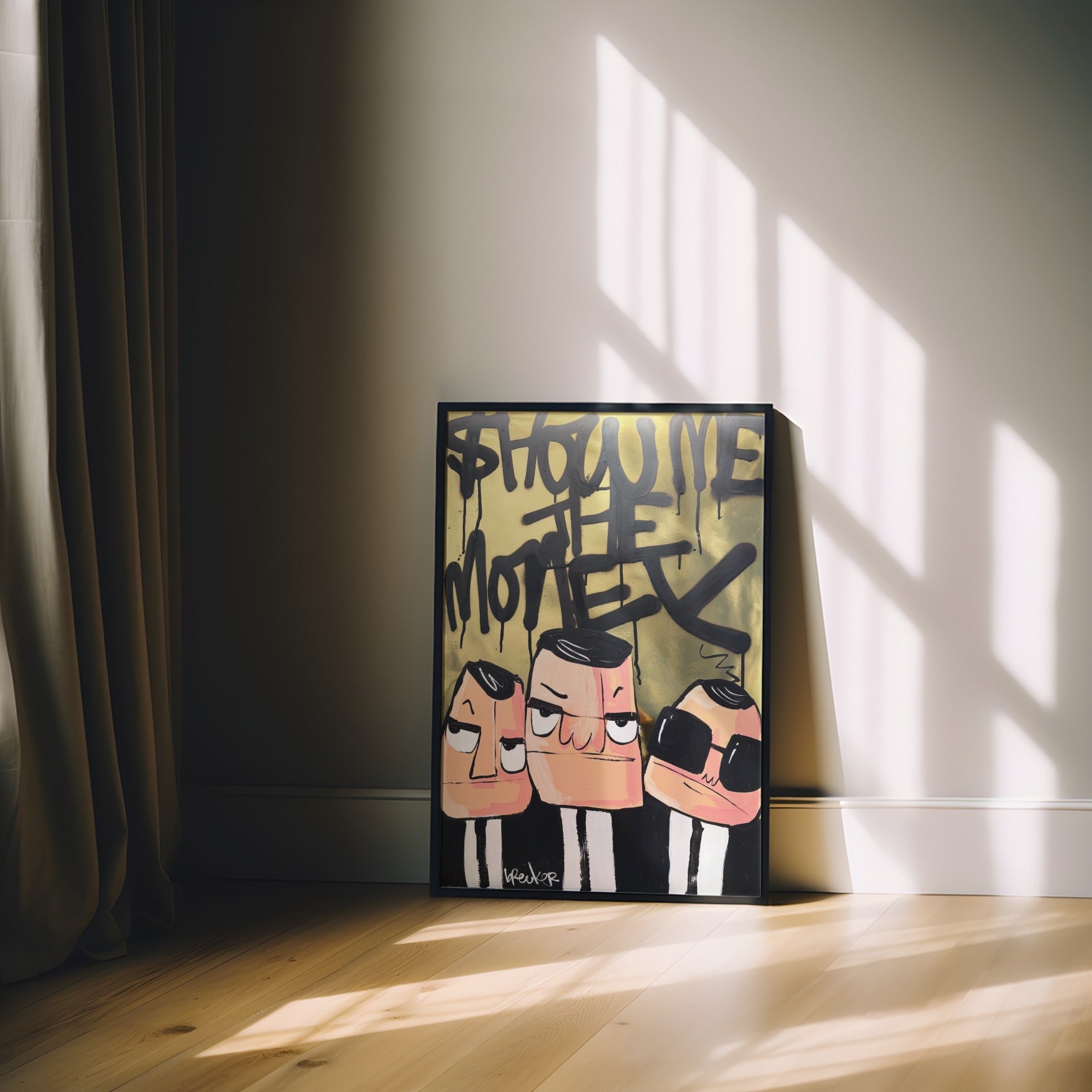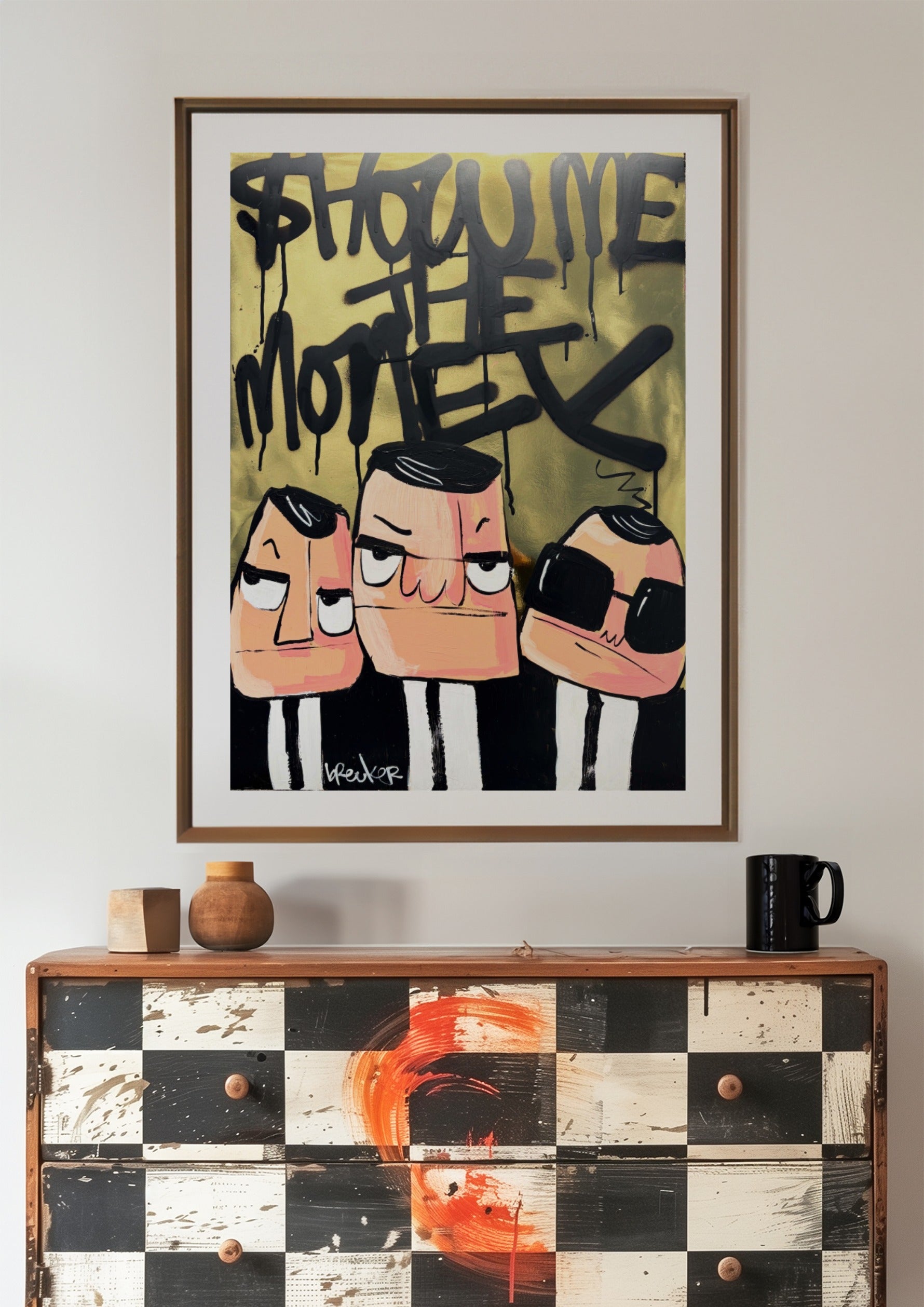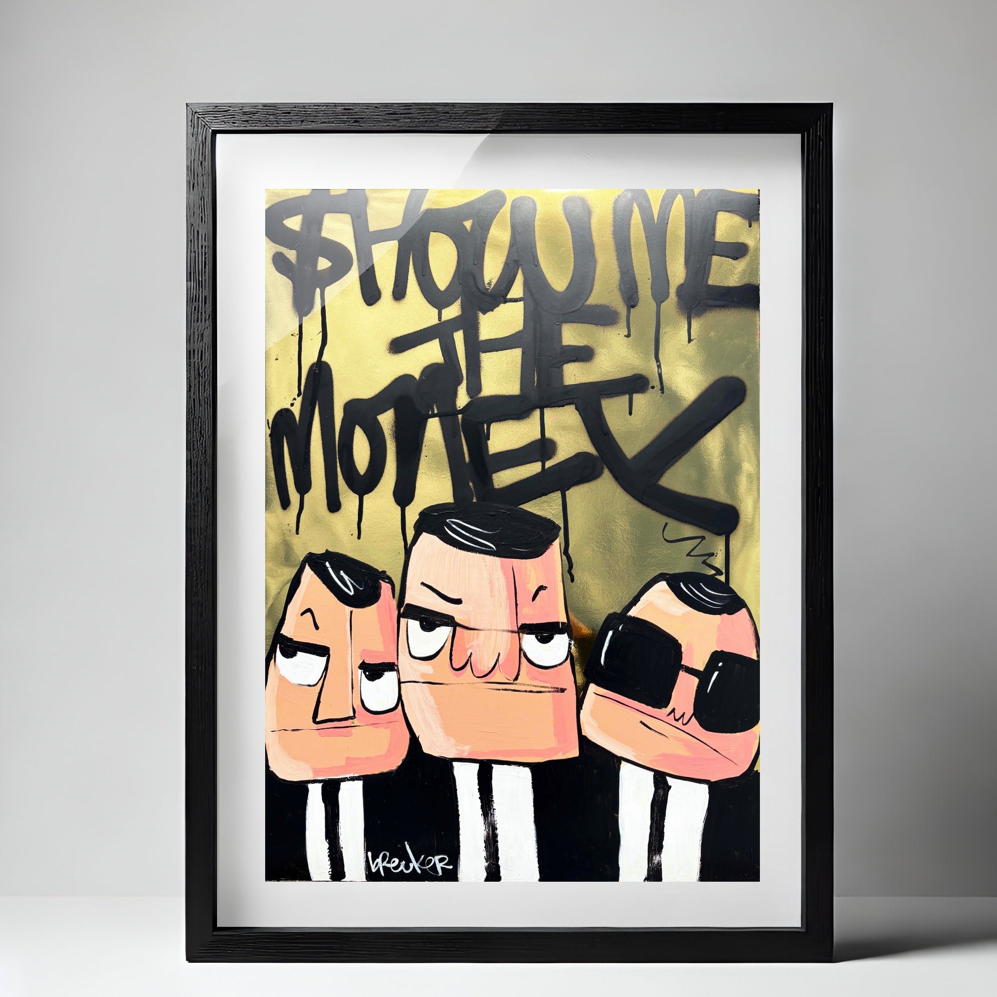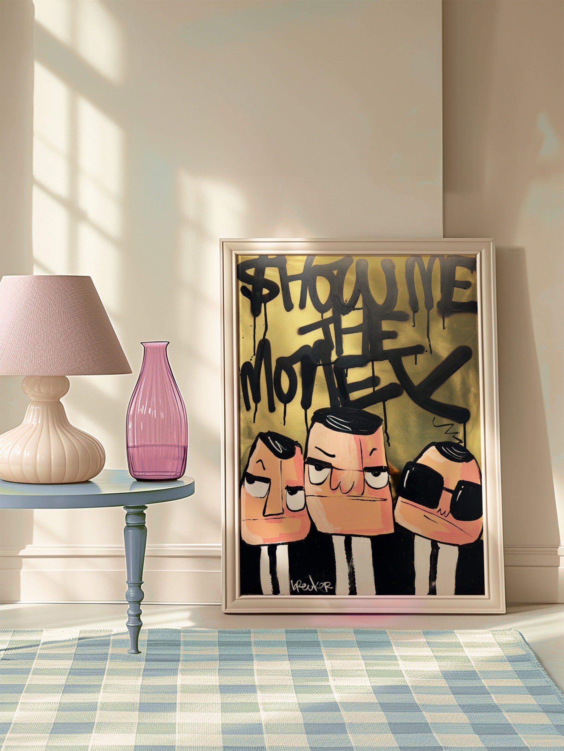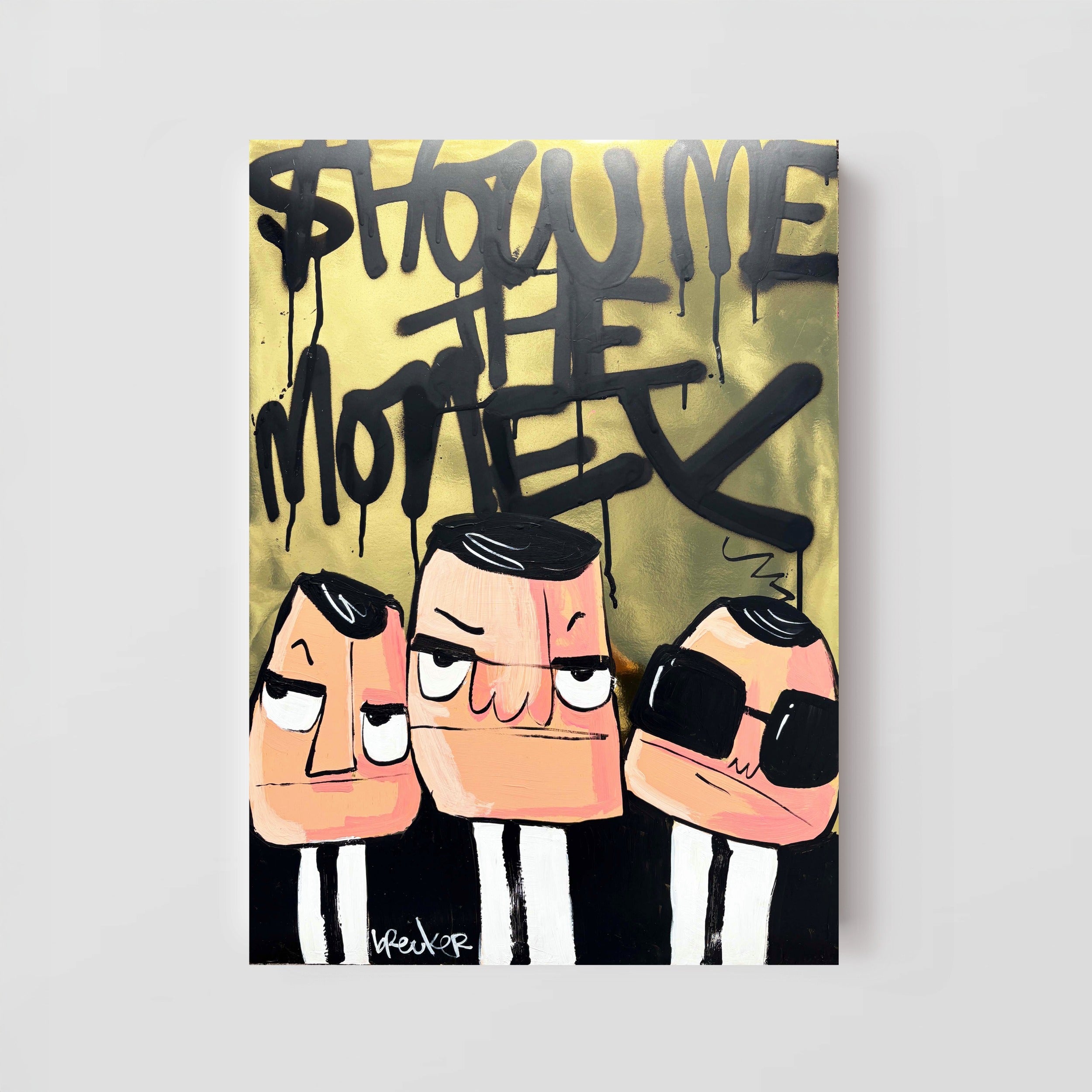 Show Me The Money. Show Me The Moneyerf op goud papier 50 x 70 cm.