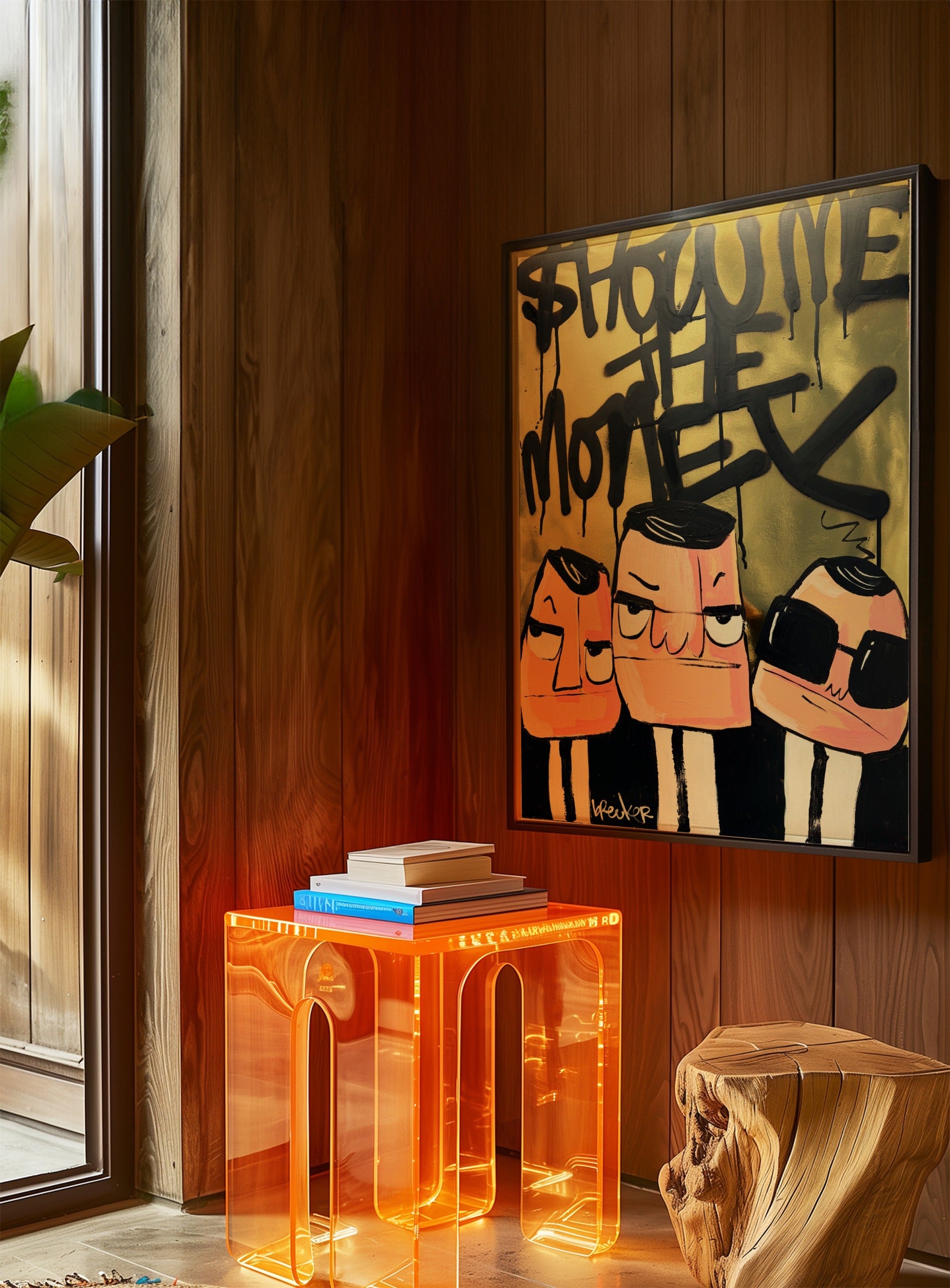Show Me The Money is pure energie. Geen omweg, geen twijfel – alleen focus. De combinatie van het glanzende goud en de rauwe, zwarte graffiti letters maakt dit werk direct en krachtig. Het goud vangt het licht en geeft luxe, terwijl de grove lijnen en drips het een ongefilterde, street vibe geven.