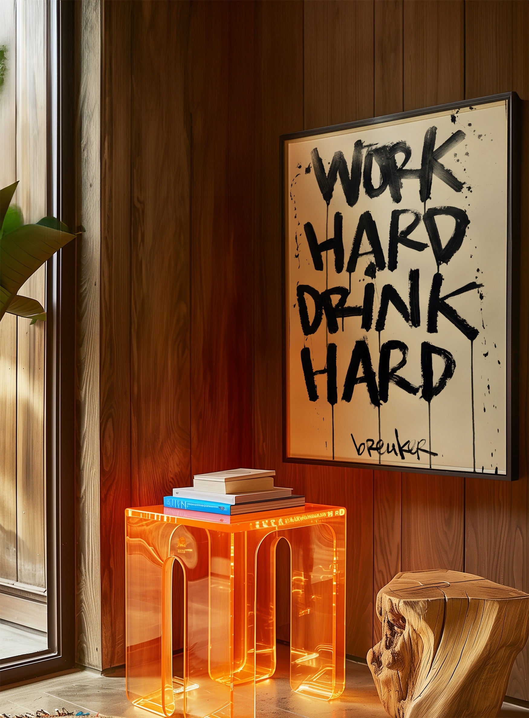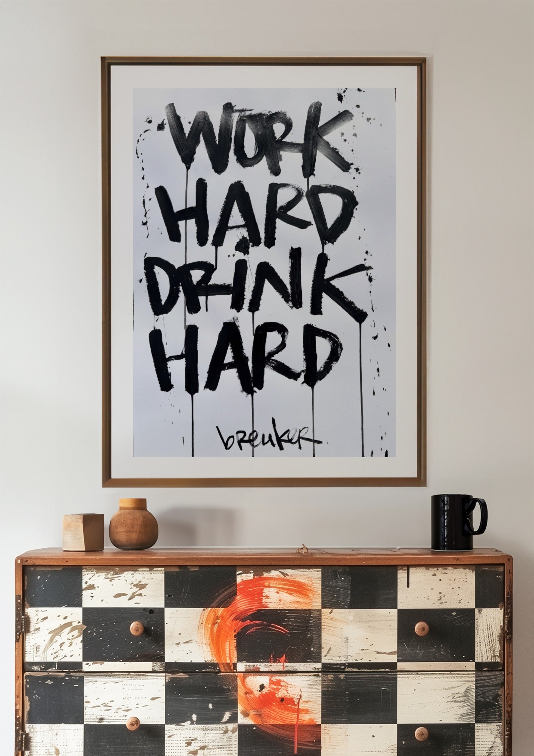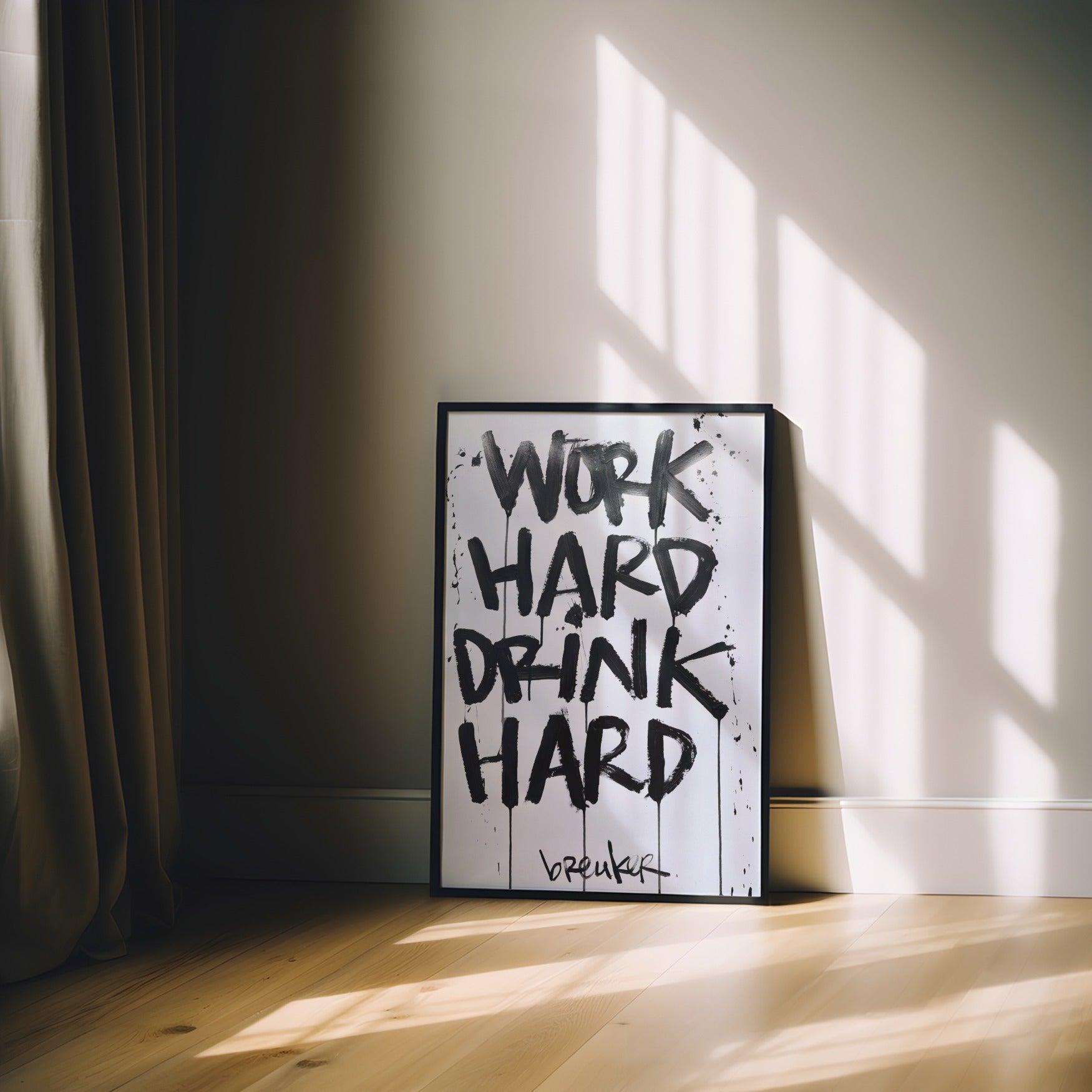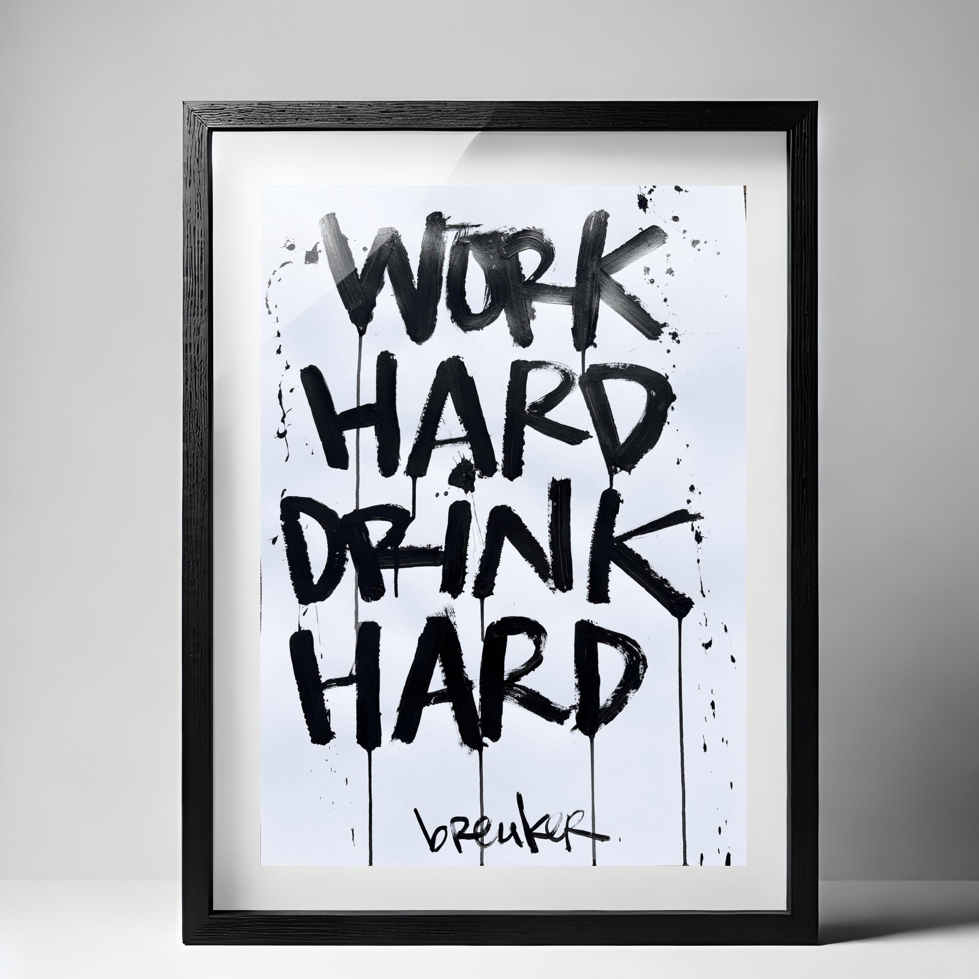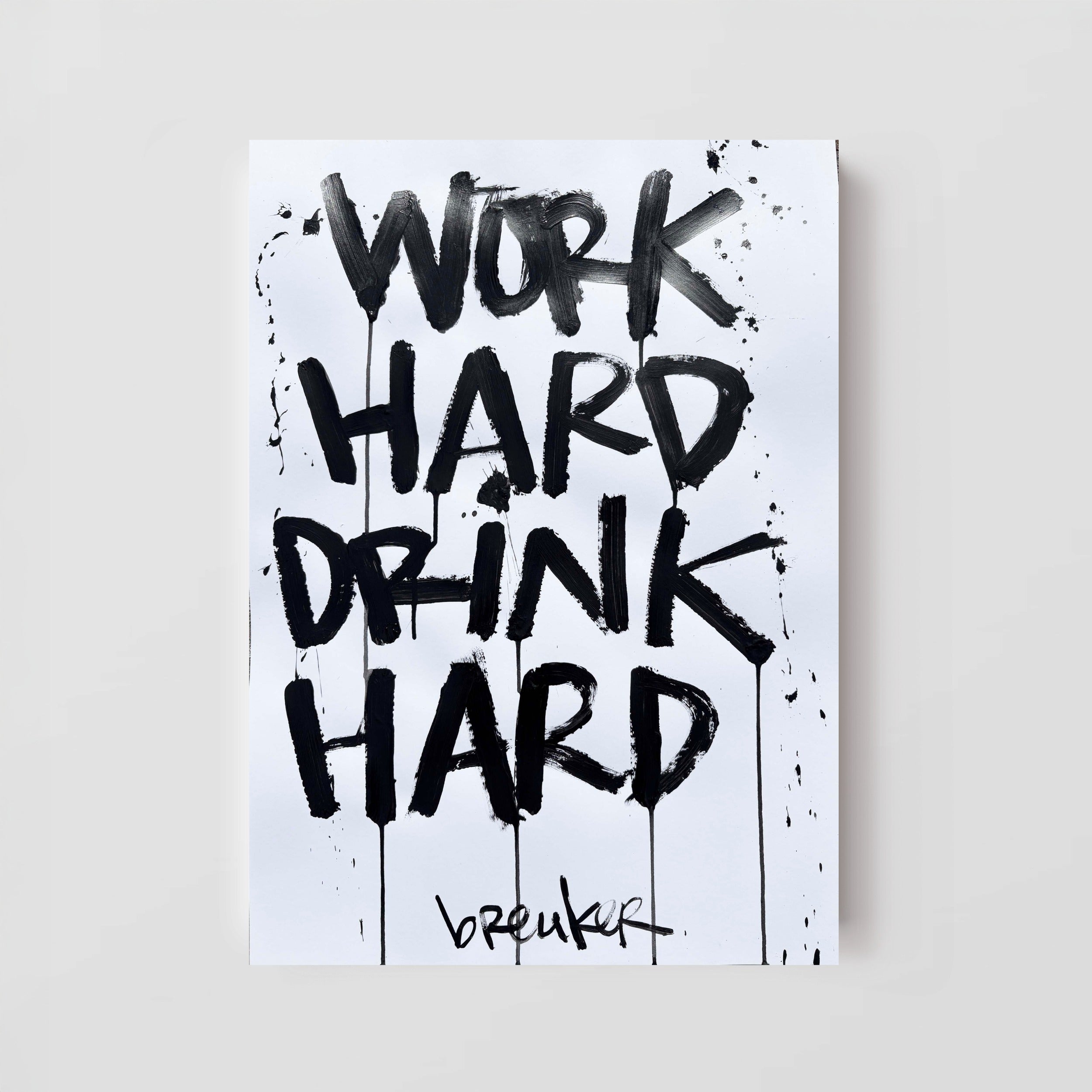 Work Hard Drink Hard zegt precies wat het is. Een levenshouding in zijn puurste vorm. Werken met focus, leven met volle teugen. De krachtige, handgeschilderde letters in diep zwart knallen van de lichte achtergrond af en geven het werk een directe, eerlijke energie.