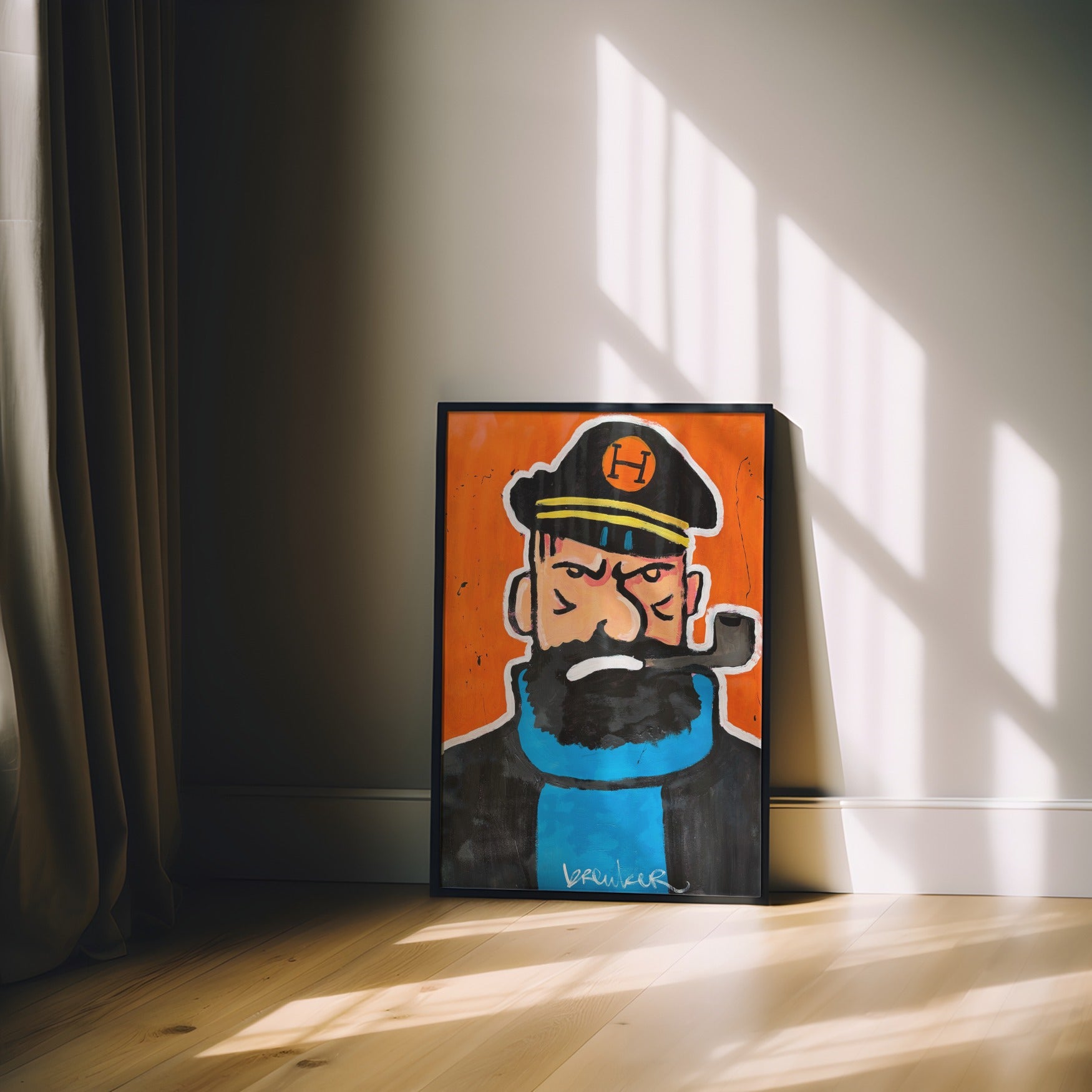Stoer, fel en recht-voor-zijn-raap. Haddock Hermes toont de iconische zeebonk in dikke Breuker-lijnen: pijp, pikzwarte baard en pet met “H”. De knaloranje achtergrond laat de kobaltblauwe sjaal en het norse gezicht extra spreken. Ruwe spatjes en energieke streken geven het werk een street-art bite, terwijl de titel speels knipoogt naar luxe-cultuur.