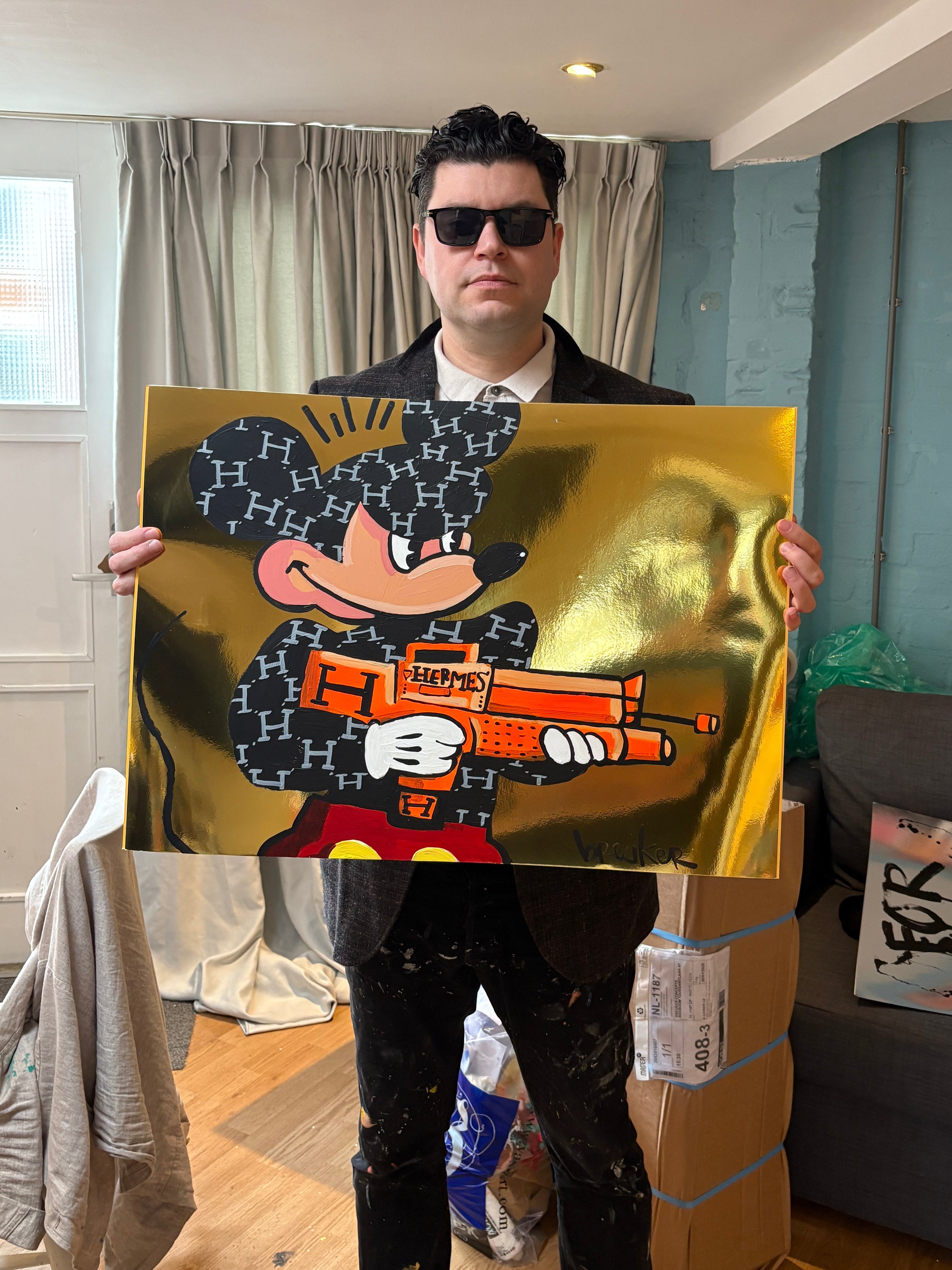 Mickey, verkleed als high-end fashion junkie, gehuld in een all-over Hermès-patroon, staat hier niet te lachen — hij richt. Gewapend met een feloranje “Hermès”-gun is dit werk een schaamteloze botsing tussen kinderlijke nostalgie en decadente luxe. Ironisch? Absoluut. Subtiel? Geen seconde.