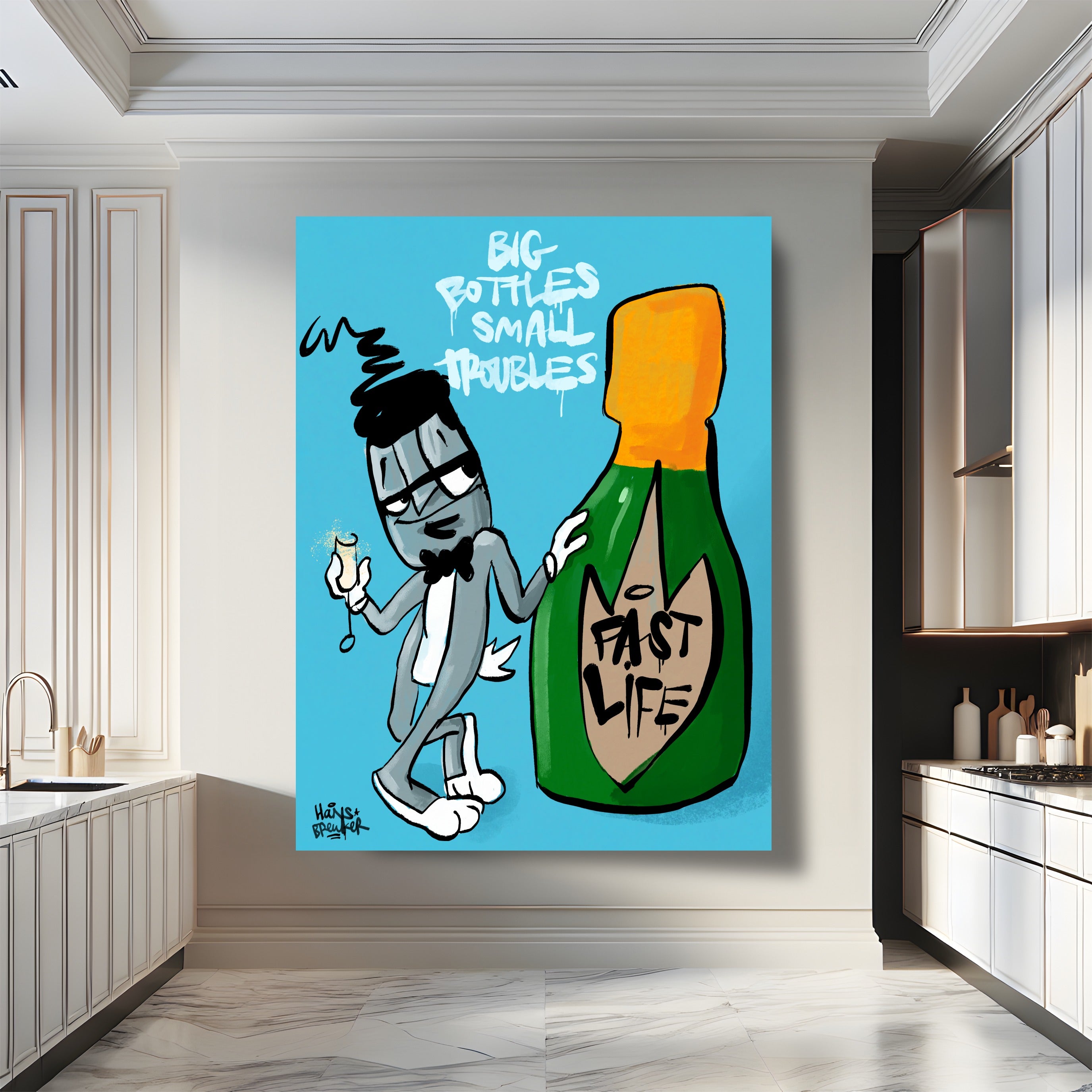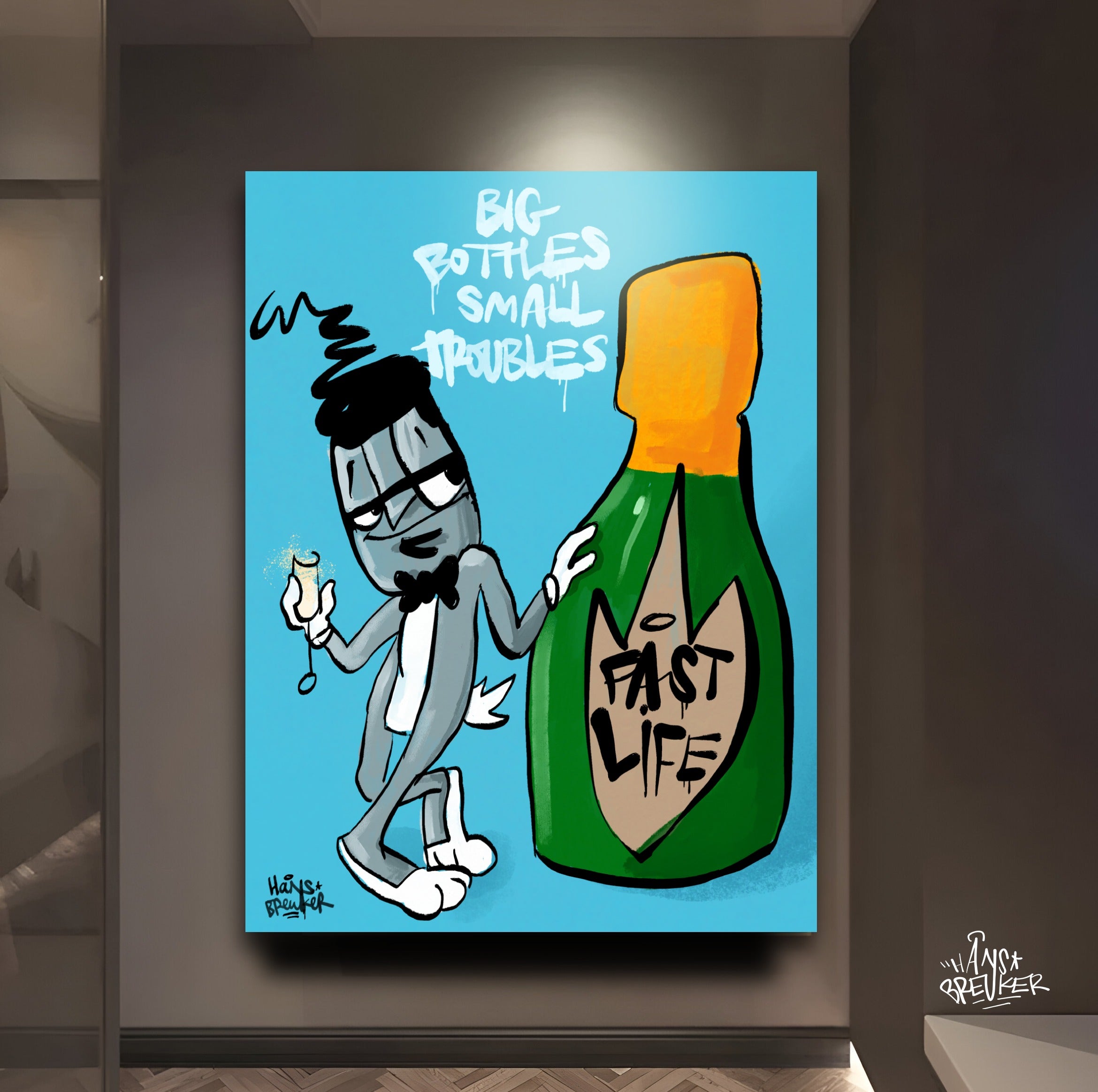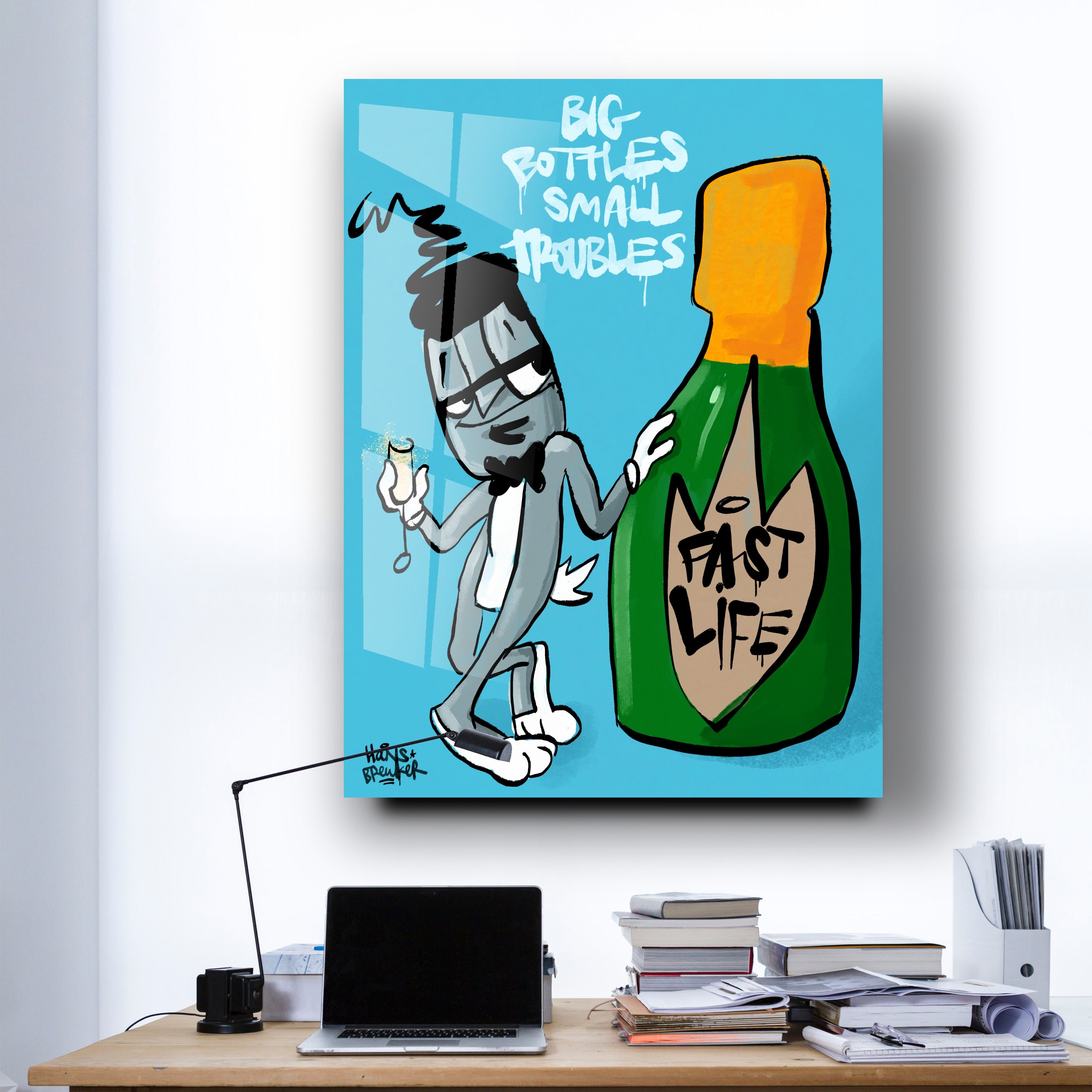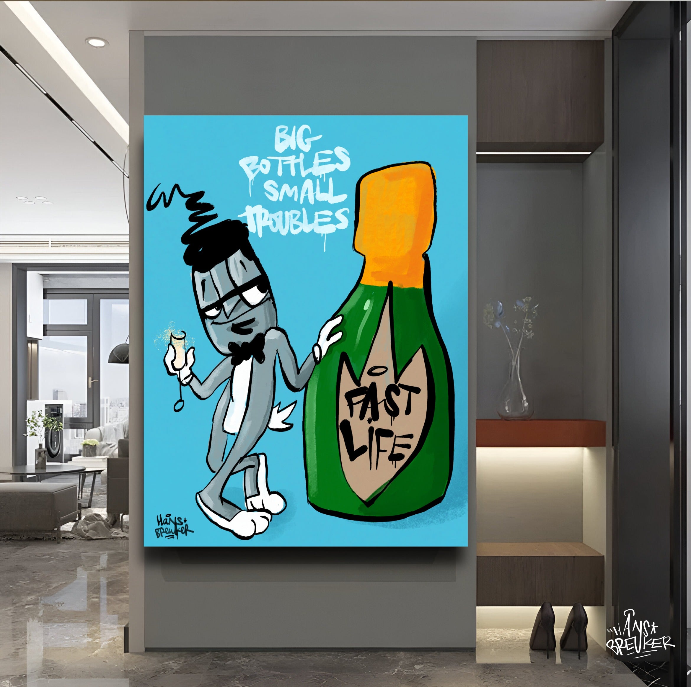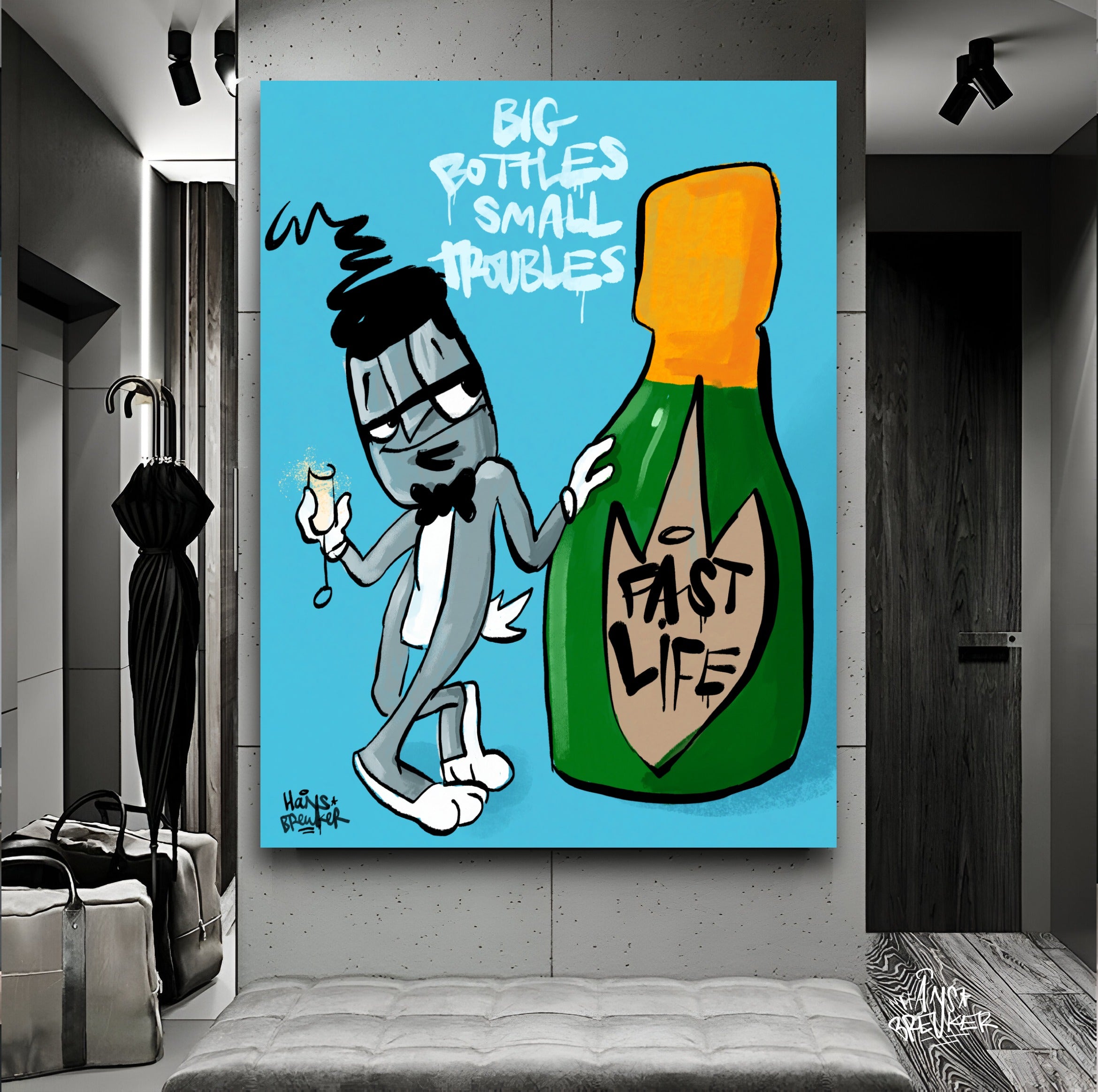 Apportez une touche de couleur, de style et une touche de rébellion dans votre espace avec l'œuvre pop art unique de Hans Breuker. Cette pièce vibrante et provocante représente un personnage mafieux, vêtu d'un costume classique, brandissant triomphalement deux bouteilles de champagne pétillantes.