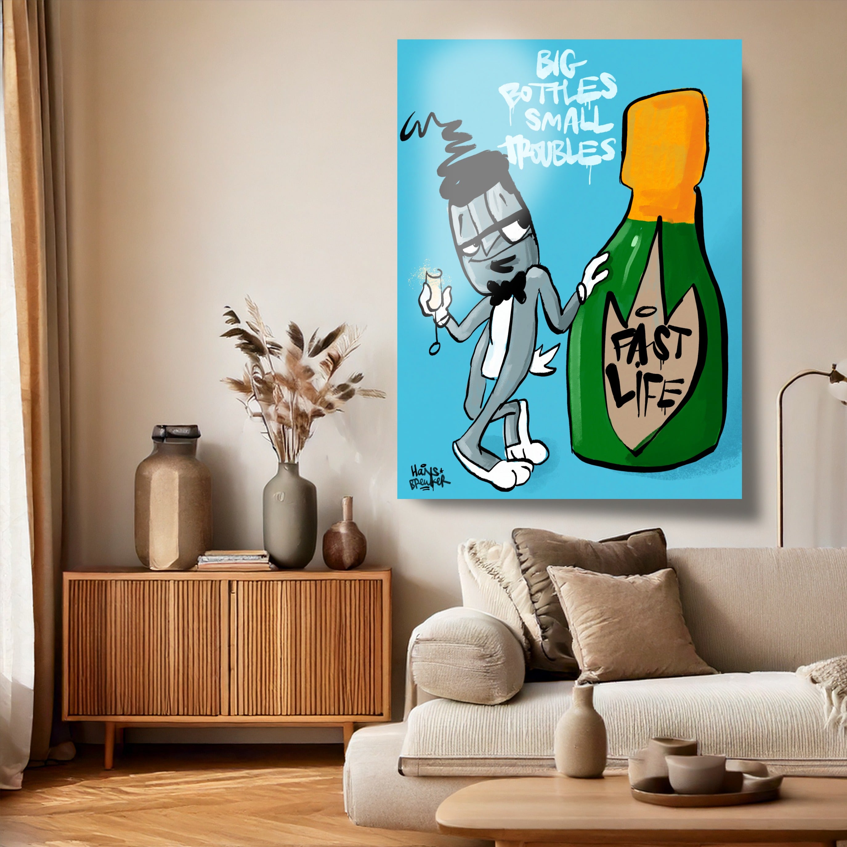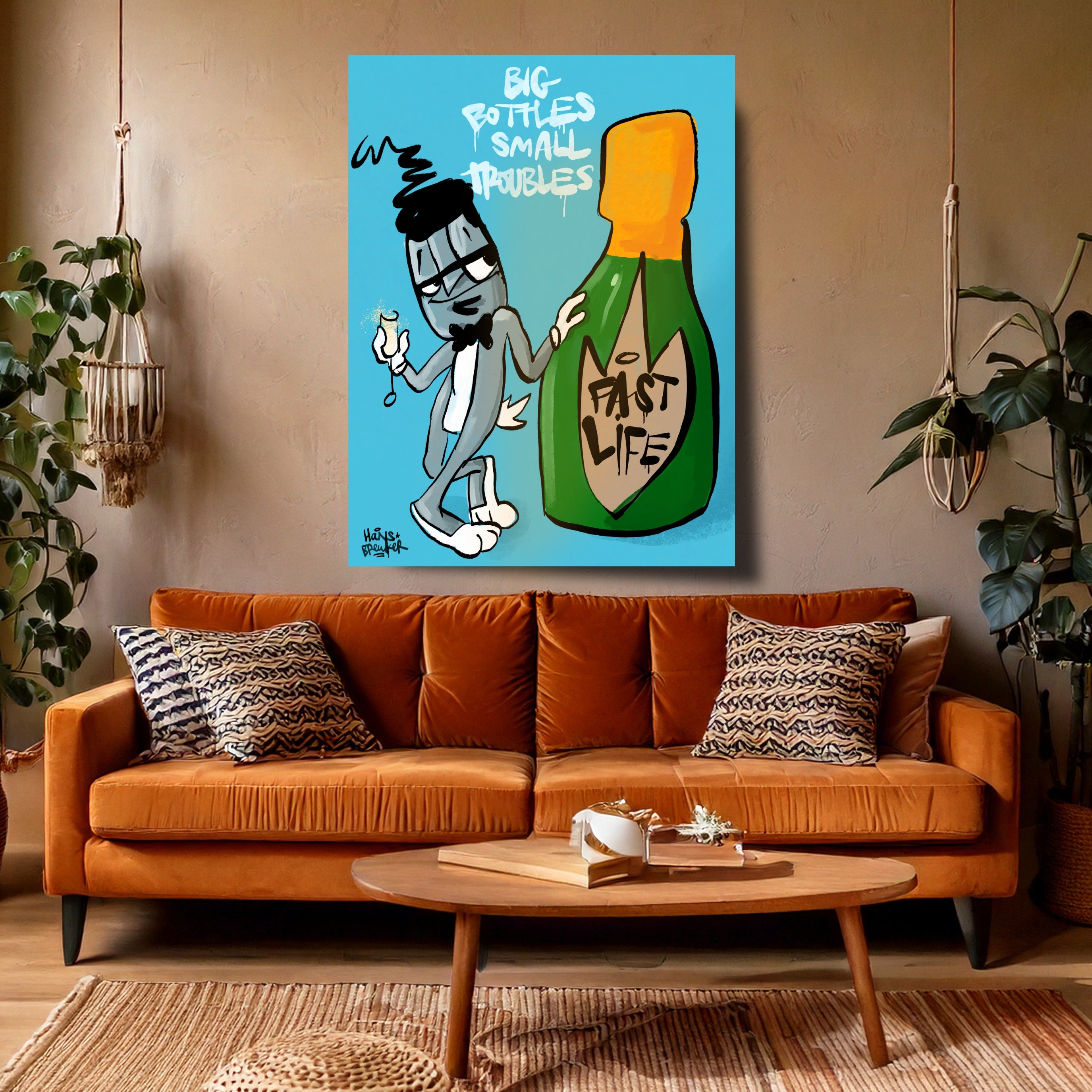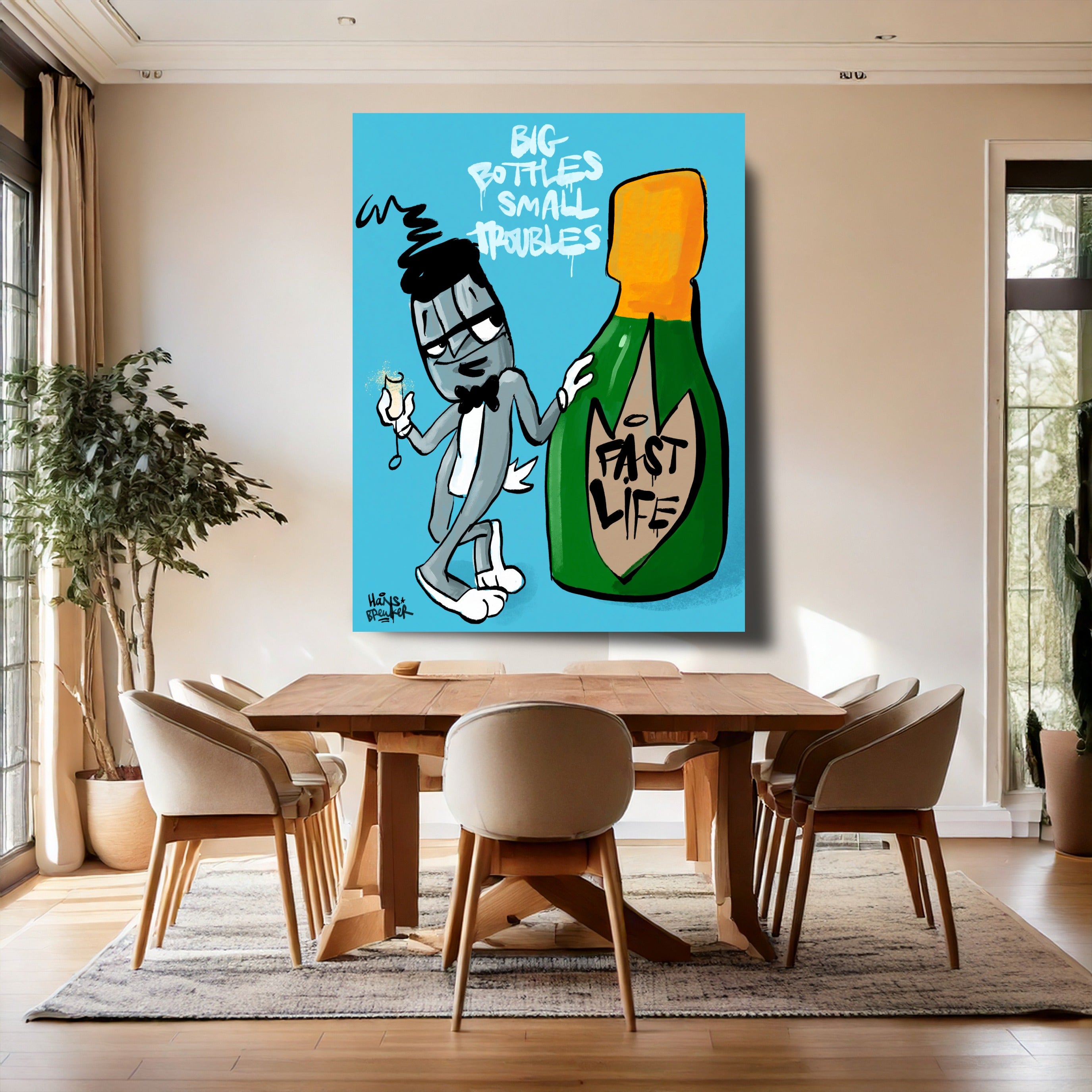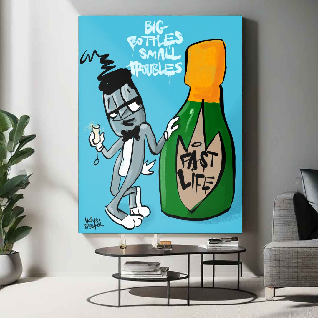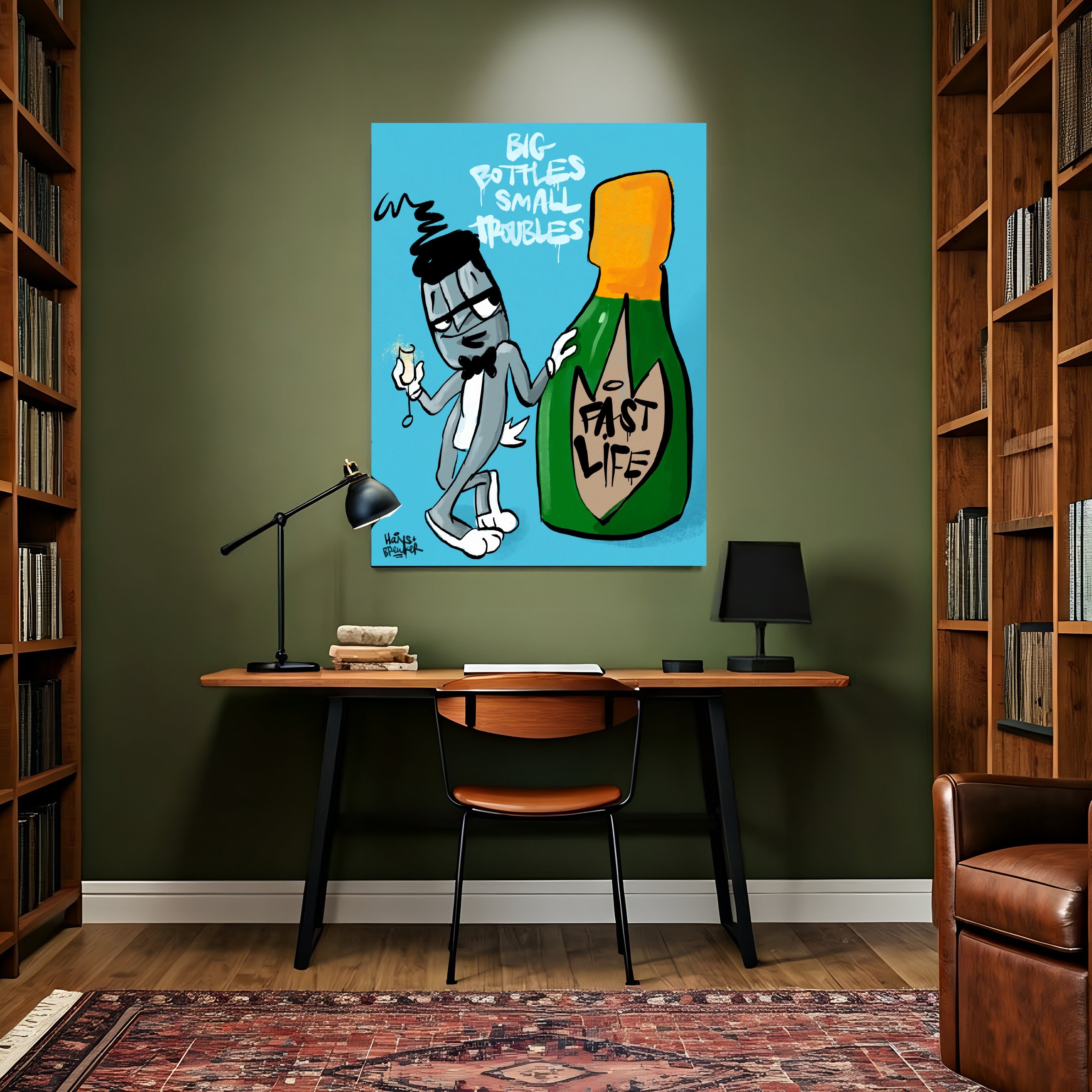 Apportez une touche de couleur, de style et une touche de rébellion dans votre espace avec l'œuvre pop art unique de Hans Breuker. Cette pièce vibrante et provocante représente un personnage mafieux, vêtu d'un costume classique, brandissant triomphalement deux bouteilles de champagne pétillantes.