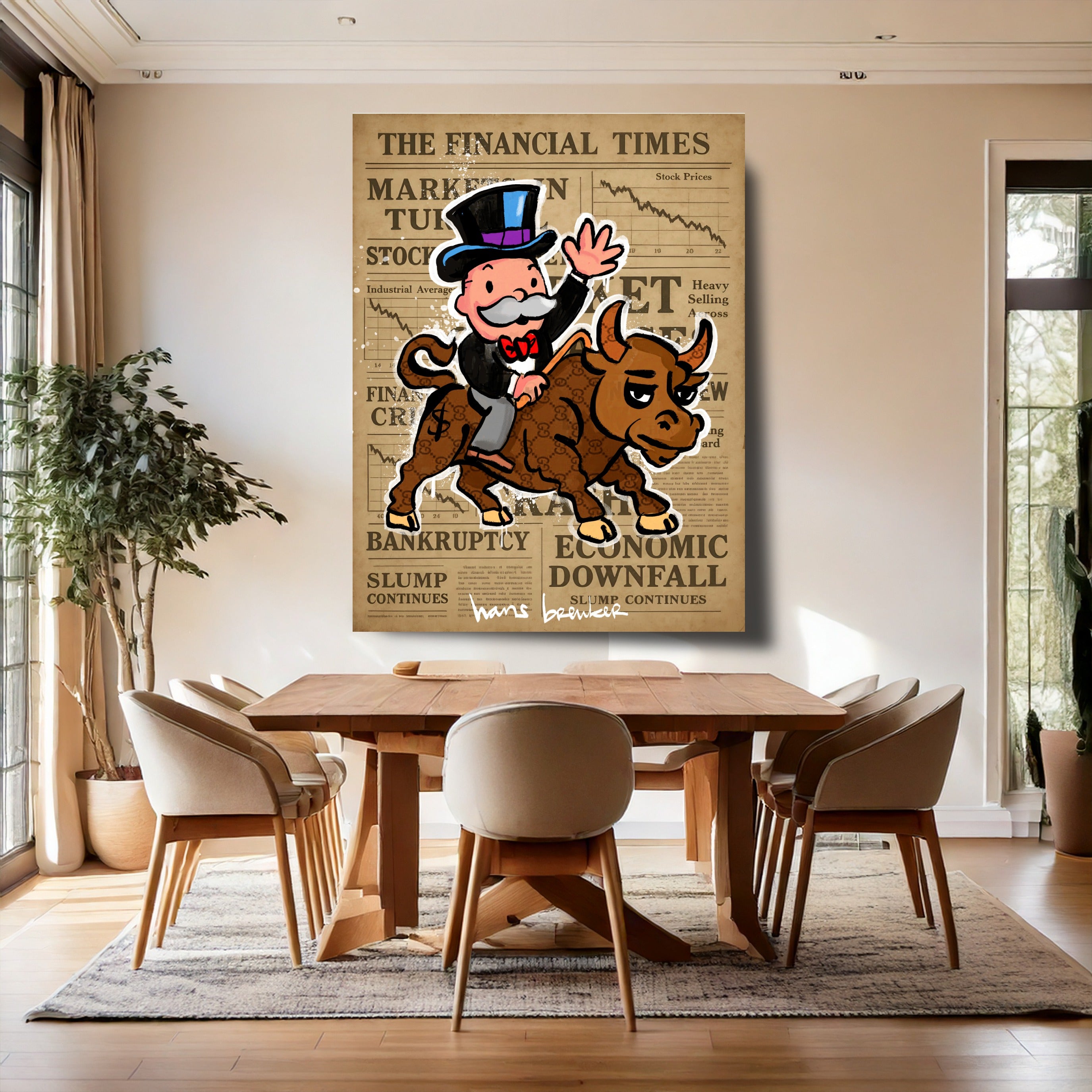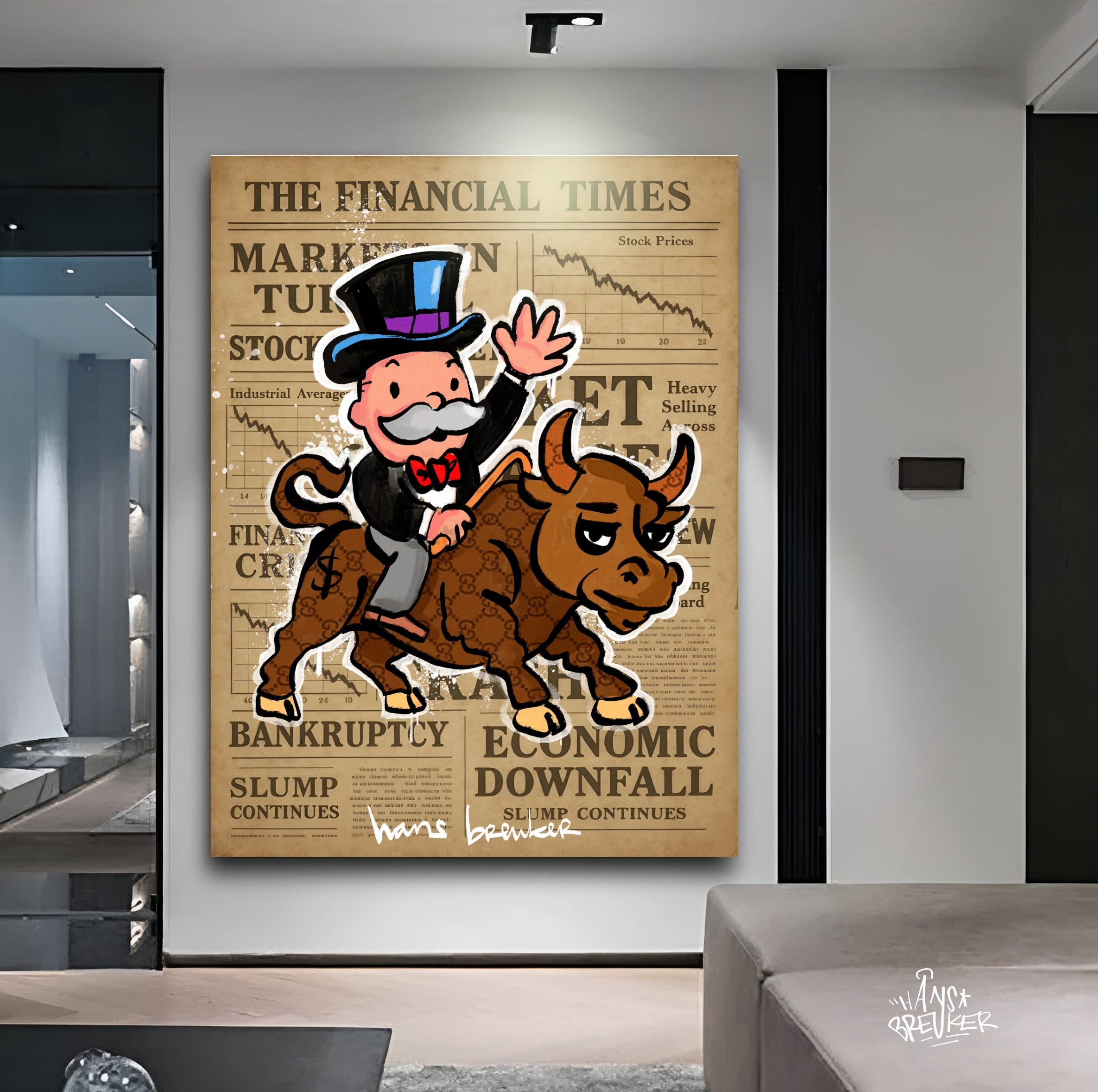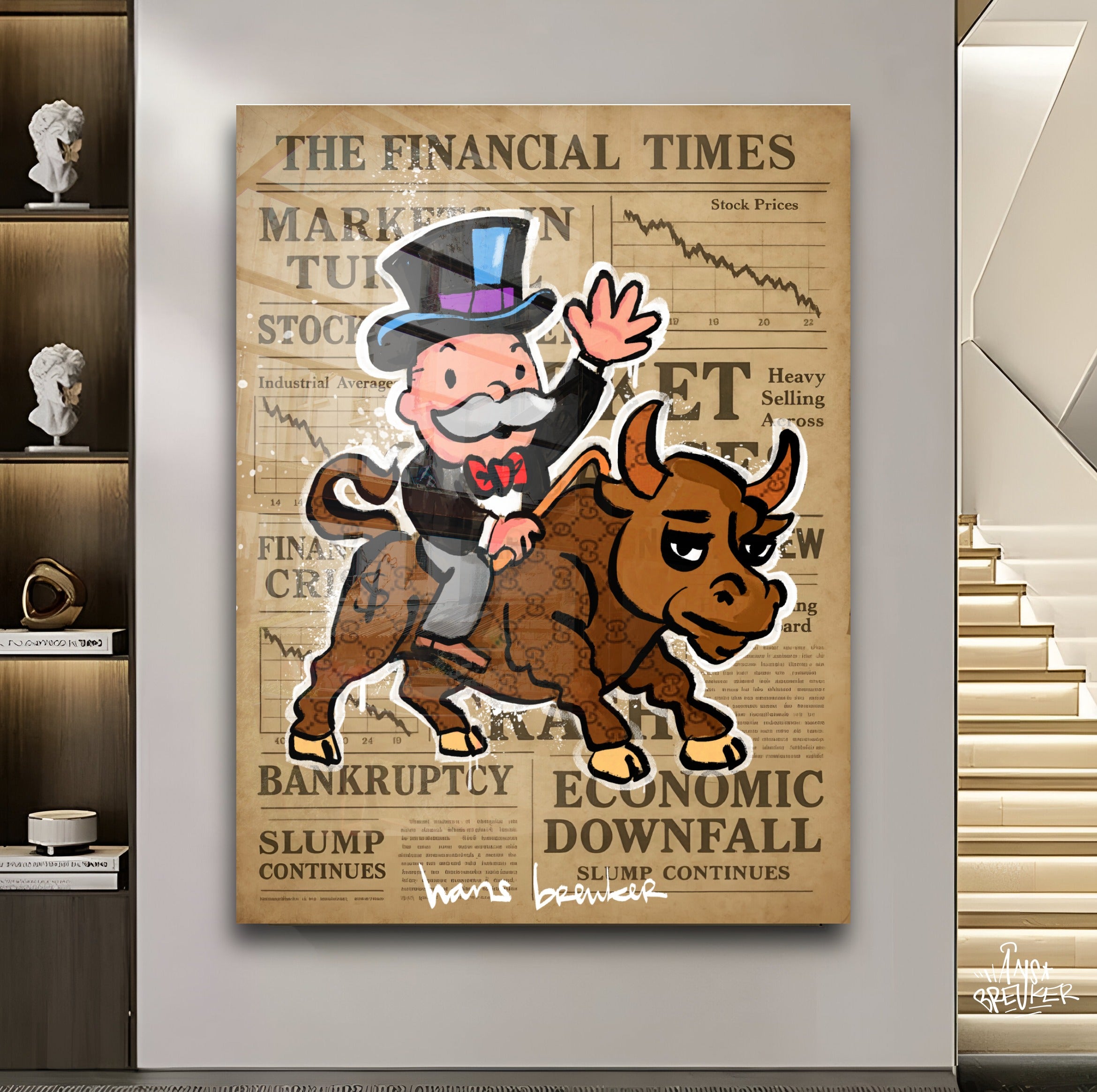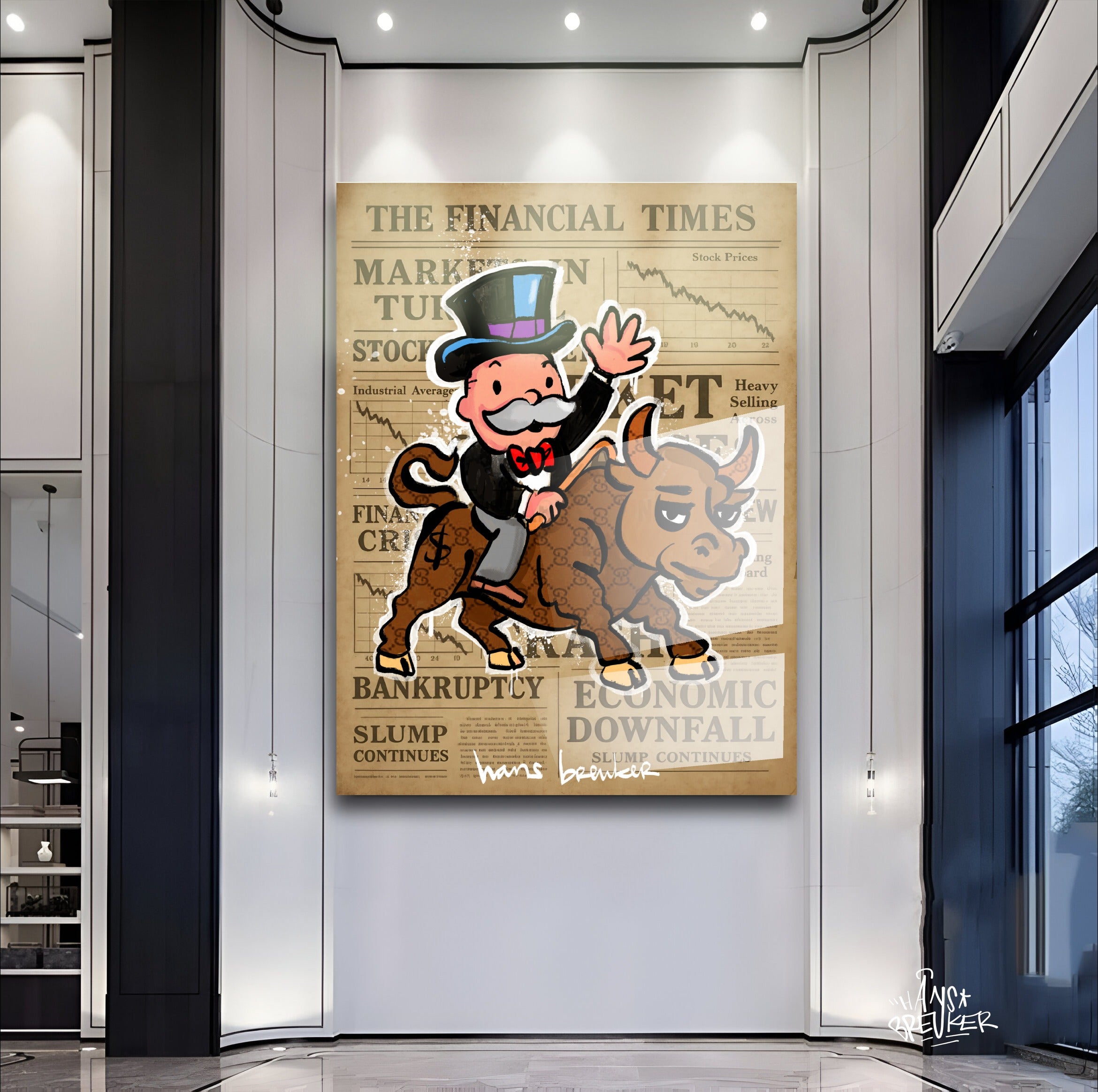 Beschrijving: Laat de kracht van de markt en de charme van succes je muur domineren met Bullmarket Mr Monops, een origineel kunstwerk van Hans Breuker. Geïnspireerd op de financiële wereld, Wall Street-energie en het bekende “bull market”-symbool, toont dit werk de charismatische Mr Monops — een parodische knipoog naar de klassieke Monopoly-miljonair — die triomfantelijk de stier berijdt.