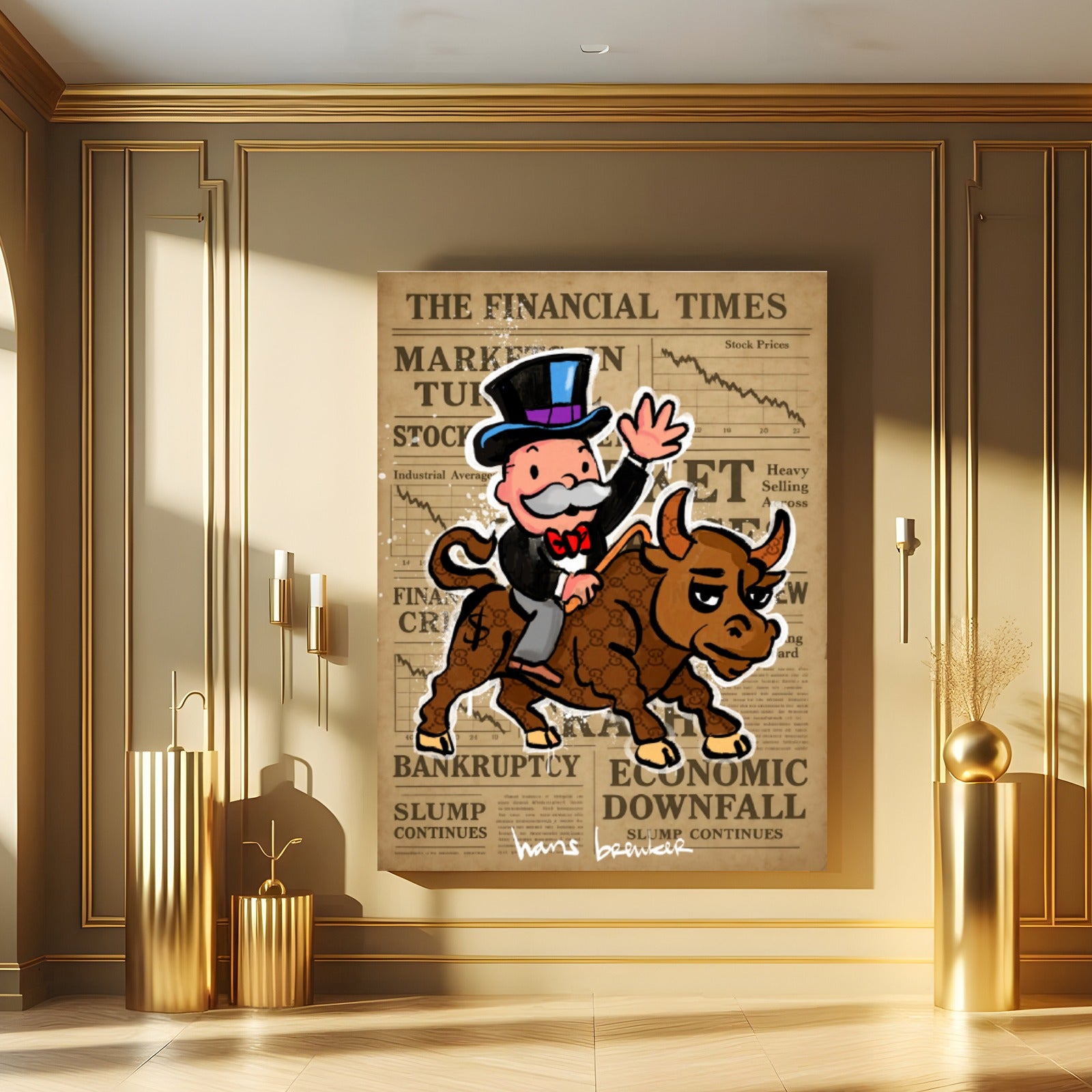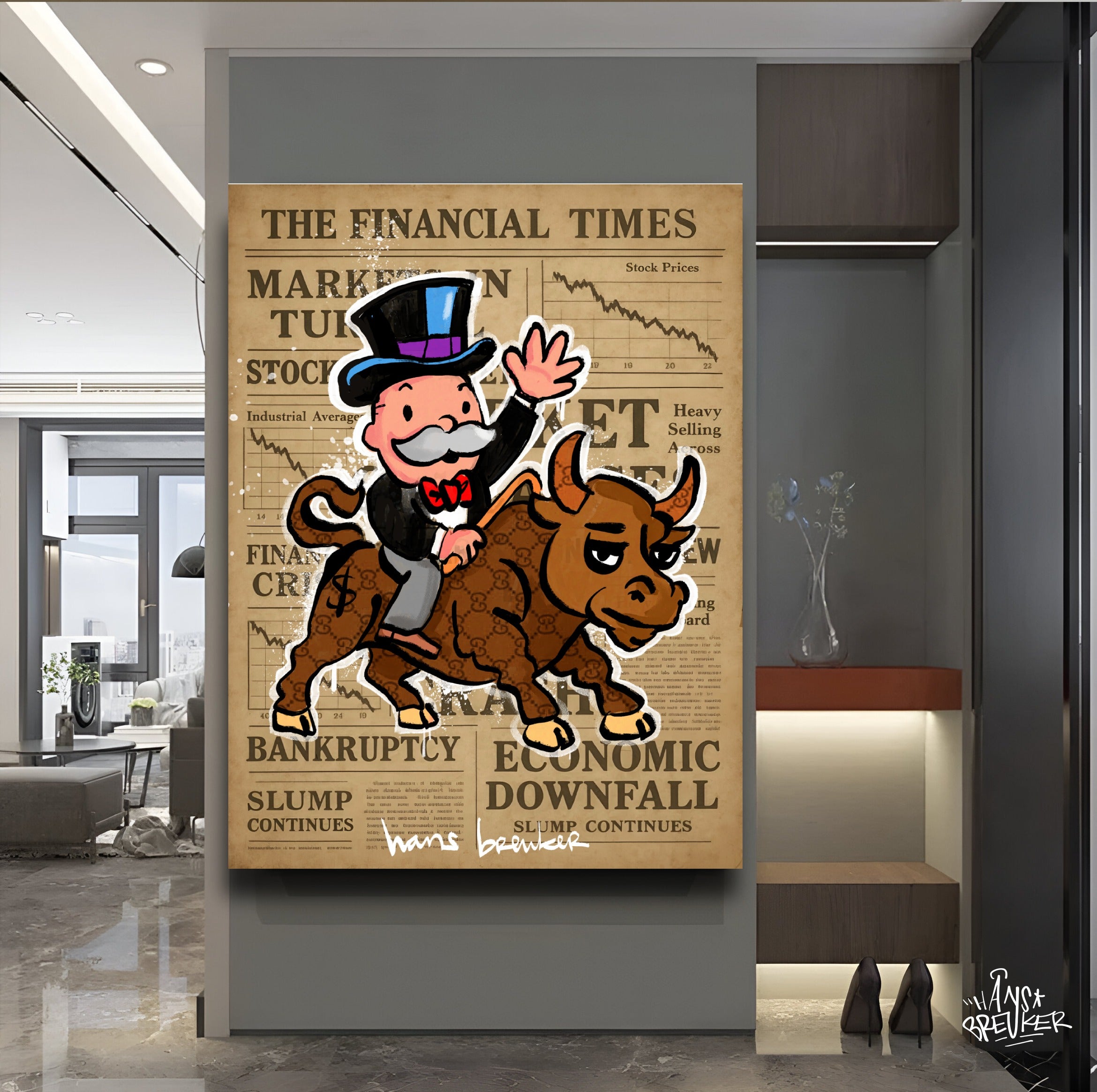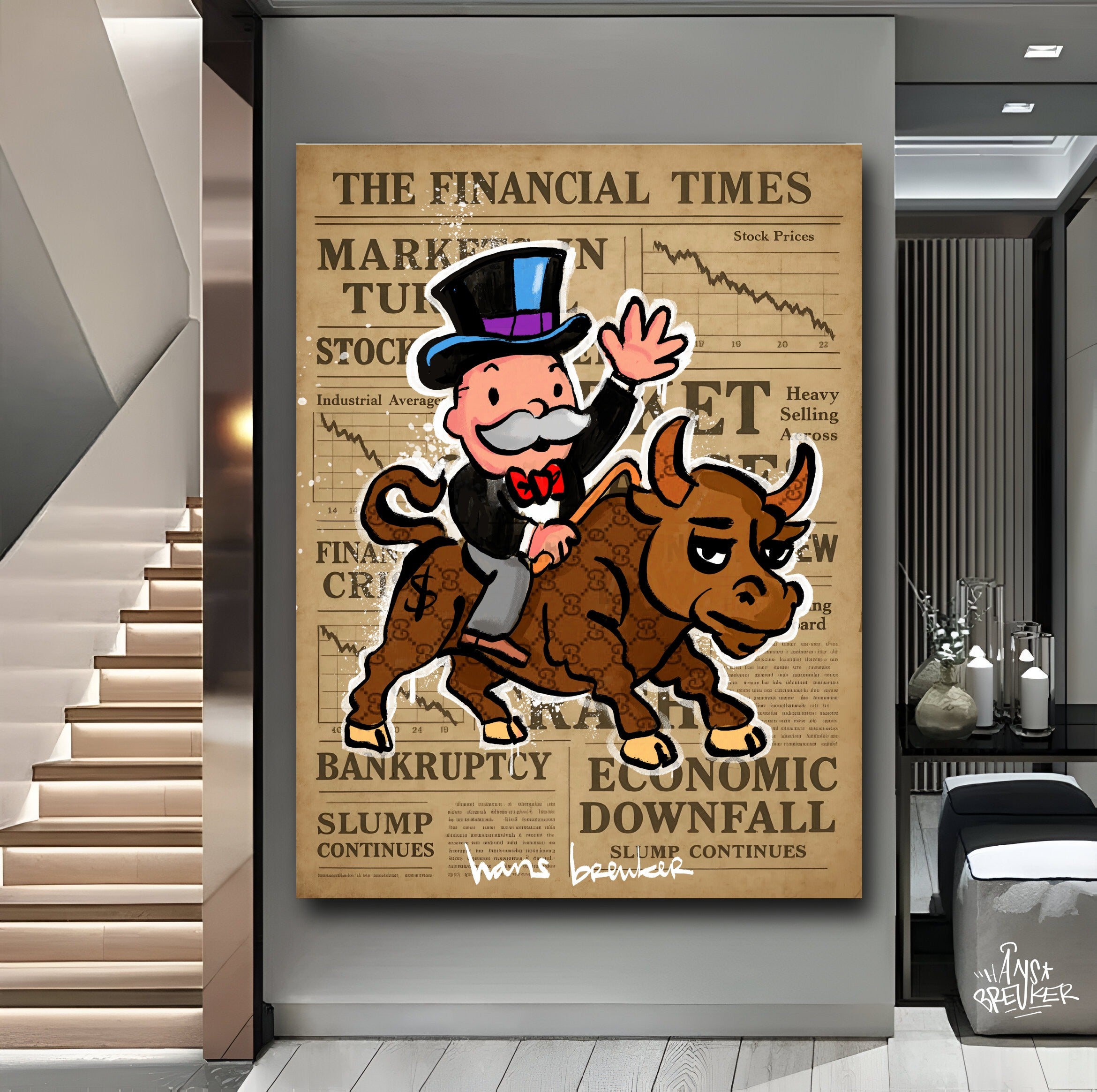 Beschrijving: Laat de kracht van de markt en de charme van succes je muur domineren met Bullmarket Mr Monops, een origineel kunstwerk van Hans Breuker. Geïnspireerd op de financiële wereld, Wall Street-energie en het bekende “bull market”-symbool, toont dit werk de charismatische Mr Monops — een parodische knipoog naar de klassieke Monopoly-miljonair — die triomfantelijk de stier berijdt.