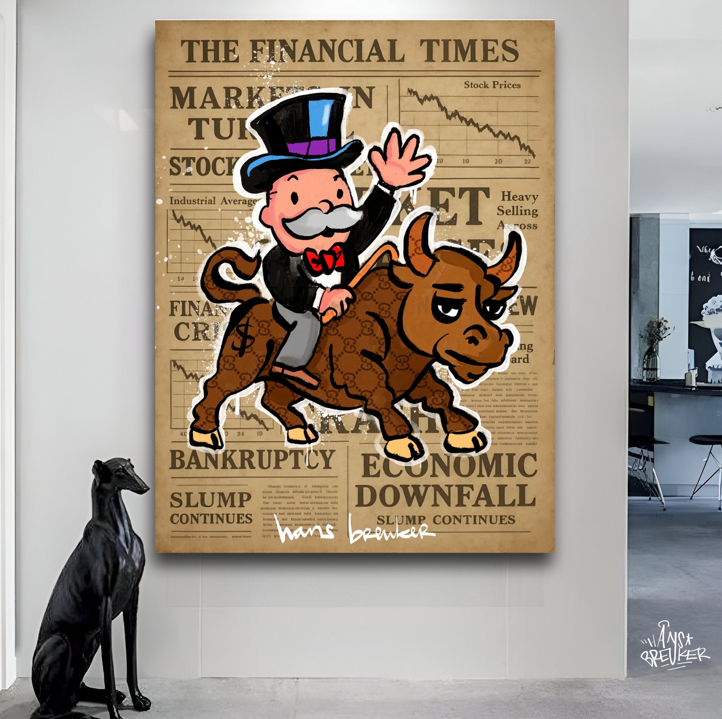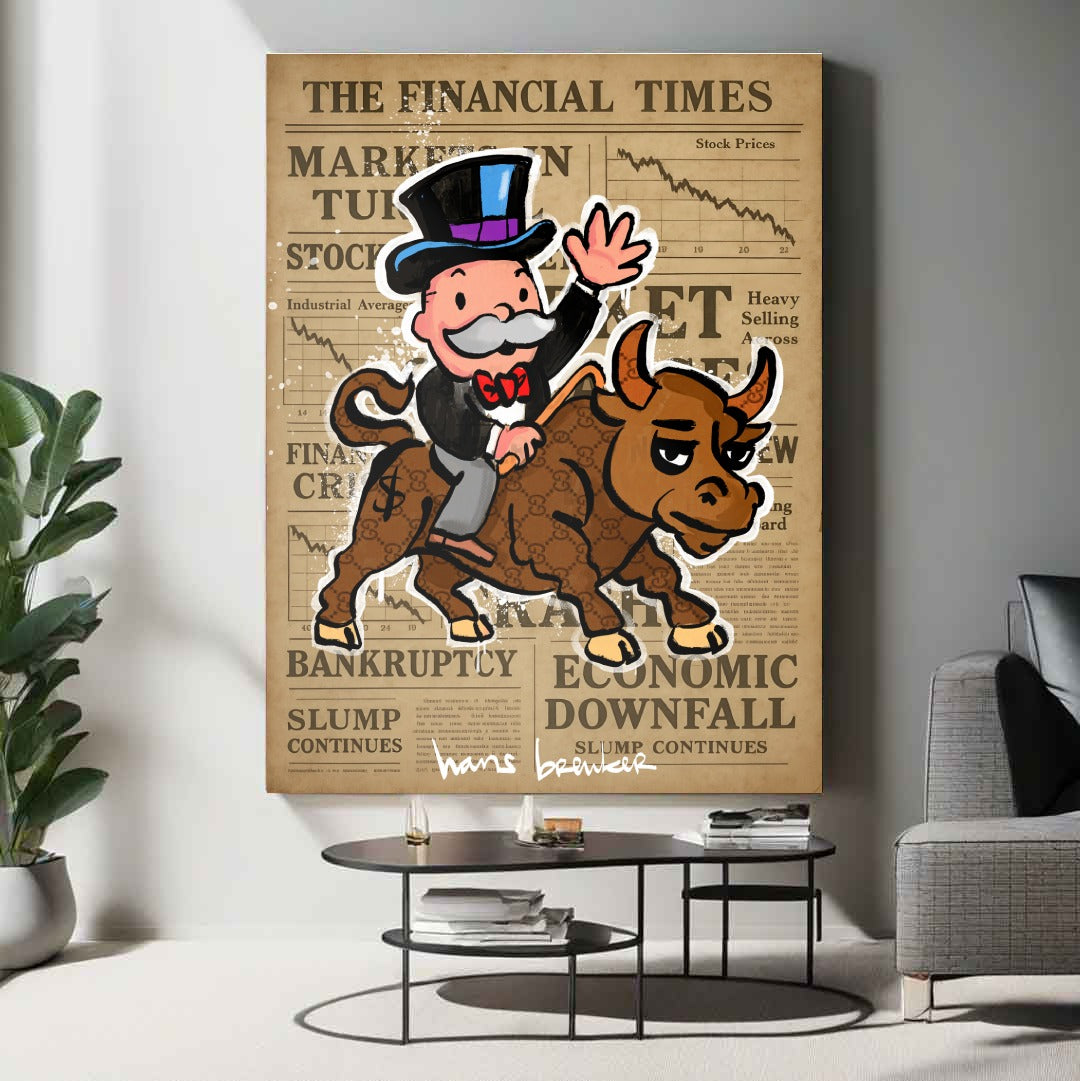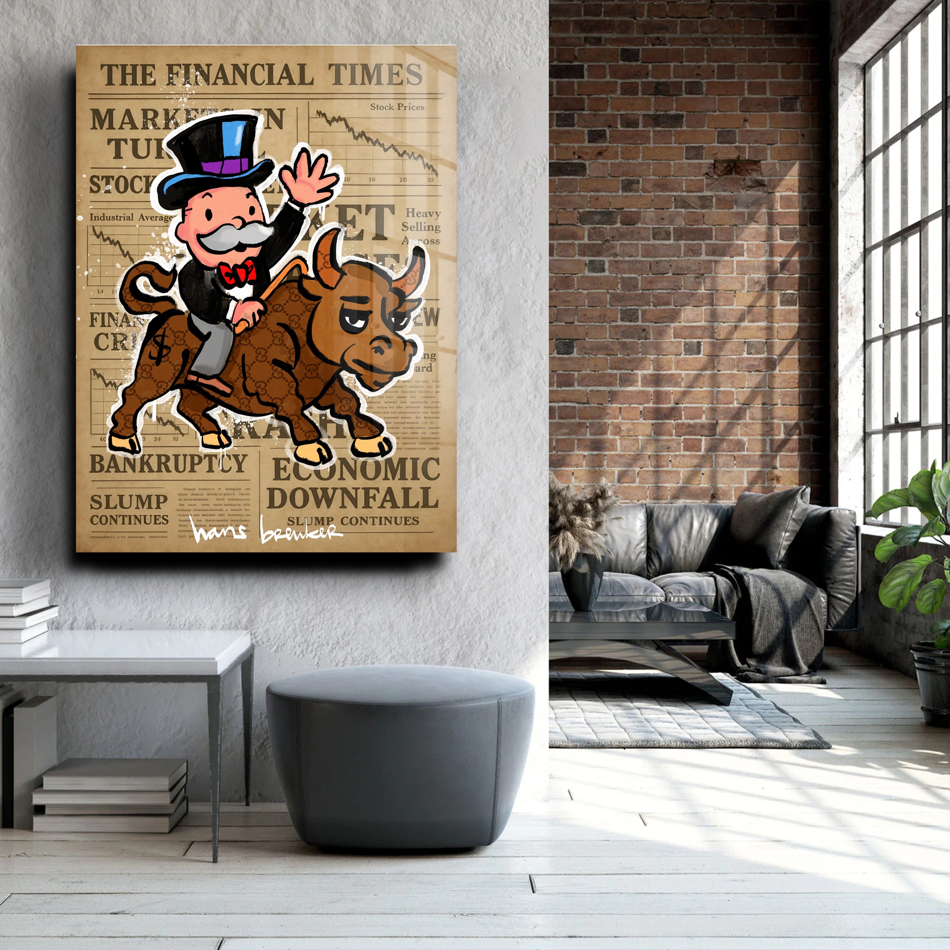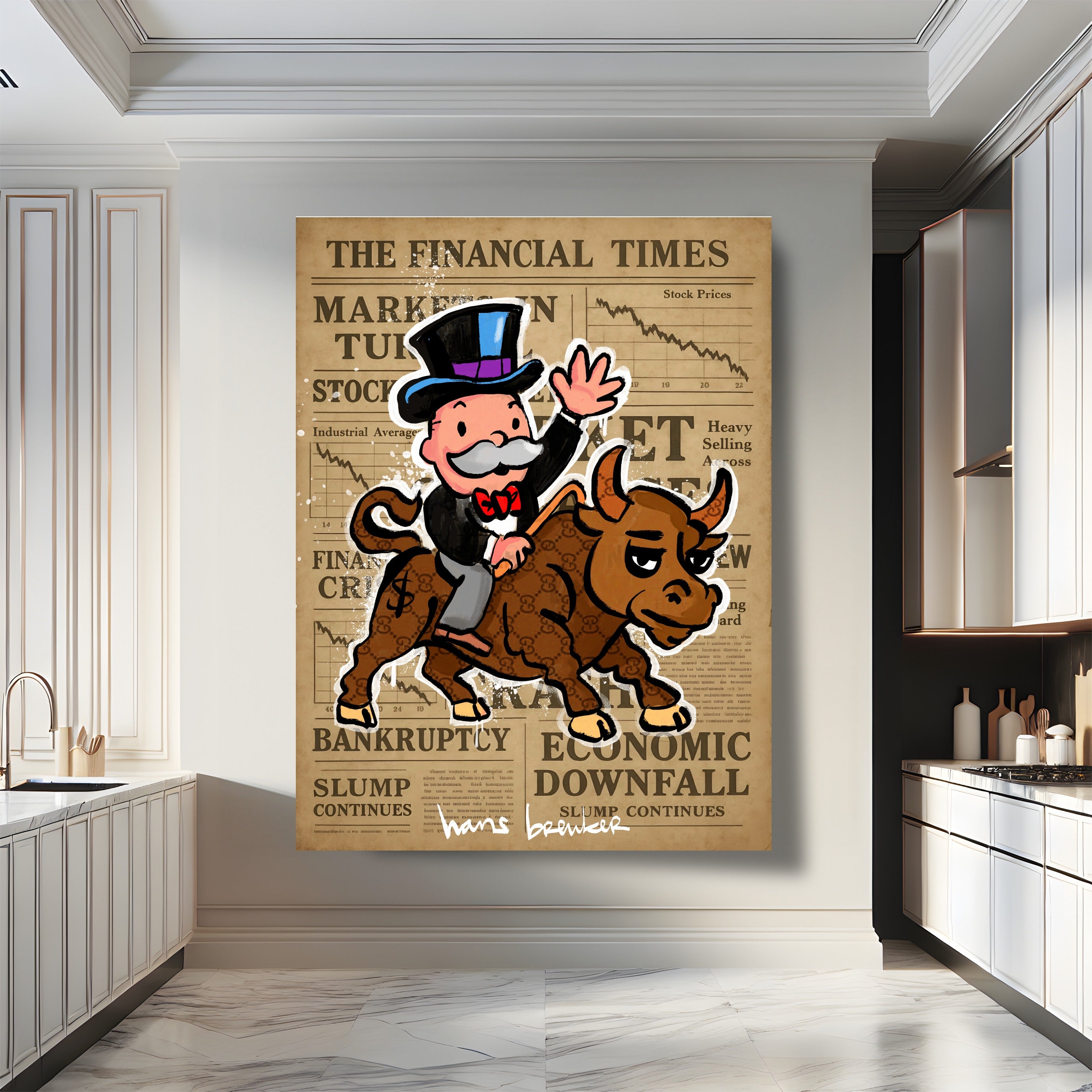 Beschrijving: Laat de kracht van de markt en de charme van succes je muur domineren met Bullmarket Mr Monops, een origineel kunstwerk van Hans Breuker. Geïnspireerd op de financiële wereld, Wall Street-energie en het bekende “bull market”-symbool, toont dit werk de charismatische Mr Monops — een parodische knipoog naar de klassieke Monopoly-miljonair — die triomfantelijk de stier berijdt.