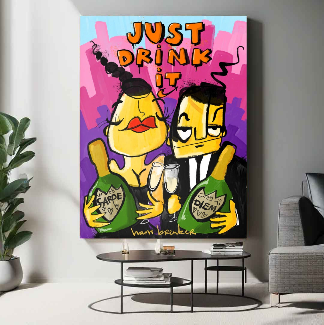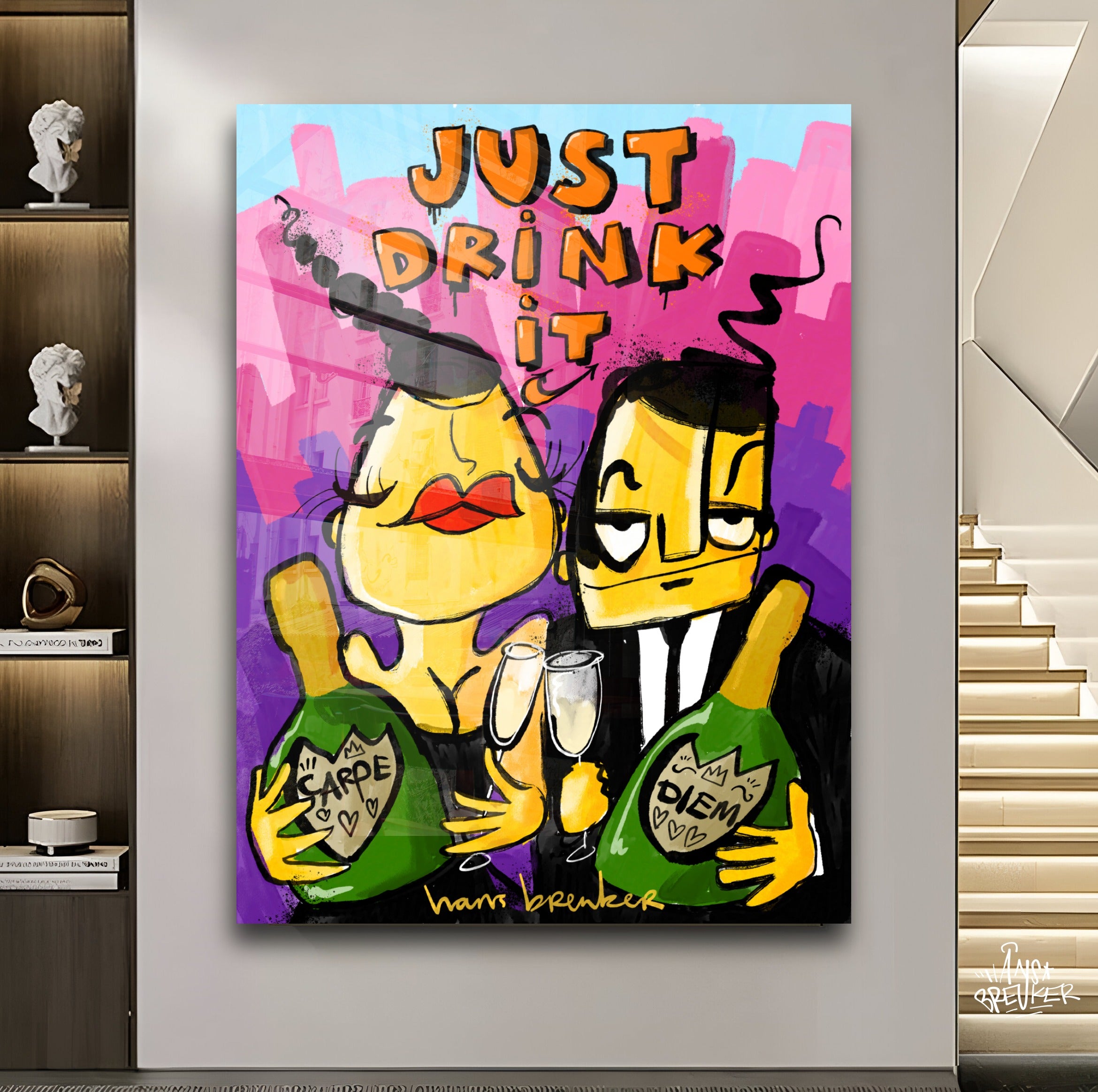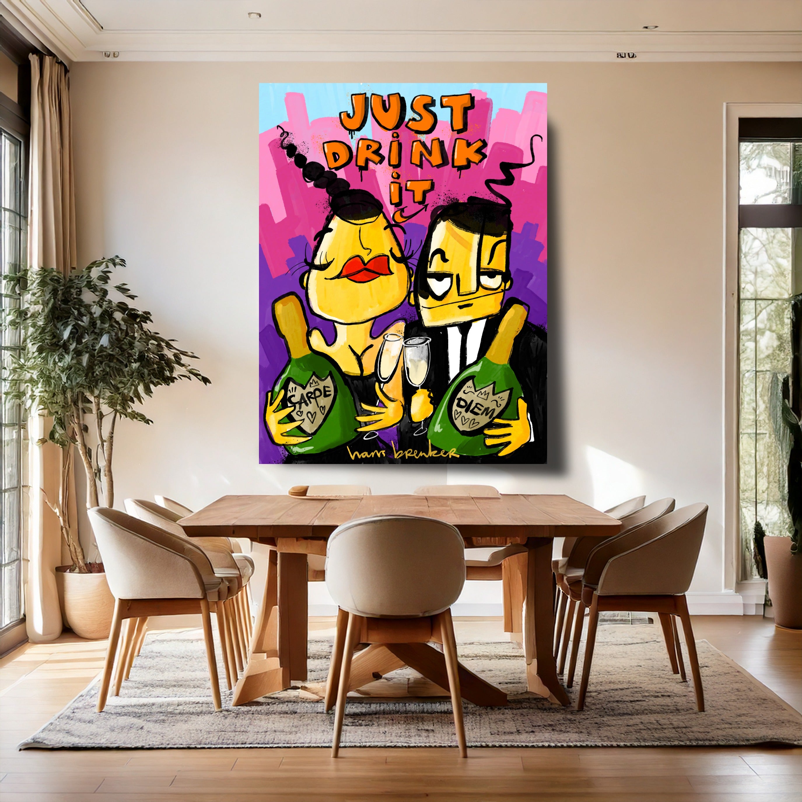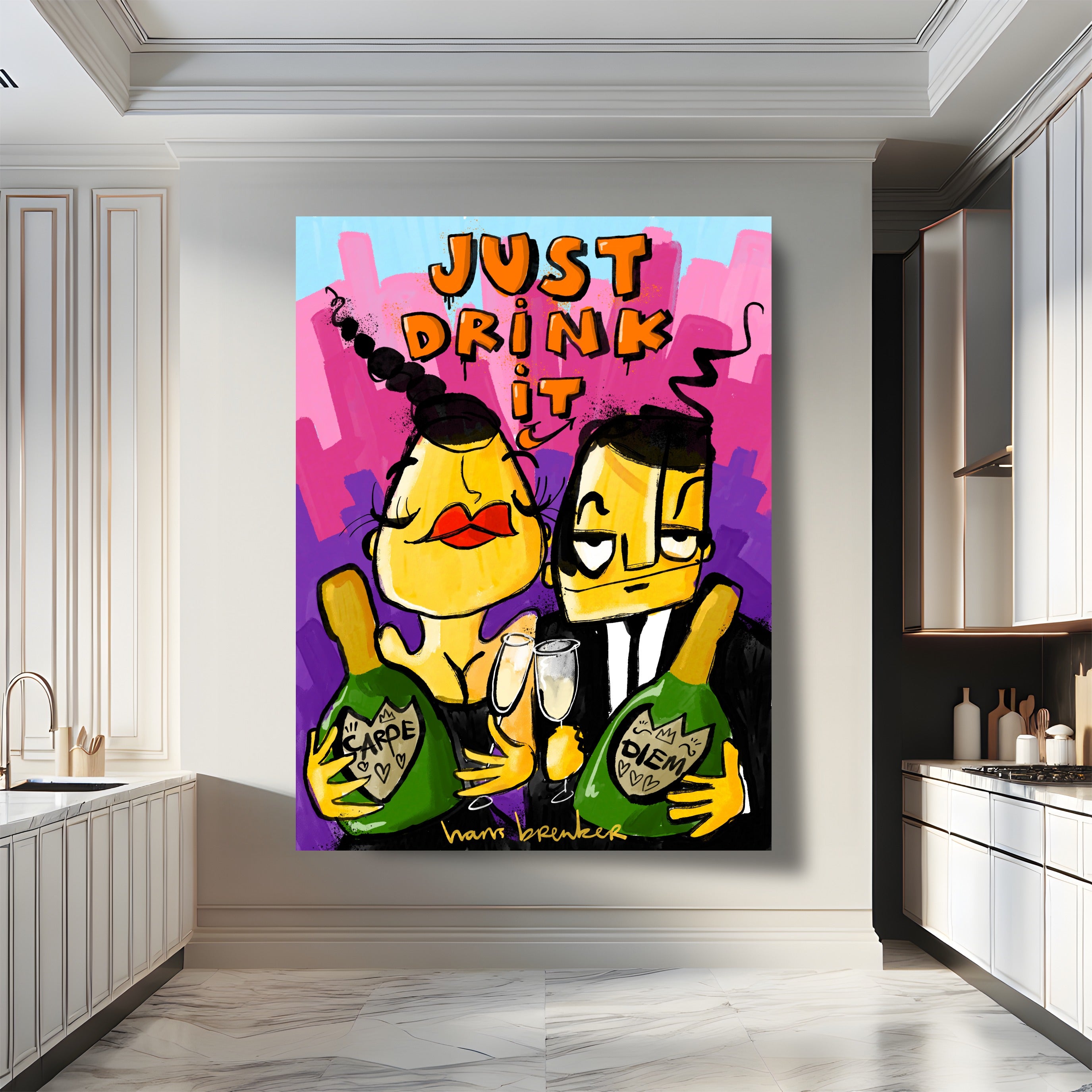 Just Drink It. is een speels en zelfverzekerd artwork dat een glimlach oproept bij iedereen die het leven graag viert — mét discipline, maar zonder dwang. Een duidelijke knipoog naar de moderne obsessie met een fit lijf, clean eating en altijd ‘on point’ zijn, terwijl het echte leven zich vaak gewoon afspeelt met een glas in de hand.