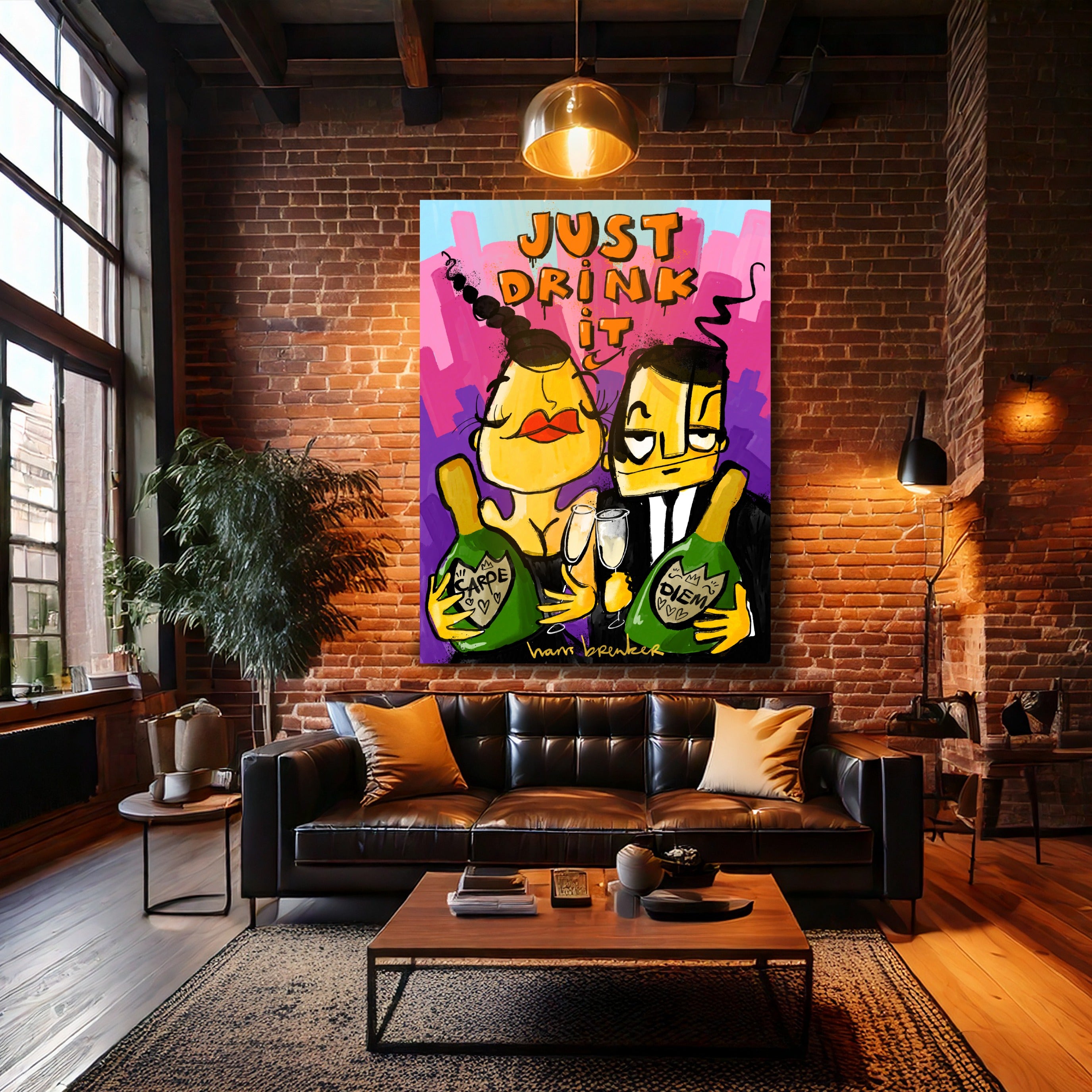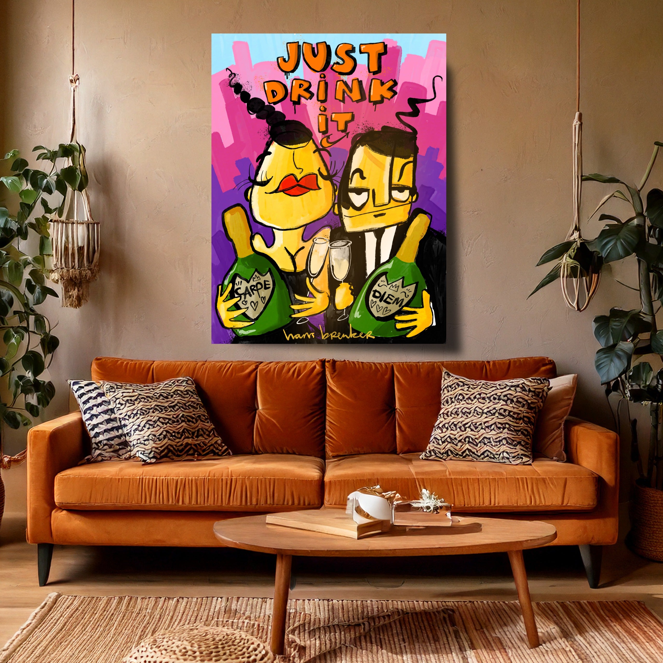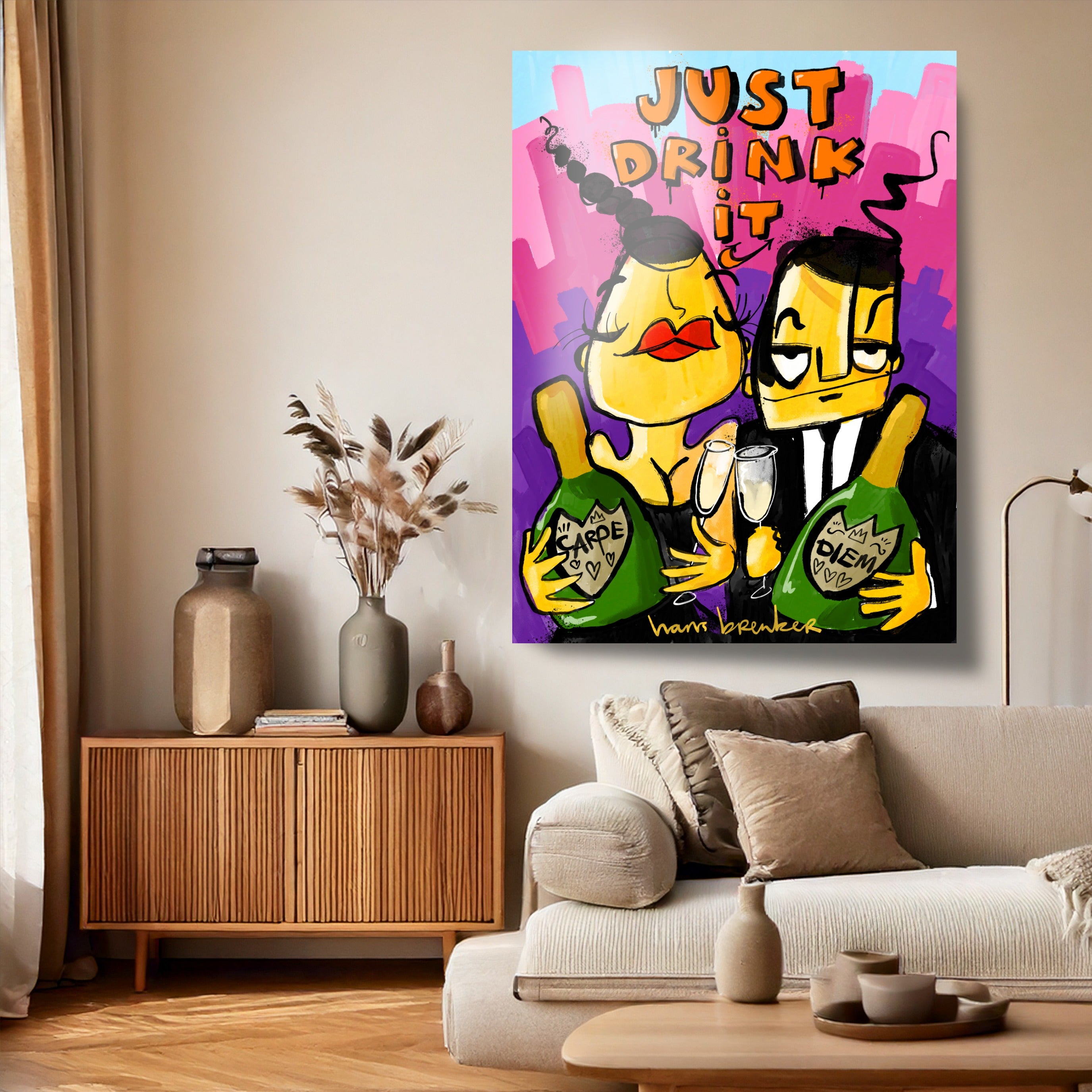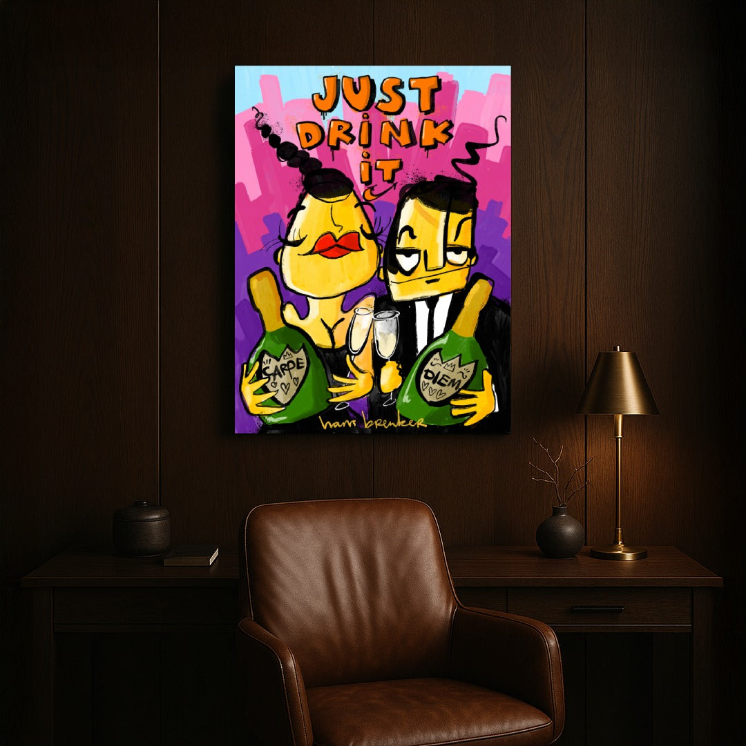 Just Drink It. is een speels en zelfverzekerd artwork dat een glimlach oproept bij iedereen die het leven graag viert — mét discipline, maar zonder dwang. Een duidelijke knipoog naar de moderne obsessie met een fit lijf, clean eating en altijd ‘on point’ zijn, terwijl het echte leven zich vaak gewoon afspeelt met een glas in de hand.