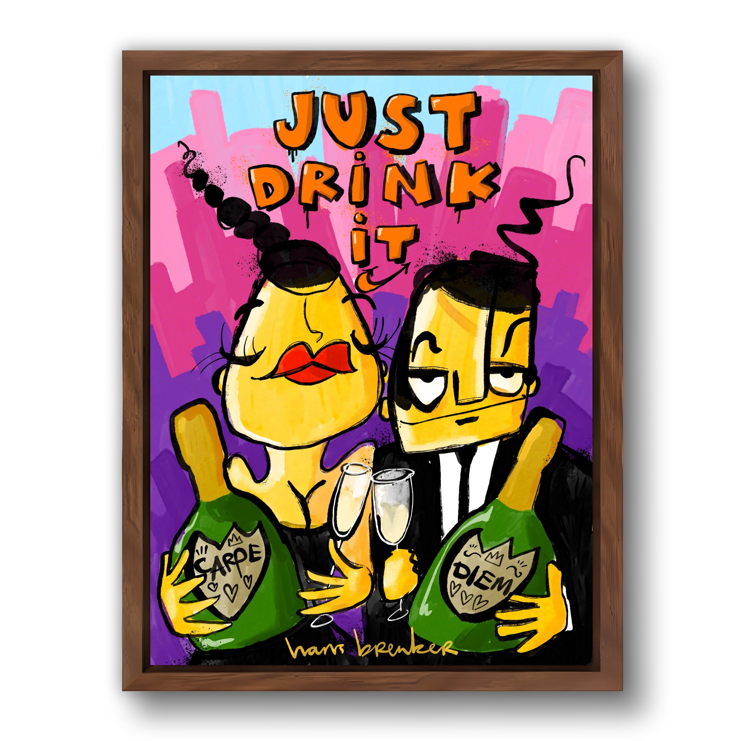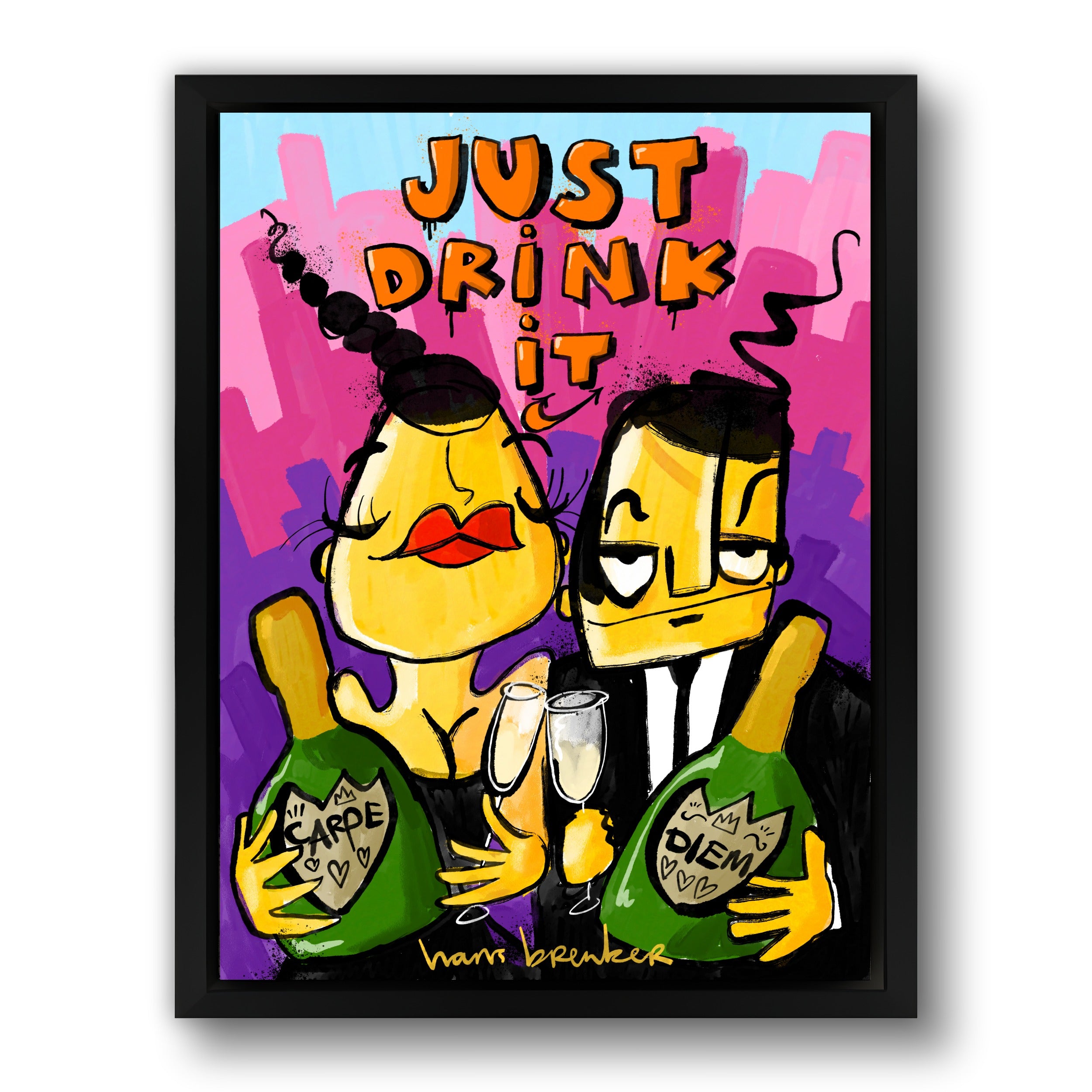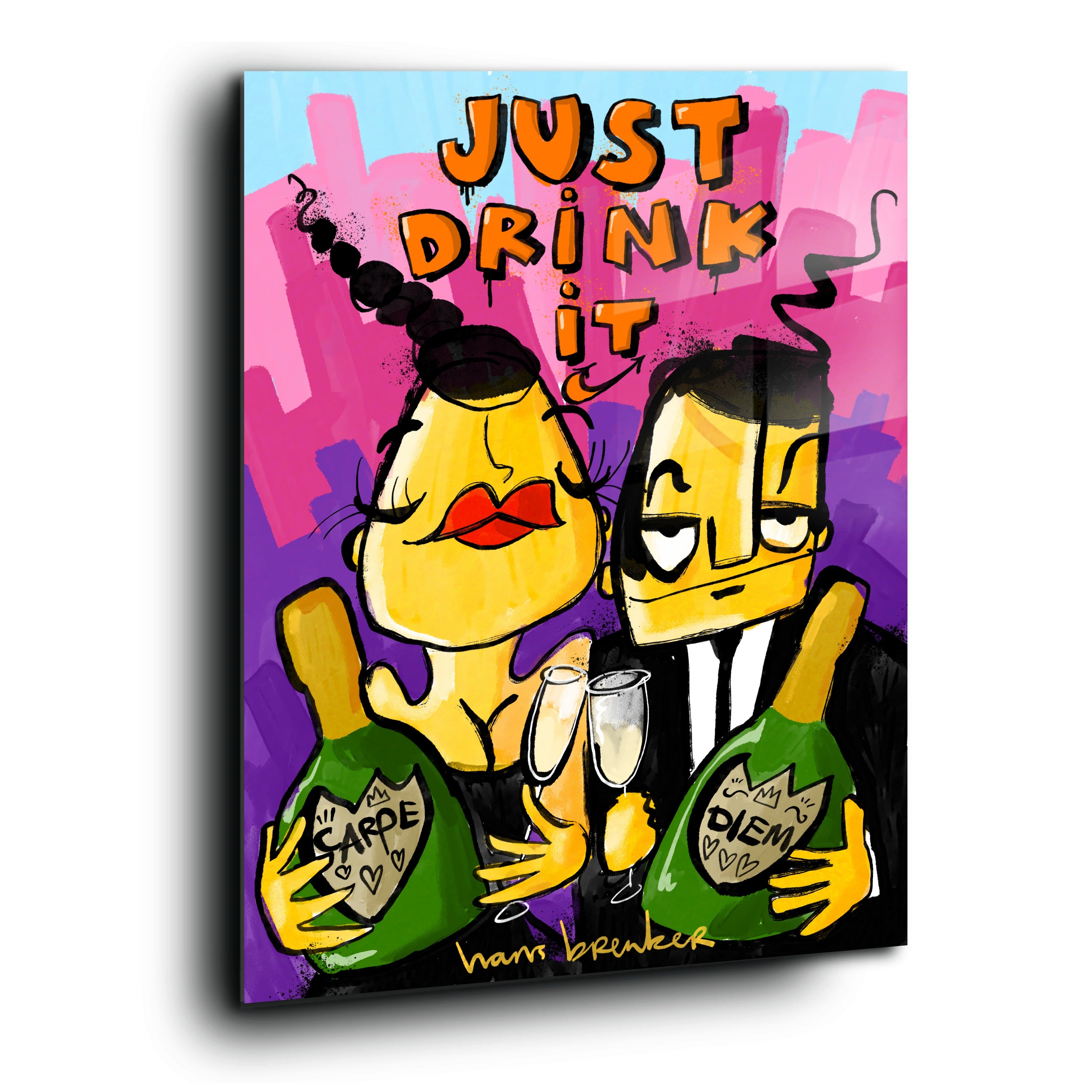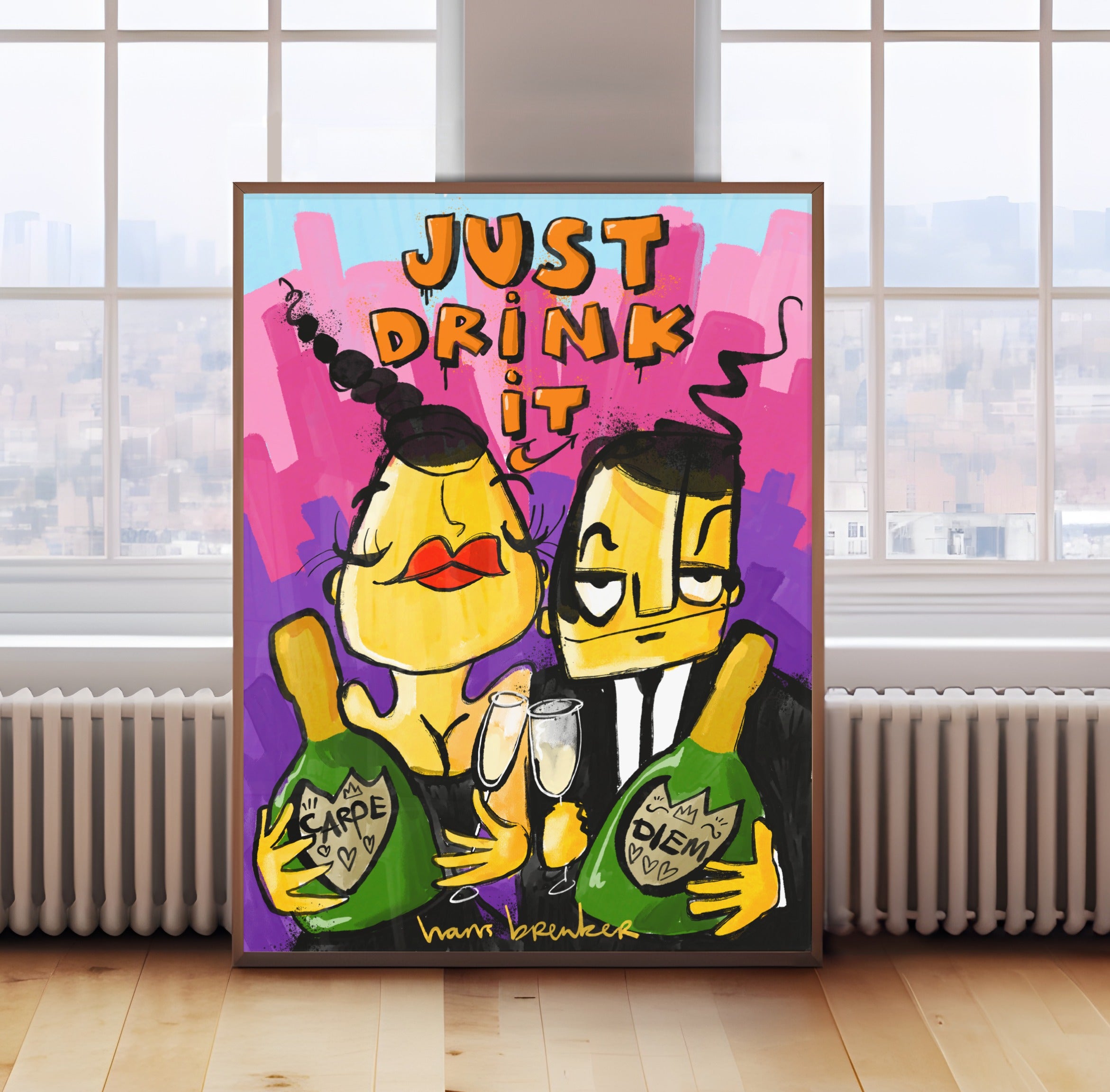Just Drink It. is een speels en zelfverzekerd artwork dat een glimlach oproept bij iedereen die het leven graag viert — mét discipline, maar zonder dwang. Een duidelijke knipoog naar de moderne obsessie met een fit lijf, clean eating en altijd ‘on point’ zijn, terwijl het echte leven zich vaak gewoon afspeelt met een glas in de hand.
