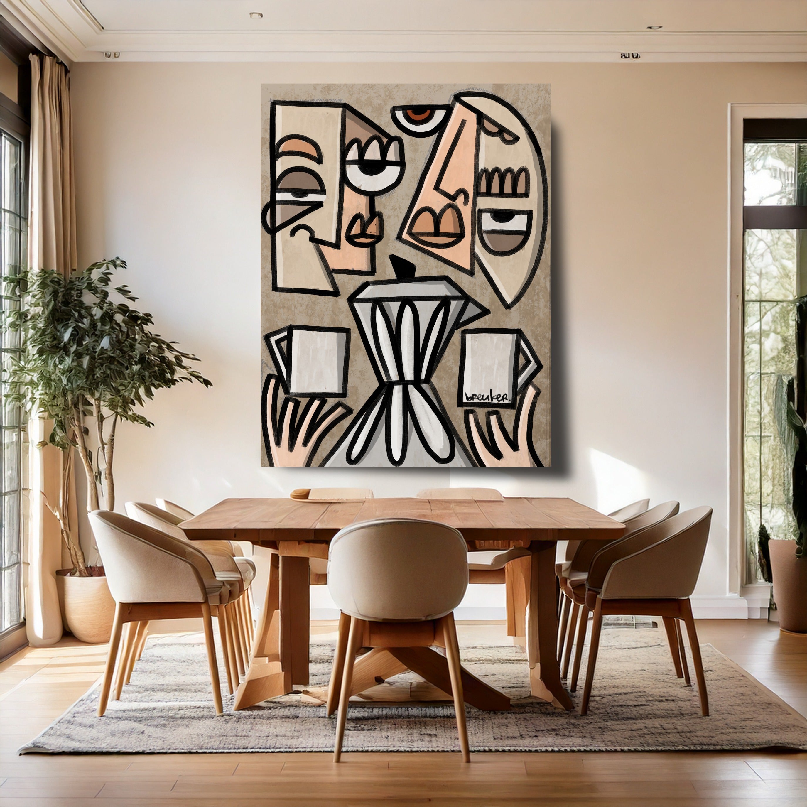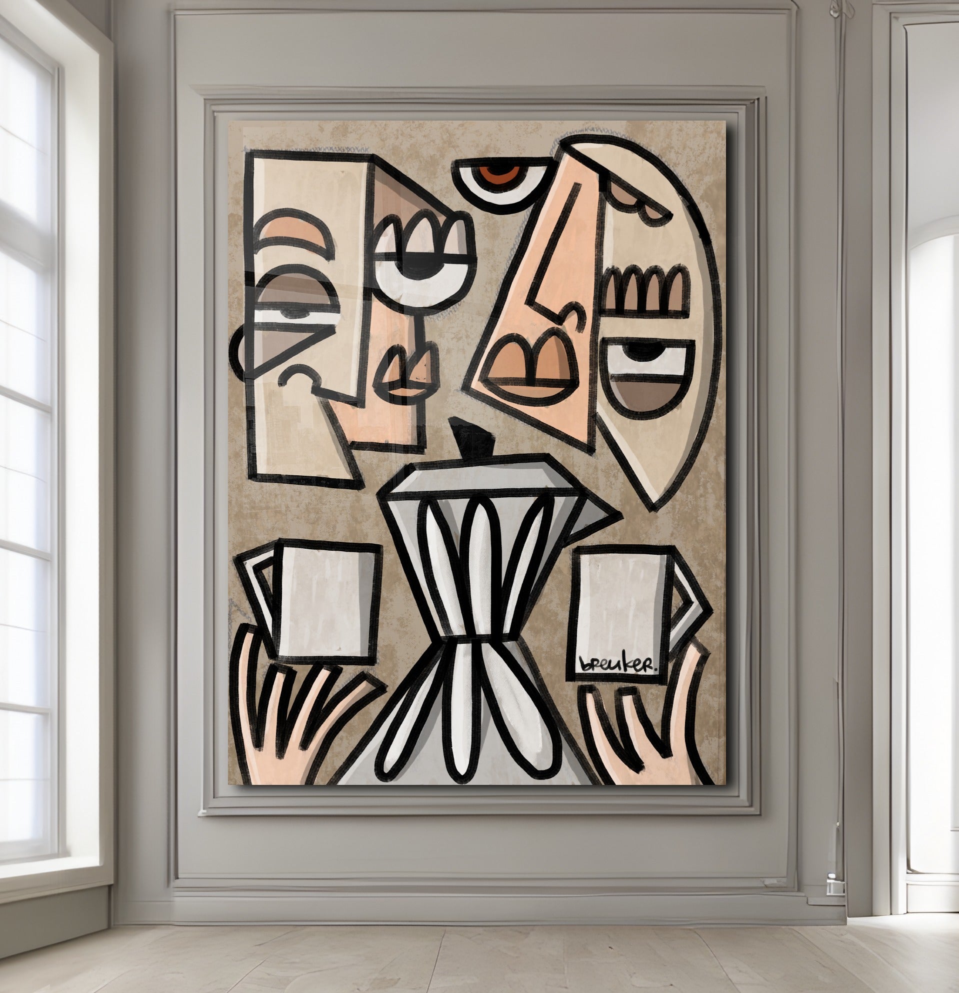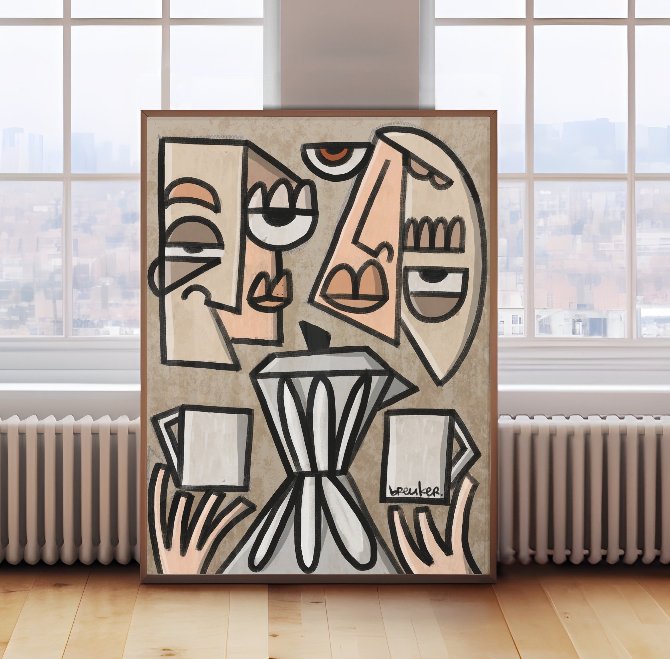 De herkenbare stijl van Breuker – sterke lijnen, expressieve figuren en een moderne pop-art benadering – maakt dit werk een opvallend statement in elk interieur.