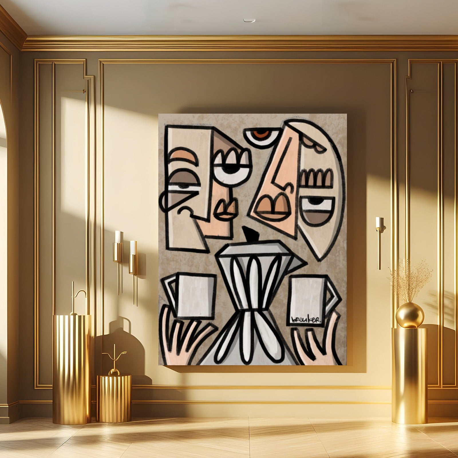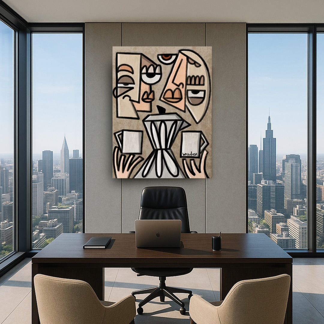 Lovers Afternoon Coffee van Hans Breuker is een modern figuratief kunstwerk waarin koffie, ontmoeting en dagelijkse luxe samenkomen. Twee karaktervolle gezichten kijken uit over een klassieke koffiemaker, terwijl in hun handen verse kopjes koffie klaarstaan. Het moment voelt rustig, bijna ceremonieel – een ode aan het dagelijkse koffieritueel.