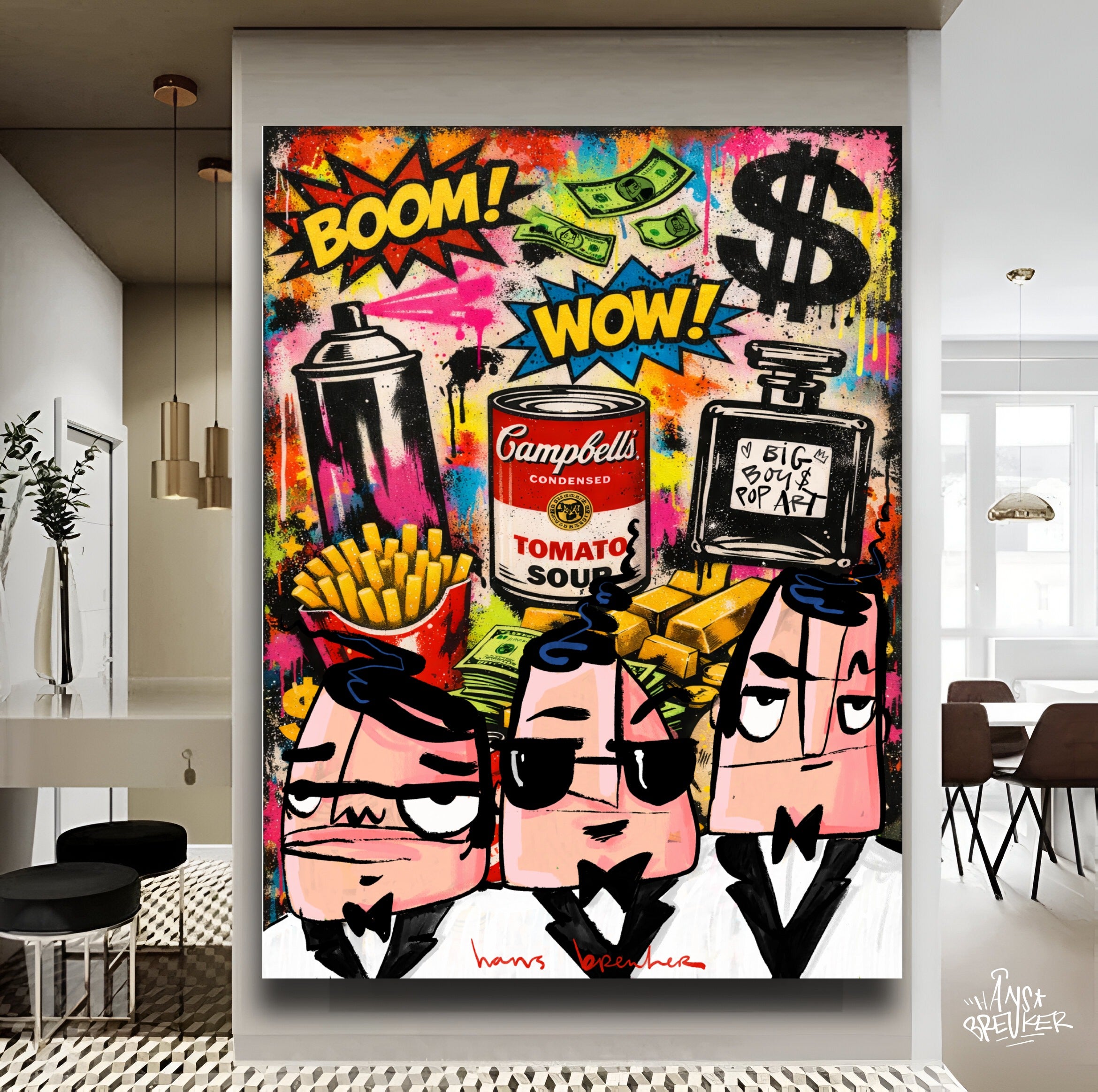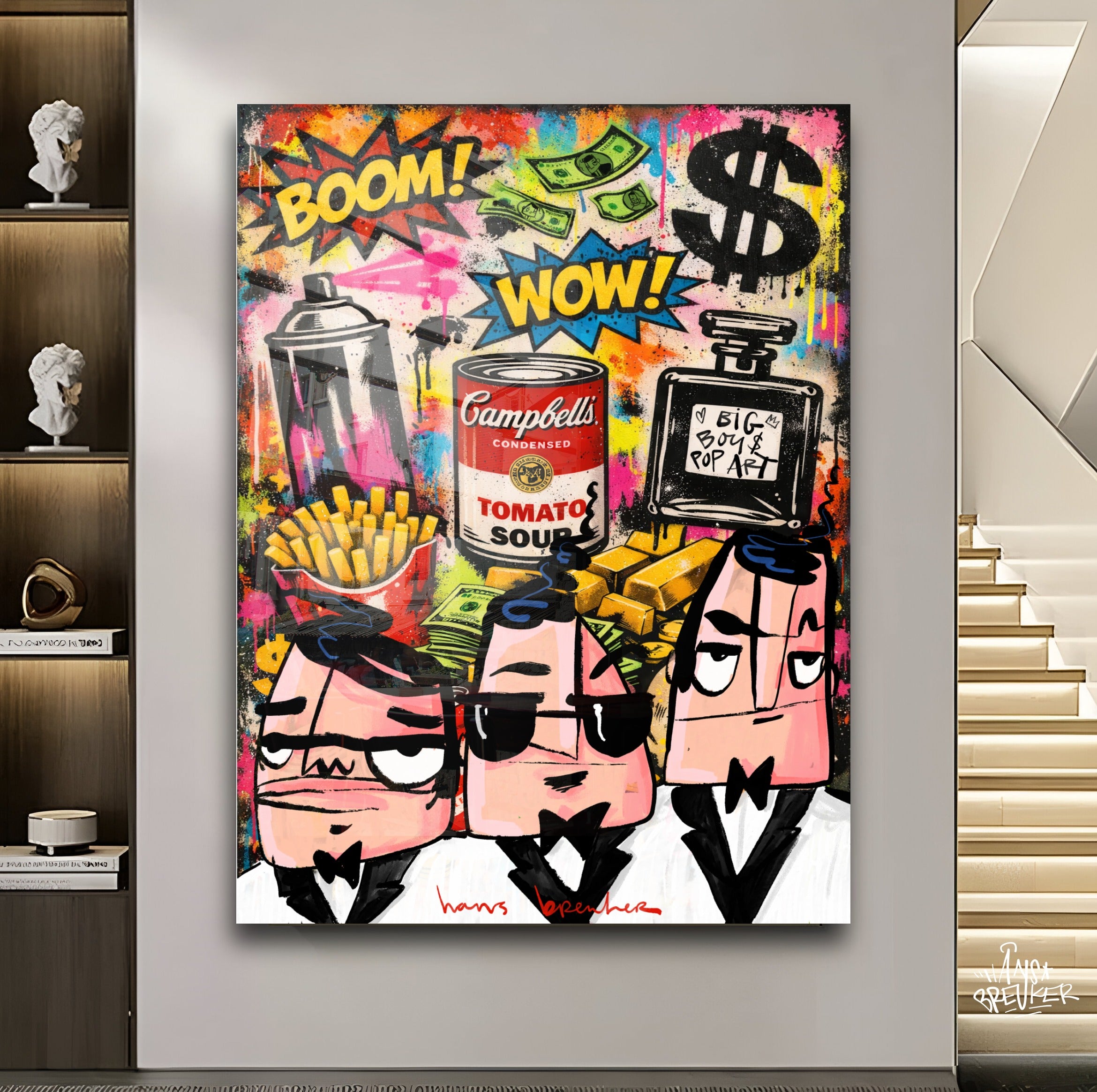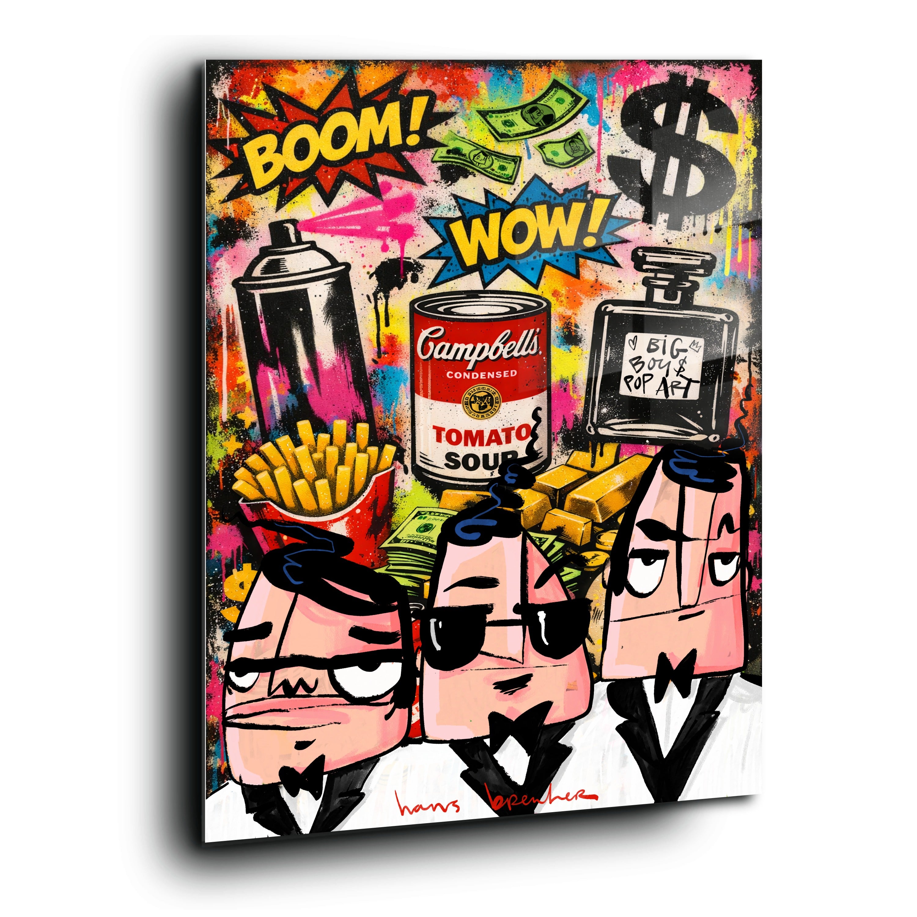 In dit explosieve kunstwerk brengt Hans Breuker de energie van de grote stad samen met iconische pop art-symbolen. Spraycans, dollar signs, goudstaven, fastfood, parfum en een knipoog naar klassieke soup art vormen het decor. BOOM. WOW. Kleur, lef en geldstromen vliegen je om de oren.