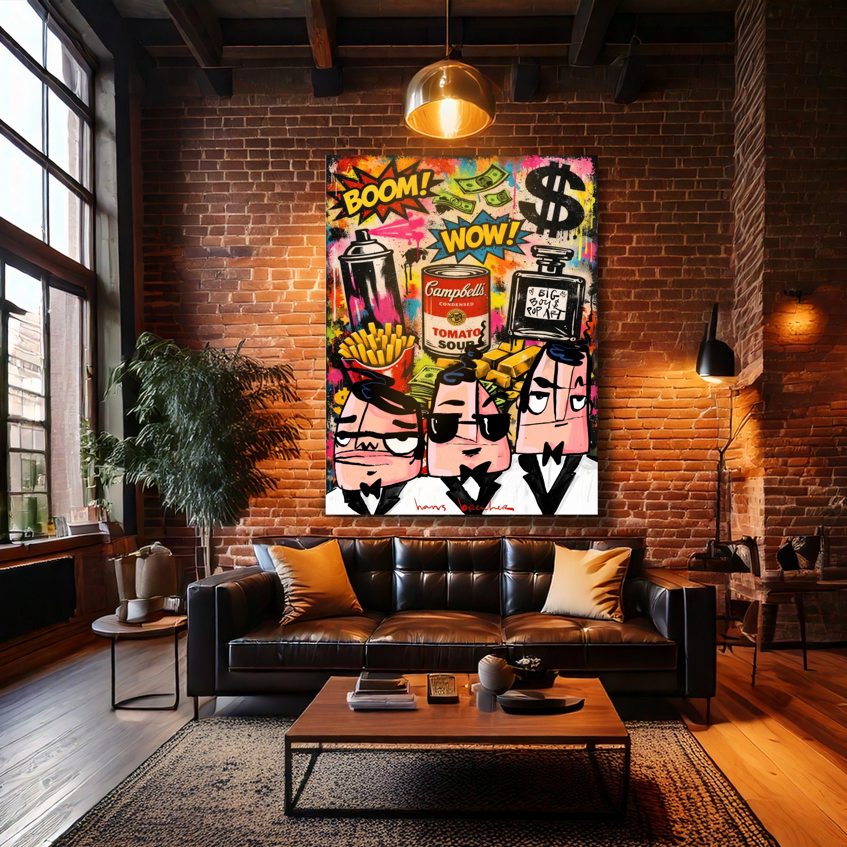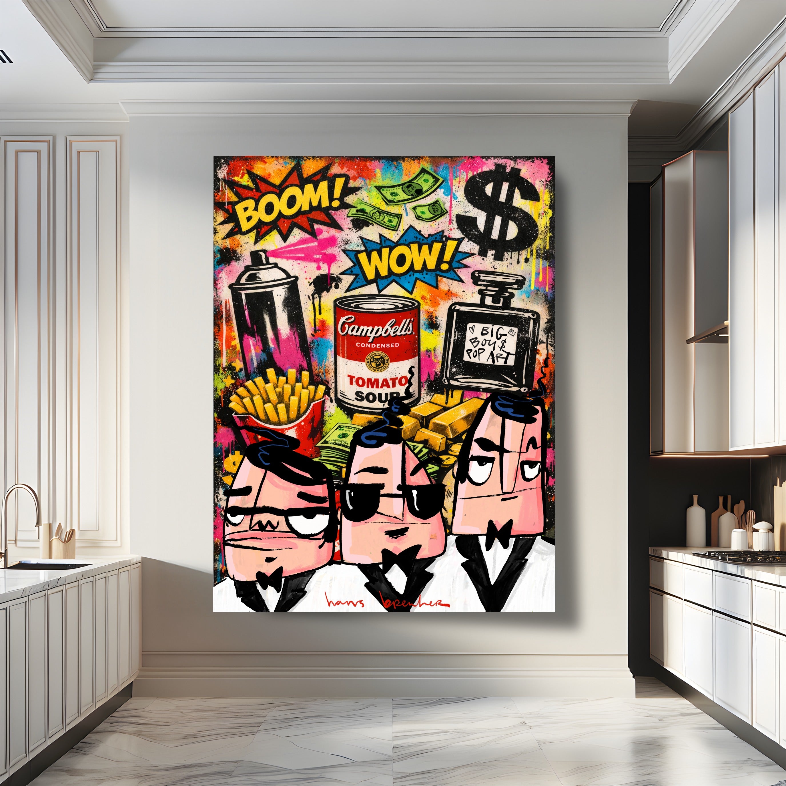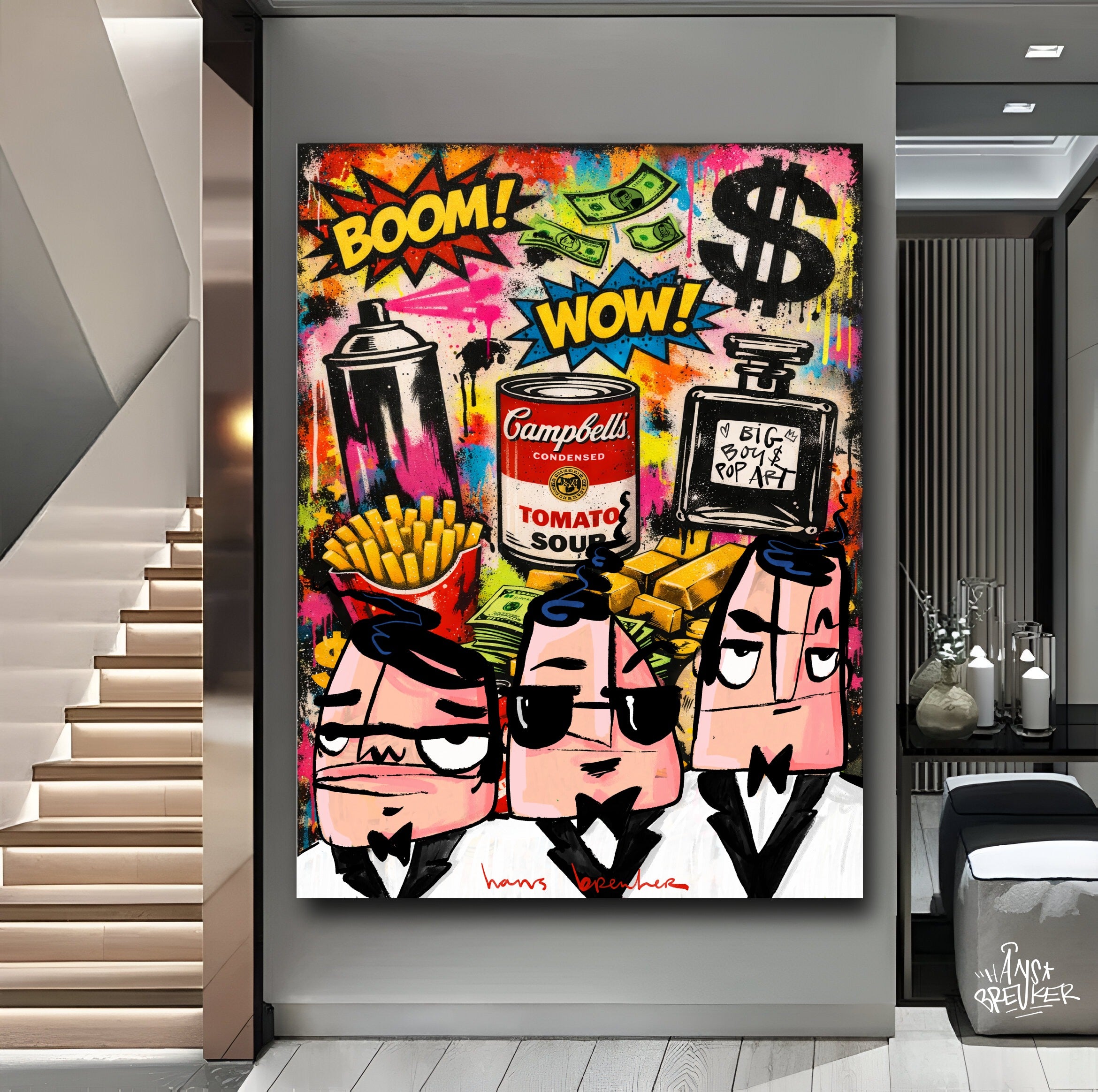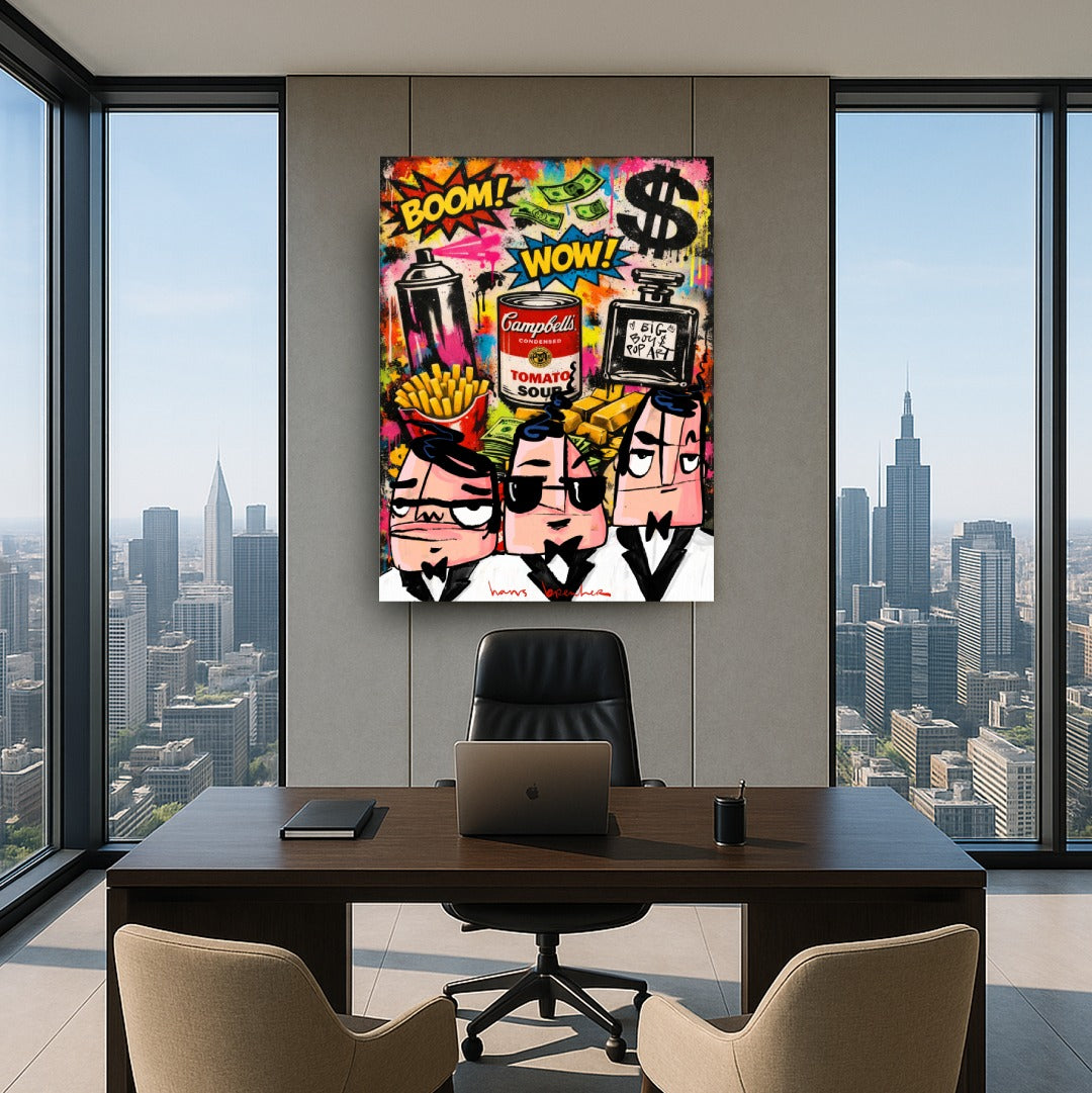 In dit explosieve kunstwerk brengt Hans Breuker de energie van de grote stad samen met iconische pop art-symbolen. Spraycans, dollar signs, goudstaven, fastfood, parfum en een knipoog naar klassieke soup art vormen het decor. BOOM. WOW. Kleur, lef en geldstromen vliegen je om de oren.